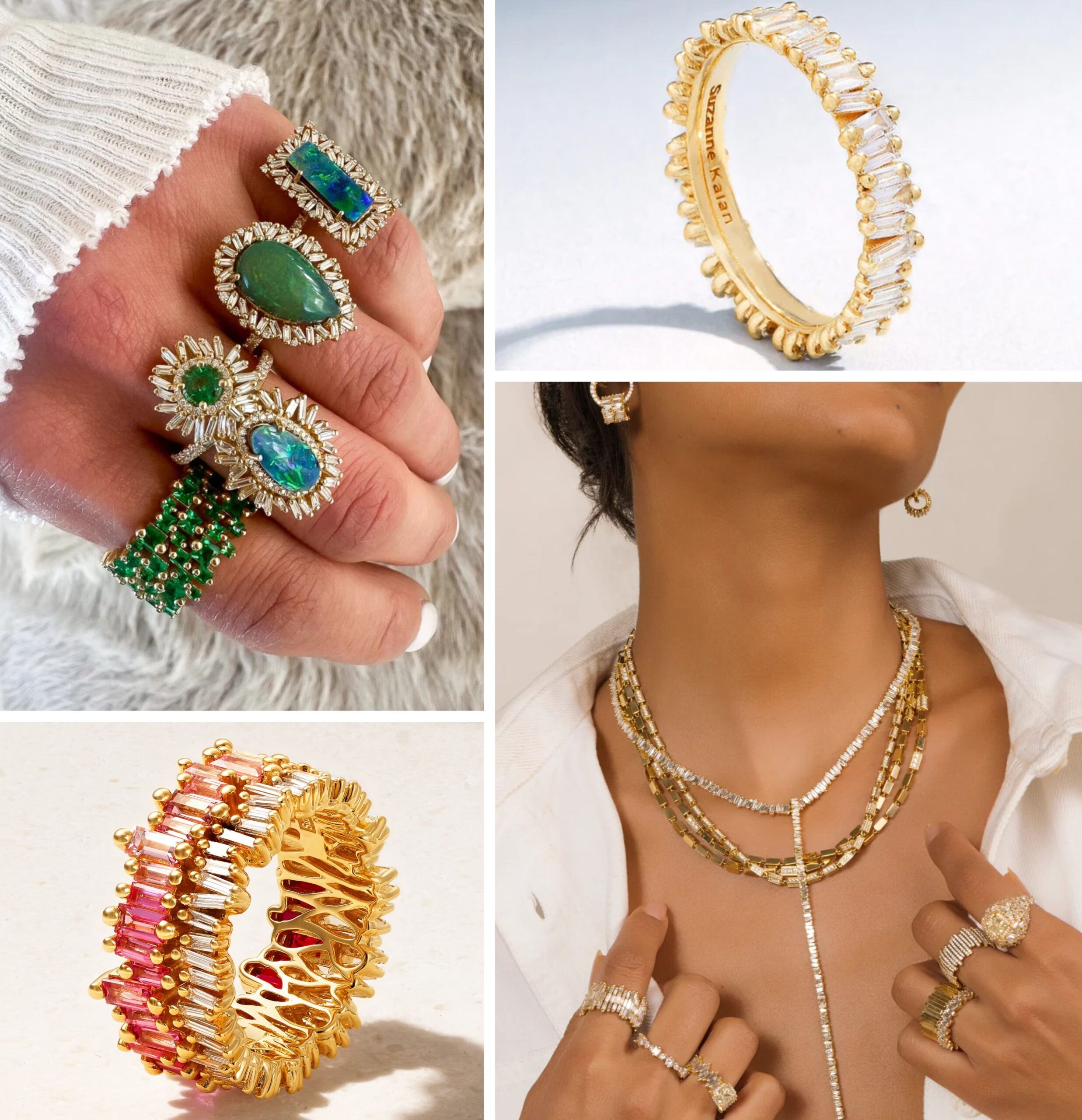 Từng làm quen với baguette từ những năm 1980 trước khi sáng lập thương hiệu riêng, Suzanne Kalan đã tái định nghĩa hoàn toàn khái niệm này. Bà biến những viên kim cương baguette vốn được xem là chi tiết phụ thành ngôi sao của riêng mình, tạo nên dấu ấn bằng những thiết kế vòng cổ và nhẫn nạm đá màu như opal hay ngọc lục bảo, rực rỡ nhưng vẫn giữ được nét tự nhiên phóng khoáng. Theo thời gian, baguette trở thành biểu tượng gắn liền với tên tuổi của Kalan – biểu tượng của sự bất quy tắc đầy duyên dáng.