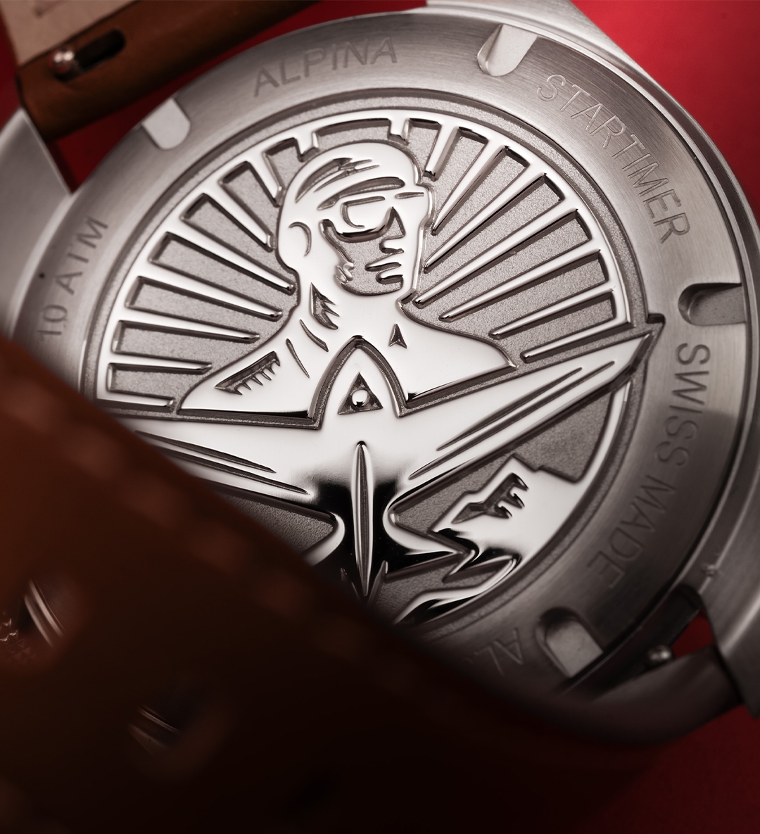 Bên trong, Alpina lựa chọn hợp tác với La Joux-Perret – tên tuổi uy tín trong ngành chế tác Thụy Sỹ – để trang bị cho Startimer bộ máy tự động có khả năng trữ cót lên đến 68 giờ. Đây không chỉ là nâng cấp về hiệu năng mà còn là lời khẳng định về độ tin cậy, yếu tố cốt lõi trong DNA hàng không của thương hiệu. Mặt sau dập nổi họa tiết hàng không theo phong cách Art Deco, gợi nhớ thời kỳ vàng son khi Alpina đồng hành cùng những phi công tiên phong.