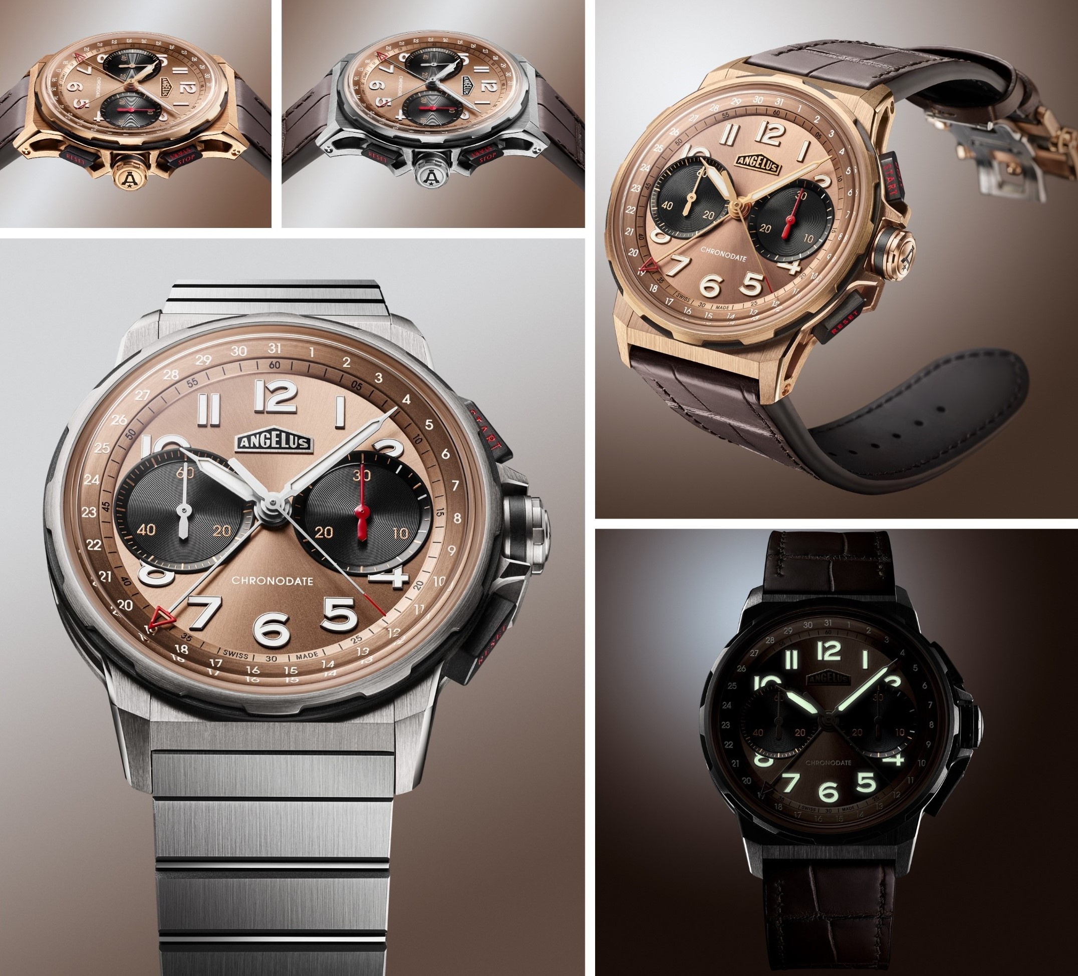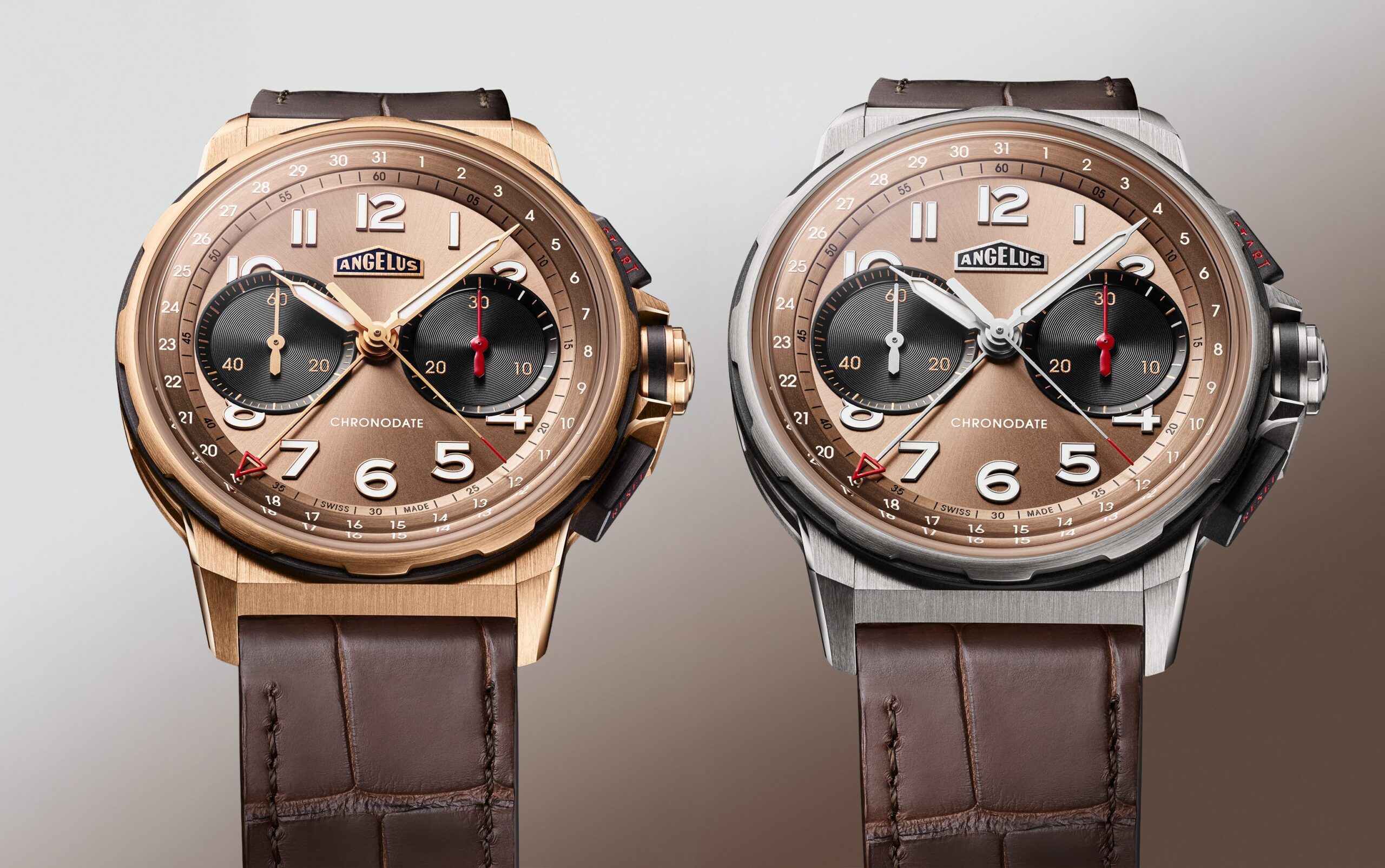 hronodate đánh dấu sự trở lại của Angelus với phong cách neo-retro, đồng thời phản ánh rõ bản sắc kép của thương hiệu. Kể từ khi tái xuất, bộ sưu tập được định hình như điểm gặp giữa di sản chế tác đồng hồ Thụy Sỹ cùng xu hướng phát triển các cấu trúc cơ học phức tạp hiện đại. Sự kết hợp này tạo nên nền tảng cho Chronodate, nơi yếu tố hoài niệm và tinh thần hiện đại cùng tồn tại trong một thiết kế thống nhất.Mặt số Chronodate Moka tiếp nối tinh thần lịch sử của Angelus với bố cục dễ đọc, gợi nhớ những mẫu chronograph của thập niên 1930 – giai đoạn thương hiệu từng là nhà sản xuất chronograph hàng đầu. Bộ đếm 30 phút vị trí 3 giờ và kim giây nhỏ vị trí 9 giờ có kích thước lớn, nổi bật trên nền mặt số nhờ tông đen kim loại cùng họa tiết xoắn ốc. Sắc độ chủ đạo – nâu mocha với ánh hổ phách – được hoàn thiện bằng hiệu ứng chải xước dạng tia nắng tinh xảo, làm nổi bật vòng phút bao quanh. Góp phần nâng cao hiệu ứng thị giác cho phông nền, bộ chữ số Ả Rập gắn nổi mạ vàng cùng bộ kim phủ chất phát quang, đảm bảo khả năng đọc rõ ràng. Đặc biệt, cơ chế hiển thị ngày dạng kim chạy quanh rìa mặt số gợi nhớ đến mẫu Chronodate nguyên bản ra mắt năm 1942, với kim ngày dạng mũi tên rỗng sơn đỏ.