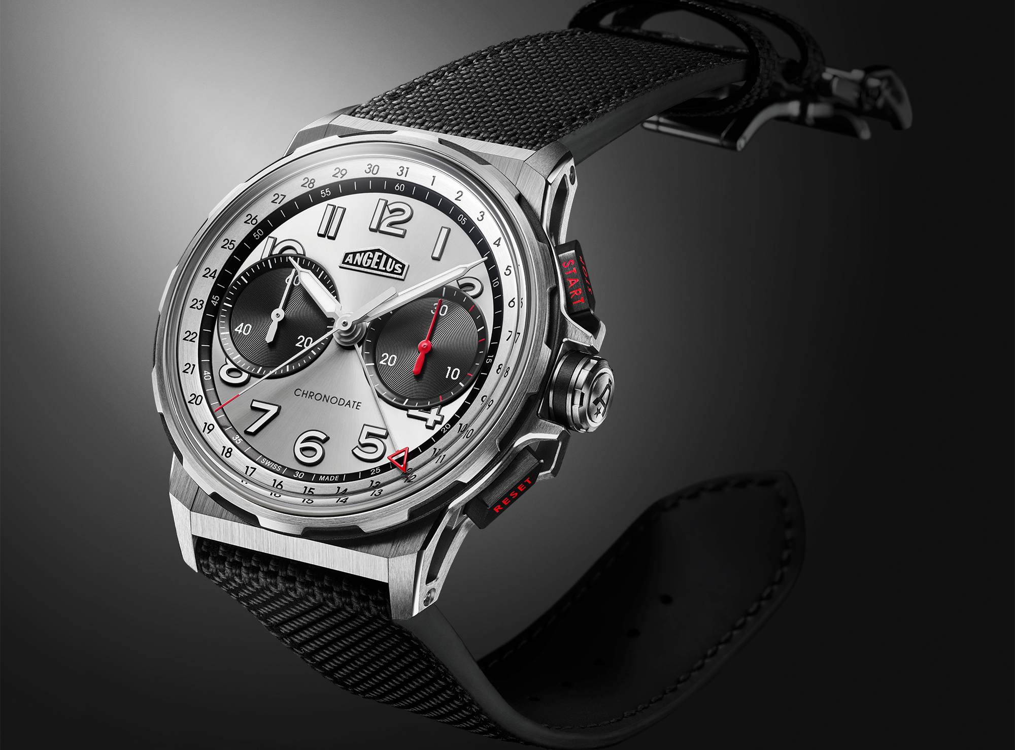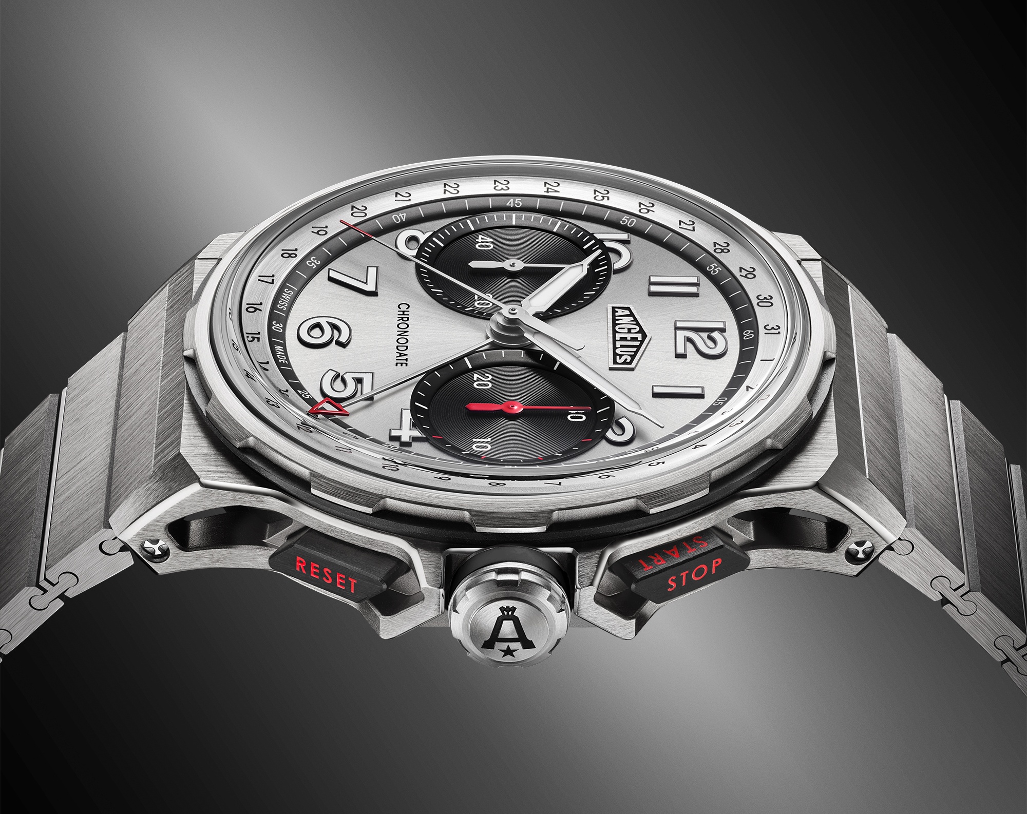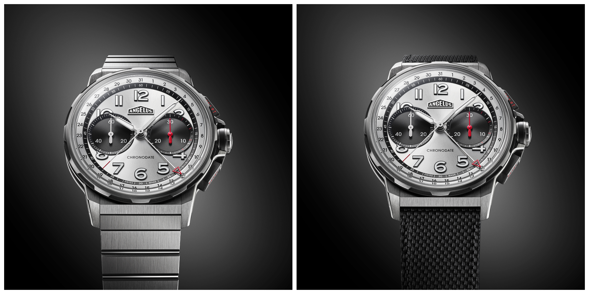 Angelus mang đến một phối màu hoàn toàn mới cho dòng Chronodate với mặt số sắc xám Magnetic Silver chải tia nắng thanh lịch, trưng bày hai bộ đếm chronograph kết hợp lịch ngoại vi độc đáo. Ghi điểm bằng phong cách thể thao rắn rỏi, chiếc đồng hồ titan 42,50mm yên vị trên cổ tay nhờ vòng đeo kim loại đồng chất liệu hoặc cao su bền bỉ.
