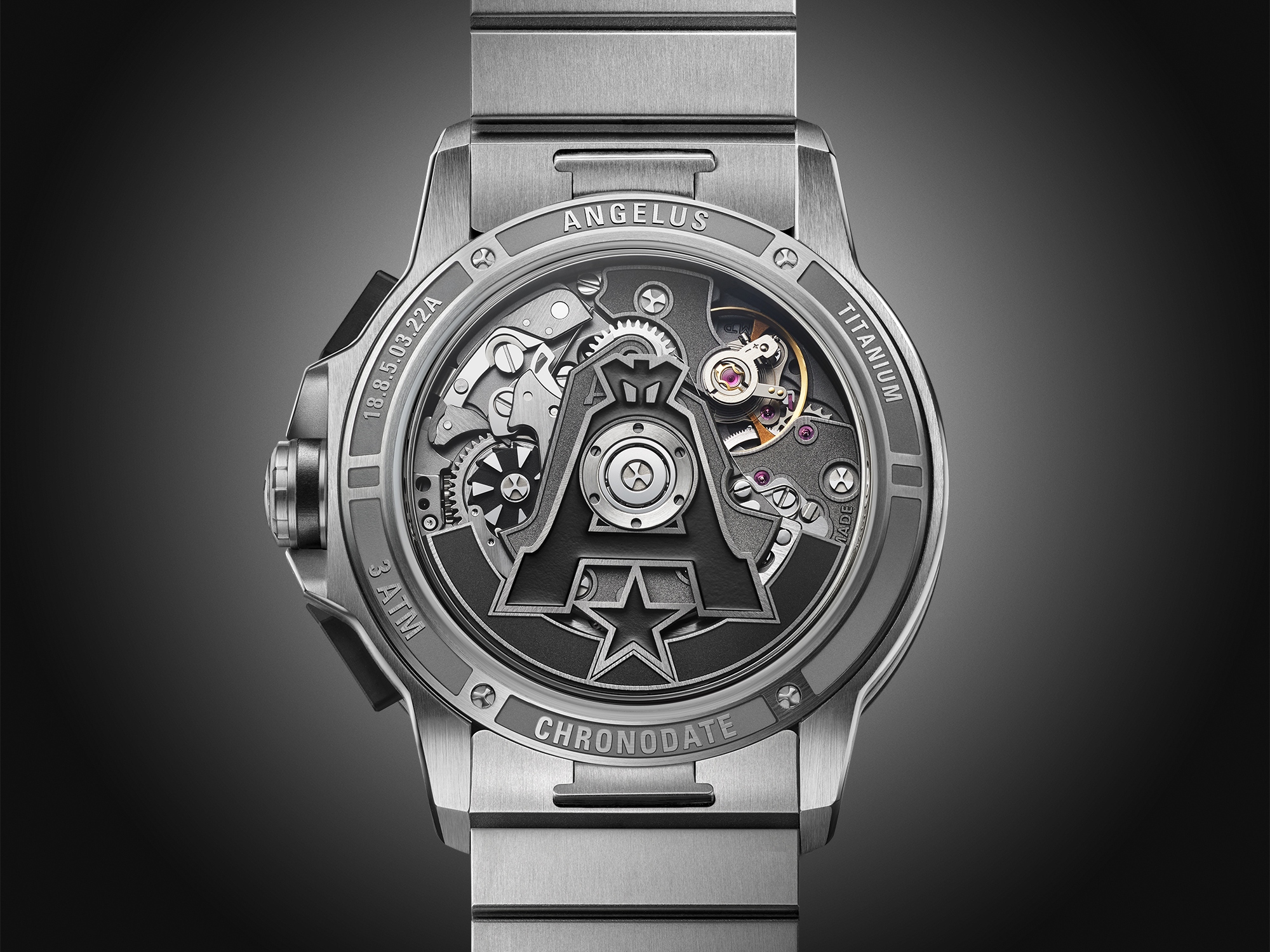 Chronodate Titanium Magnetic Silver Edition minh chứng cho khả năng kết hợp hài hòa giữa ngôn ngữ thiết kế đơn sắc hiện đại, kết cấu cơ học phức tạp cùng tinh thần di sản đậm chất Thụy Sỹ. Đều đặn từng nhịp đập dưới vỏ titanium, Angelus A-500, bộ máy tự động trữ 60 giờ năng lượng vận hành ở tần số 4 Hz và được trang bị cơ chế chronograph kích hoạt bằng bánh răng trụ. Hệ thống lên dây cót tự động hoạt động nhờ một quả lắc sở hữu thiết kế chữ “A” in hoa phía trên ngôi sao lấy cảm hứng từ kho lưu trữ. Xuất hiện ngay trung tâm bộ máy, chi tiết không đơn thuần mang tính nhận diện mà còn âm thầm gợi nhắc truyền thống chế tác chính xác kéo dài suốt gần một thế kỷ của Angelus.