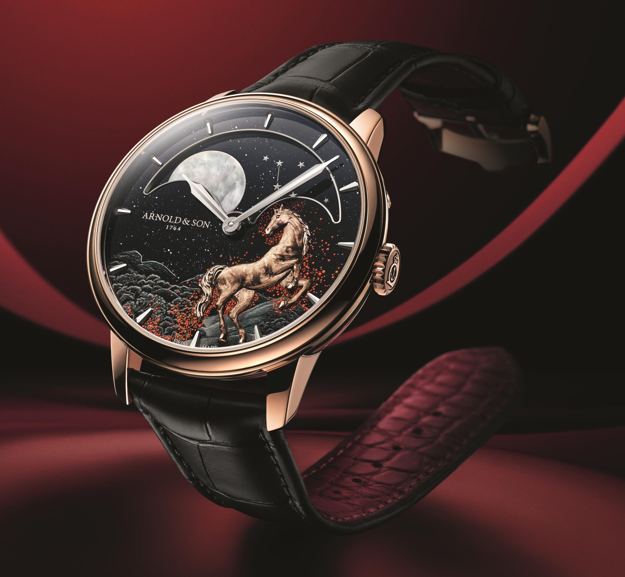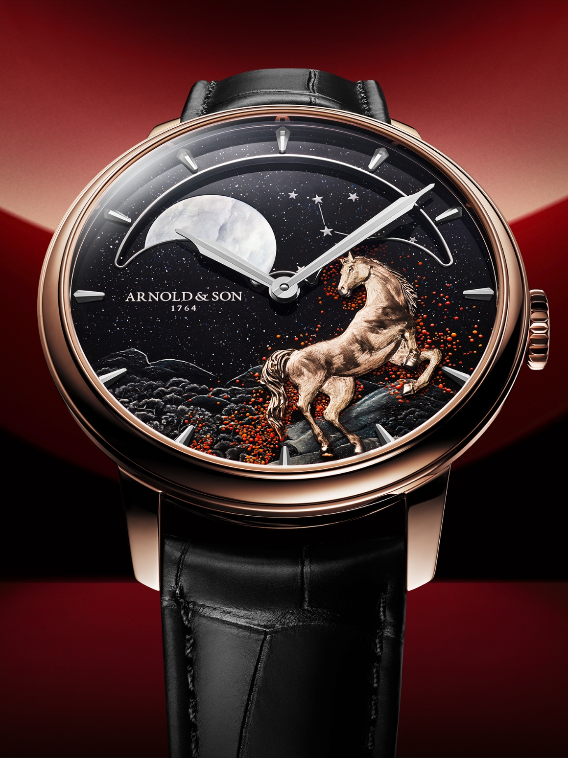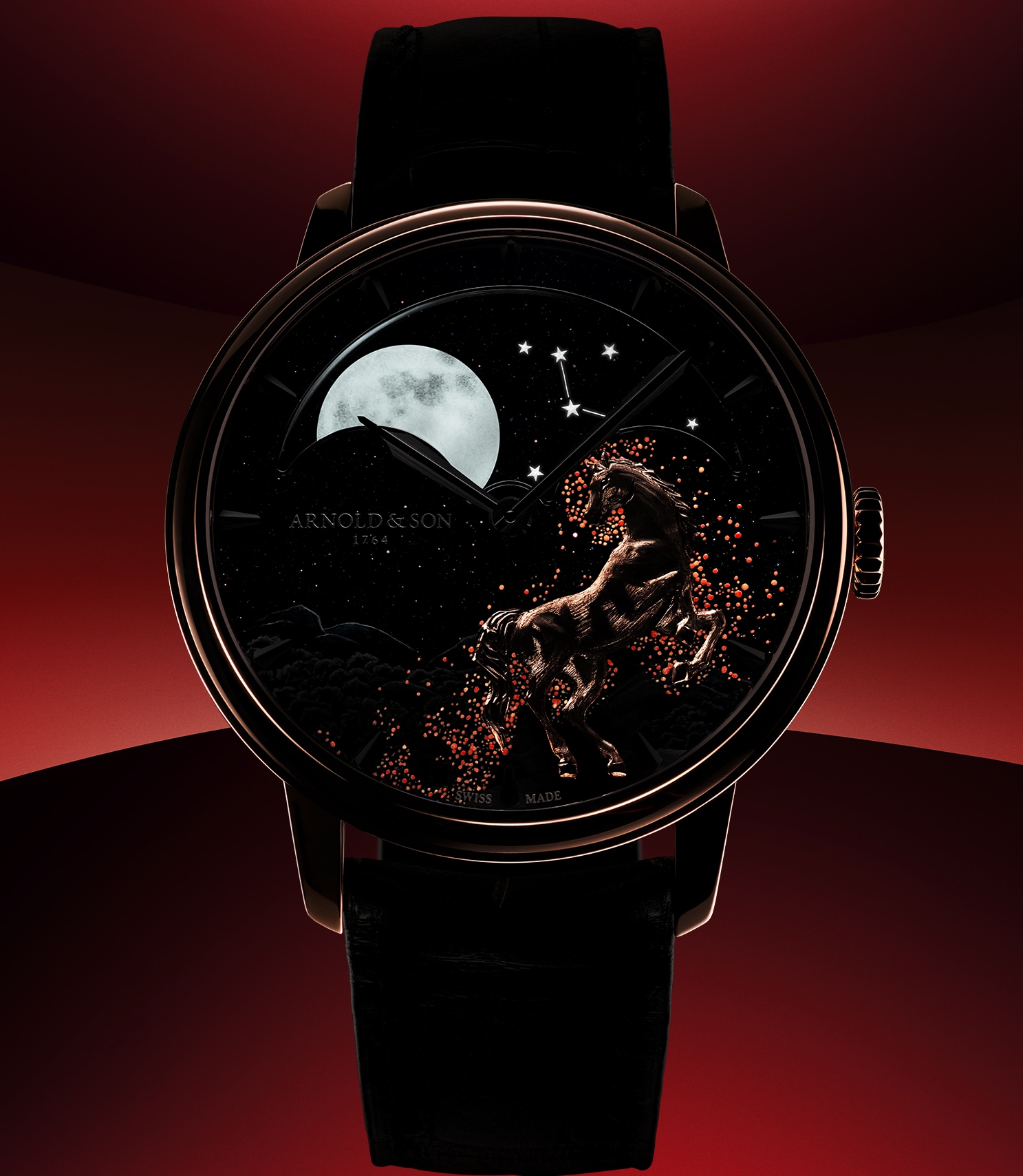 Huyền bí, hoang dã và rực rỡ, Perpetual Moon 41.5 Red Gold “Year of the Horse” tiếp nối tinh thần của bộ sưu tập gồm những sáng tạo Arnold & Son tôn vinh 12 con giáp theo văn hóa Trung Hoa. “Hỏa Mã, con giáp giàu năng lượng của năm Bính Ngọ 2026, kiêu hãnh xuất hiện trên mặt số Métiers d’Art ấn tượng mà thương hiệu Thụy Sỹ phú cho tuyệt phẩm vàng hồng giới hạn 8 chiếc.