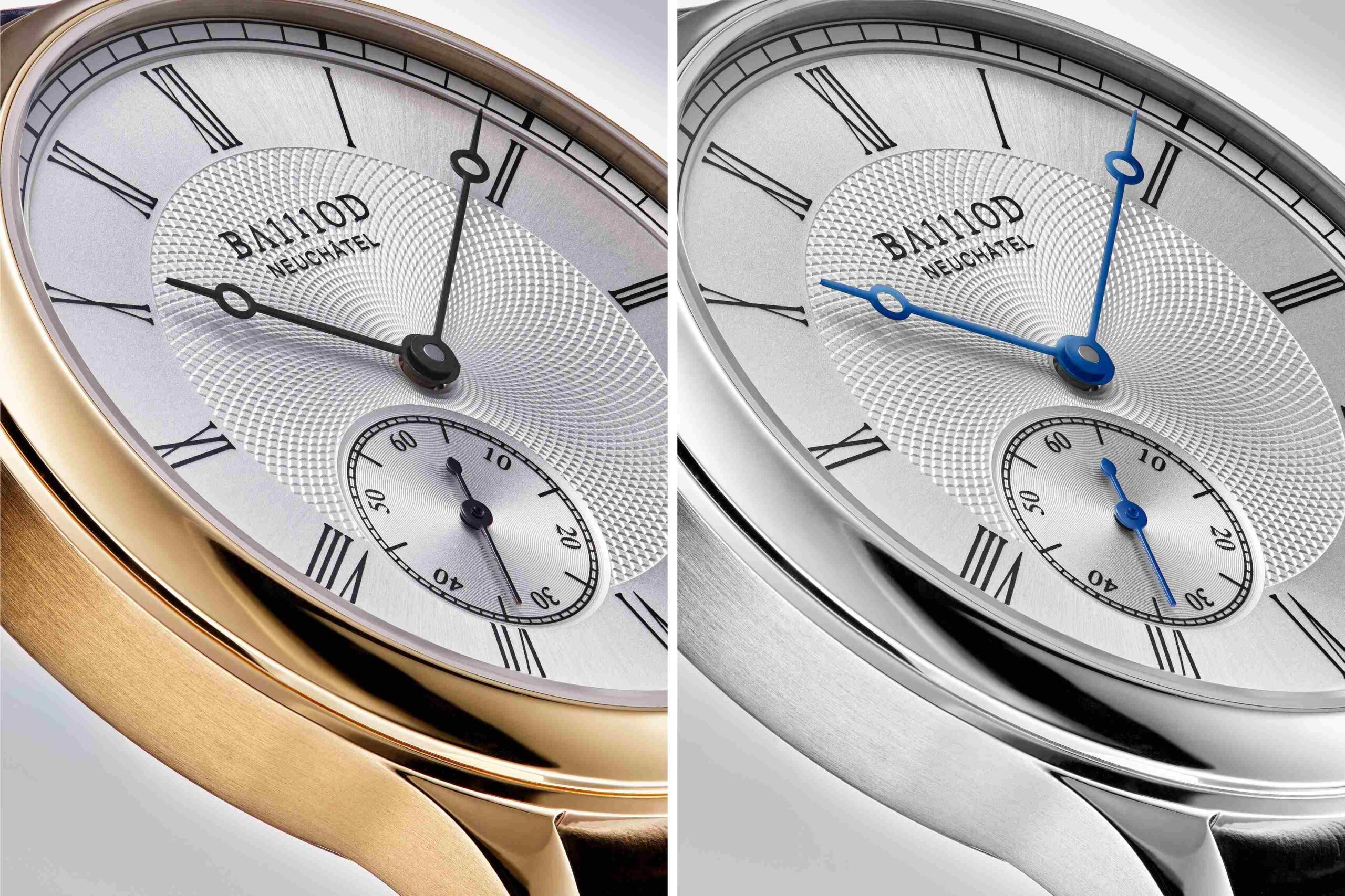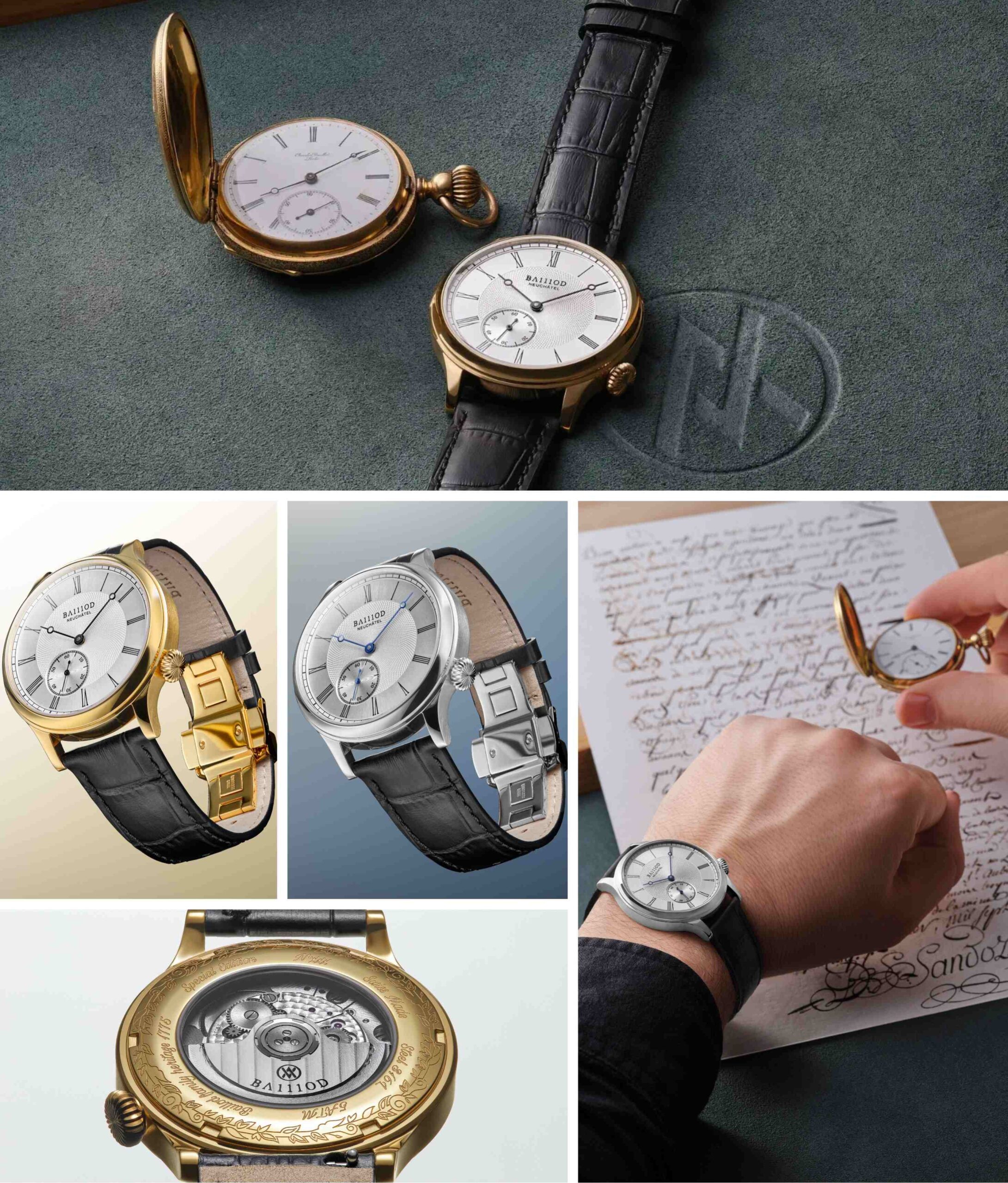 Mặt số với họa tiết guilloché gợi lại các đường khắc trang trí của mẫu đồng hồ lịch sử, kết hợp cùng chữ số La Mã và thang phút kiểu đường ray cổ điển. Bộ kim cân bằng giữa cảm hứng truyền thống cùng khả năng đọc giờ rõ ràng. Đặc biệt, bố cục kim giây nhỏ tại vị trí 7 giờ cùng núm vặn được tạo hình tinh tế gợi nhắc đến tính công thái học đặc trưng những chiếc đồng hồ bỏ túi thời kỳ trước. Phần vỏ sau khắc họa tiết riêng, khẳng định hai phiên bản này như một lời tri ân có chủ ý và mang tính biểu tượng trong dòng chảy lịch sử chế tác đồng hồ của gia tộc Baillod.