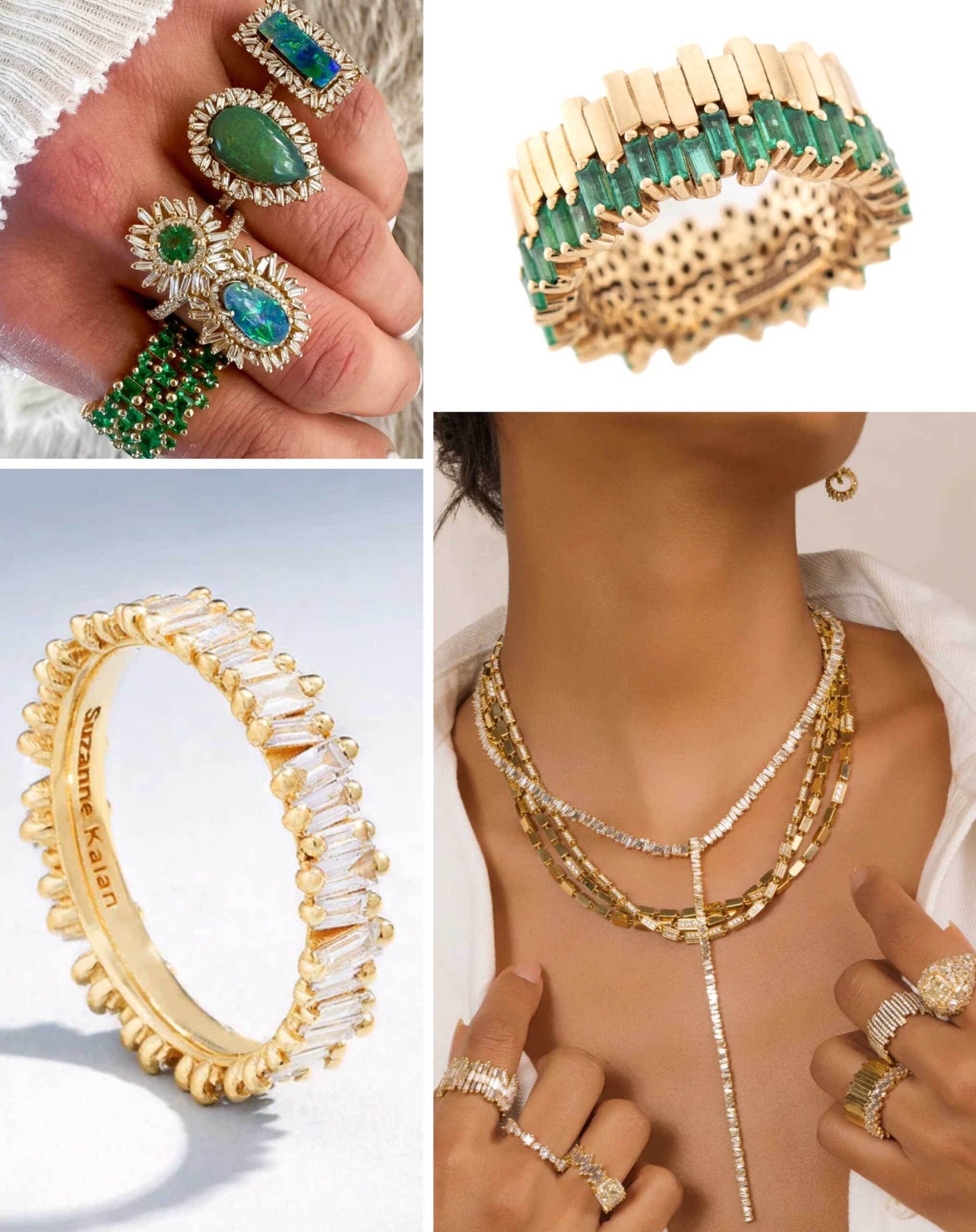 Từng làm quen với baguette từ những năm 1980 trước khi sáng lập thương hiệu riêng, Suzanne Kalan đã tái định nghĩa hoàn toàn khái niệm này. Bà biến những viên kim cương baguette vốn được xem là chi tiết phụ thành ngôi sao của riêng mình, tạo nên dấu ấn bằng những thiết kế vòng cổ và nhẫn nạm đá màu như opal hay ngọc lục bảo, rực rỡ nhưng vẫn giữ được nét tự nhiên phóng khoáng. Theo thời gian, baguette trở thành biểu tượng gắn liền với tên tuổi của Kalan – biểu tượng của sự bất quy tắc đầy duyên dáng.