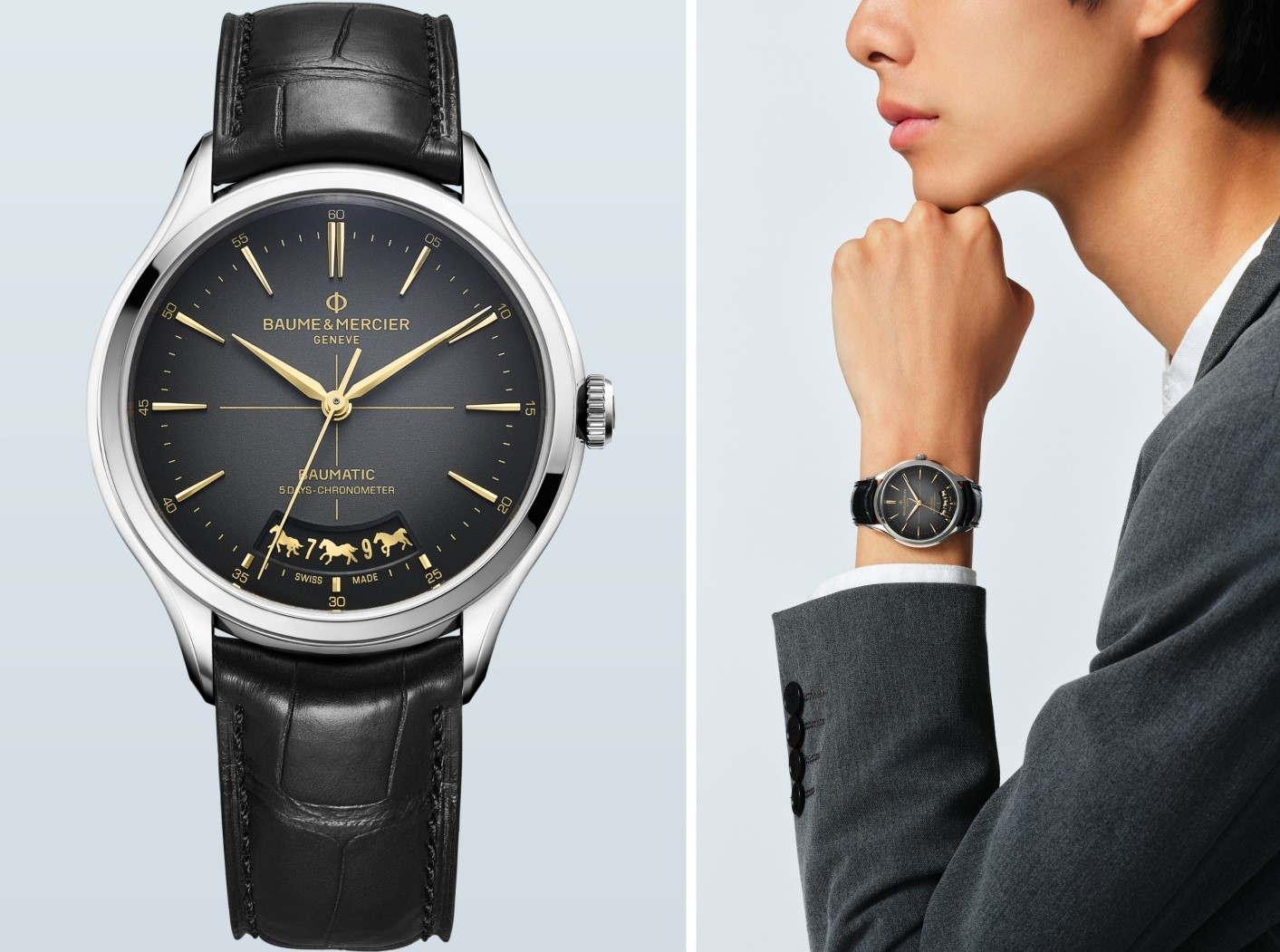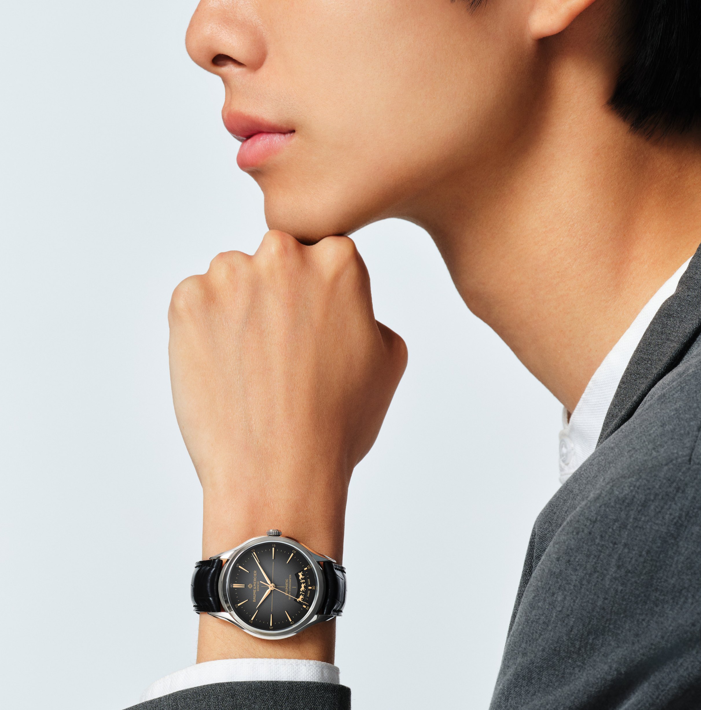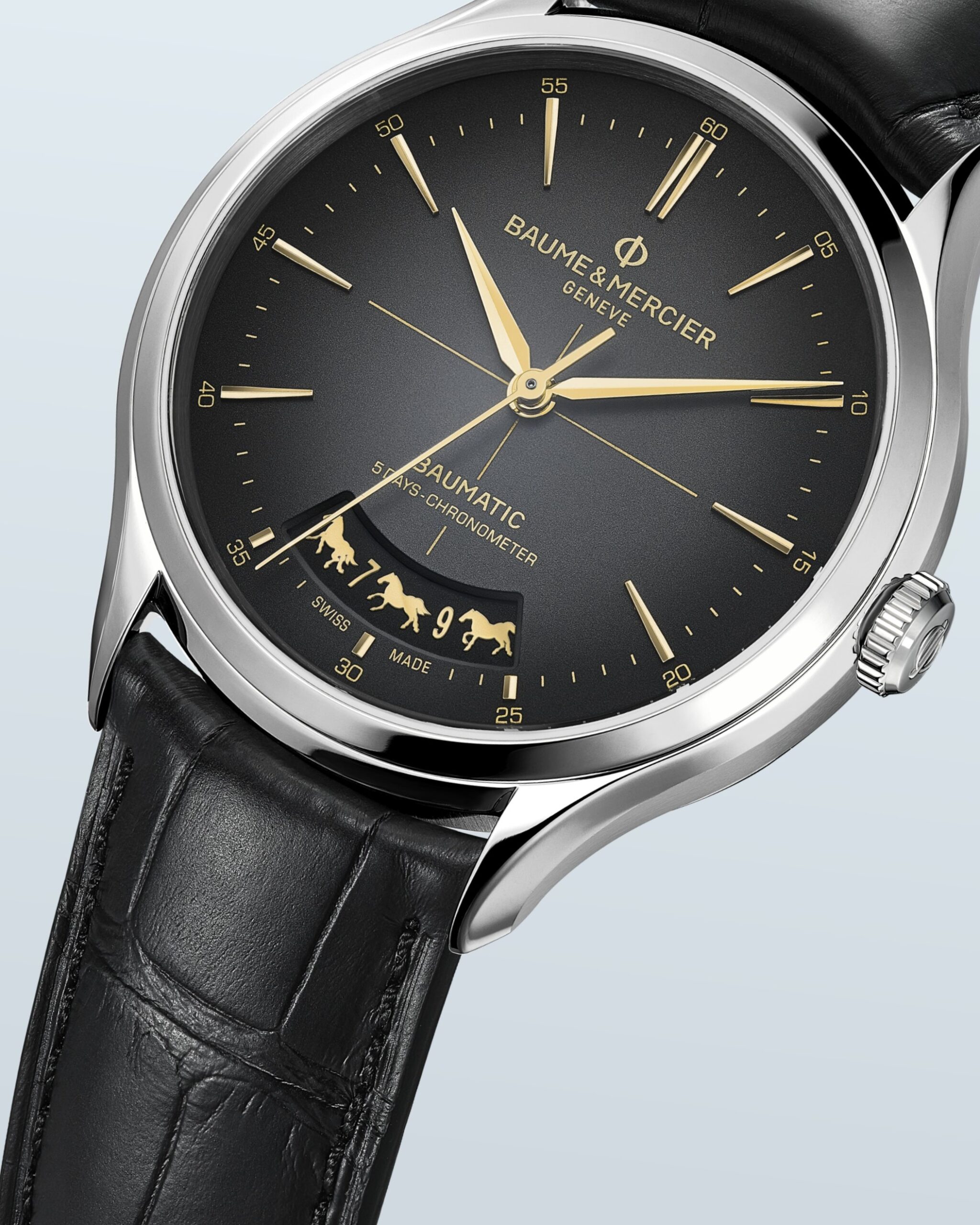 à con giáp thứ bảy trong 12 địa chi, Ngọ năm 2026 mang hành Hỏa. Sự gắn kết với mặt trời làm nổi bật nguồn năng lượng vô hạn cùng tinh thần tự do của loài ngựa cao quý. Sức sống đó được Baume & Mercier diễn giải trên mặt số xám đậm với lớp hoàn thiện chuyển sắc và sơn mài tạo chiều sâu, tôn lên các yếu tố trong sắc hoài cổ.