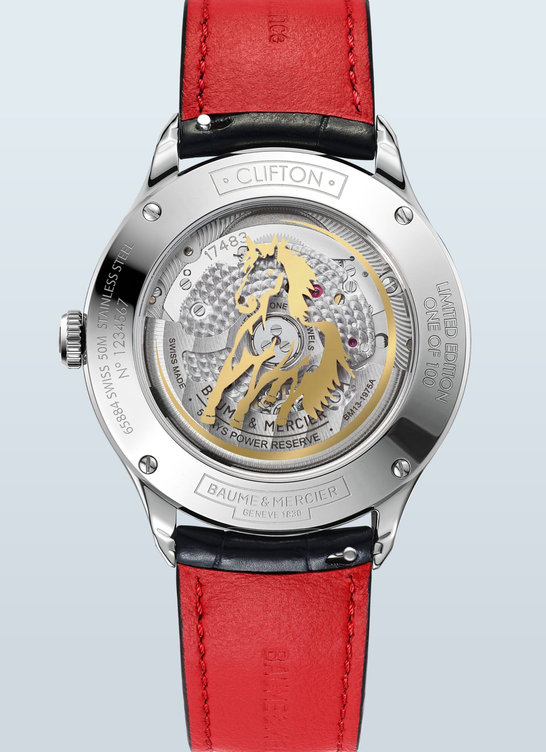 Mặt sau cũng trang trí hình chú ngựa đang phi, in chuyển màu vàng như bứt phá qua lớp kính cố định bằng bốn vít và có thể khắc cá nhân hóa. Thấp thoáng bên dưới, Calibre BM13-1975A COSC đảm bảo độ chính xác vượt trội cùng khả năng kháng từ lên đến 1.500 Gauss. Hoạt động ở tần số 4 Hz, bộ máy tự động trữ 5 ngày năng lượng, cấu thành từ các linh kiện hoàn thiện tinh xảo, như hệ thống cầu điểm vân tròn, đế phun cát và vân xoắn ốc, rotor skeleton trang trí Côtes de Genève đồng thời mang logo Baume & Mercier chạm khắc.