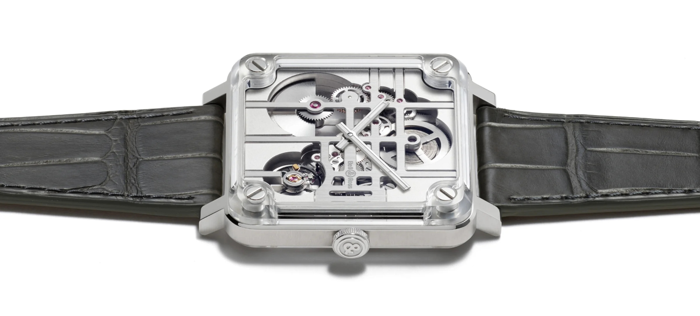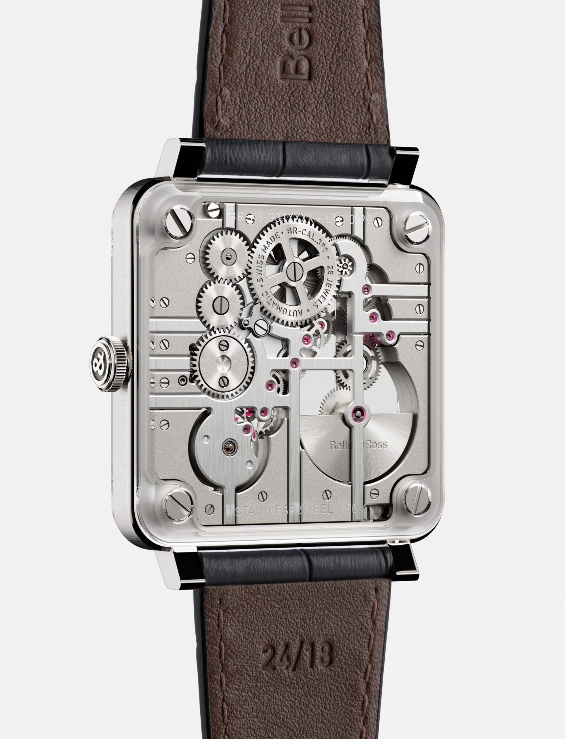 BR-X3 Micro-Rotor mang thiết kế vỏ vuông đặc trưng với bốn ốc vít biểu tượng. Trong trường hợp này, hình vuông không chỉ là dấu ấn thị giác mà còn trở thành yếu tố cấu trúc. Vỏ thép 40mm cùng bộ máy tự động manufacture micro-rotor hợp nhất thành một chỉnh thể, với phần thân vỏ trực tiếp nâng đỡ hệ thống cầu, tạo nên cấu trúc táo bạo gồm ba phần. Theo đó, phiến thép trung tâm hình thành cụm vỏ – bộ máy, được kẹp giữa hai lớp kính sapphire ở trên và dưới.