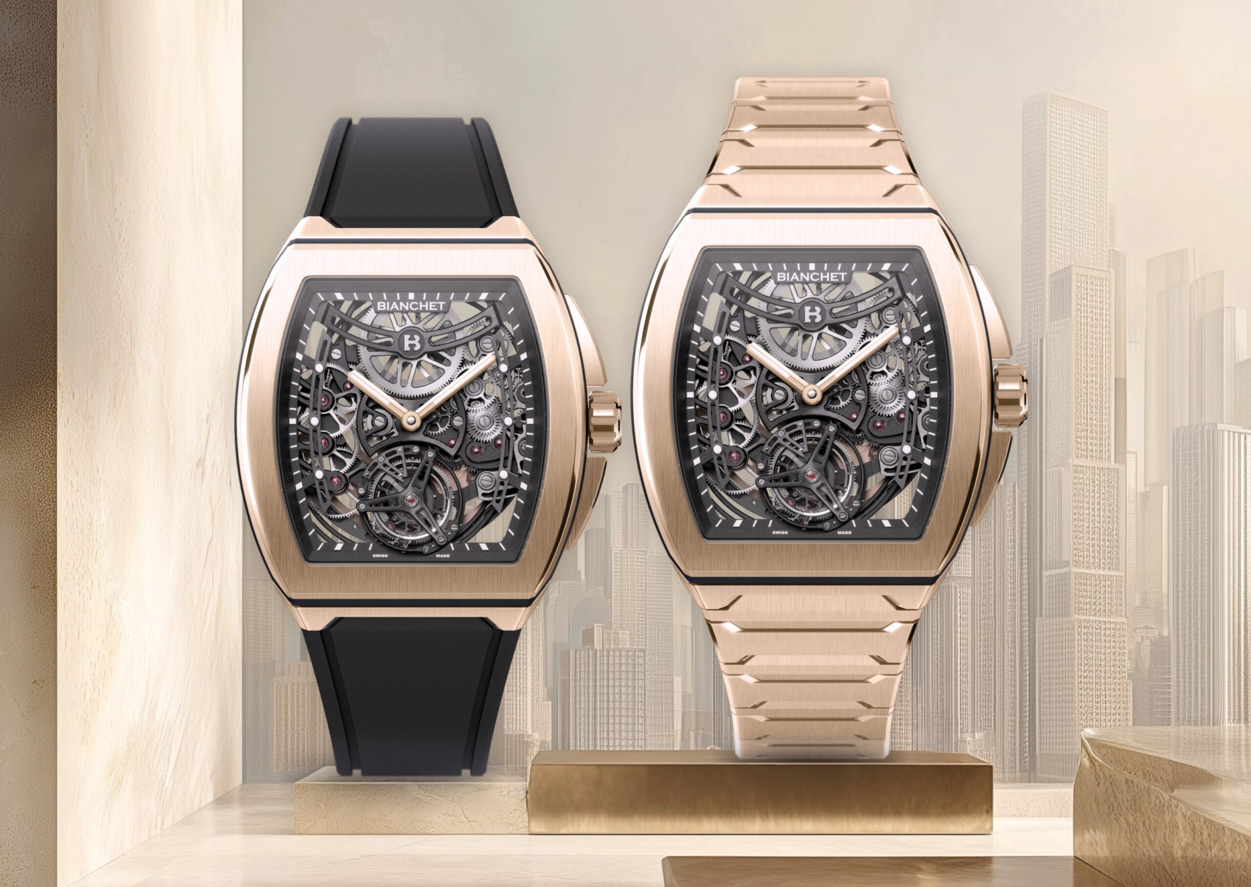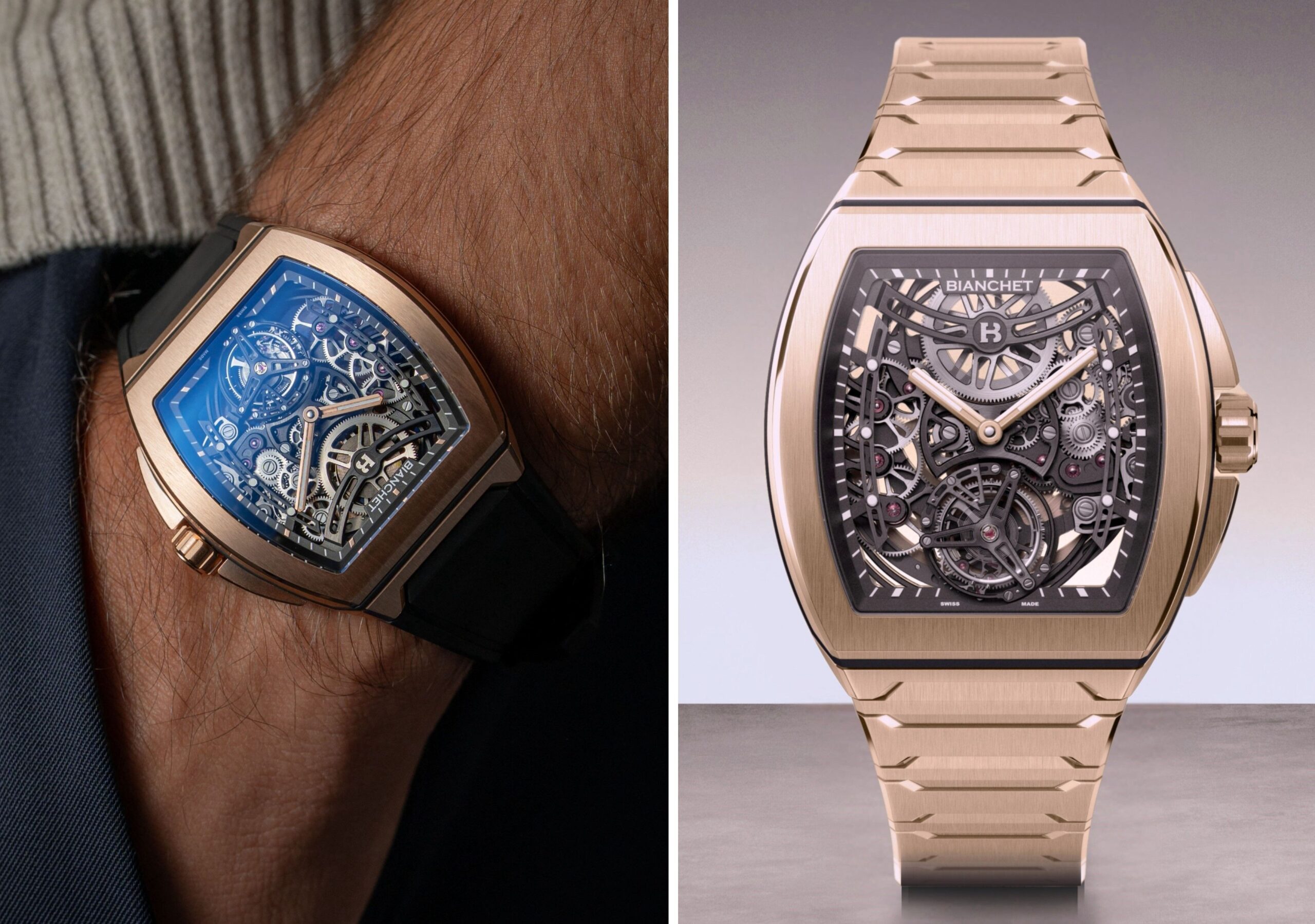 UltraFino Gold Edition tái hiện mẫu tourbillon tonneau siêu mỏng của Bianchet trong vỏ vàng hồng 18K quý giá. Kiến tạo phong cách thể thao thanh lịch trên cổ tay nhờ vòng vàng hoặc dây cao su đen tích hợp liền mạch, “cỗ máy thời gian” trưng bày từng nhịp đập Calibre UT01 flying tourbillon bằng titan phủ PVD đen ở cả mặt trước lẫn mặt sau.