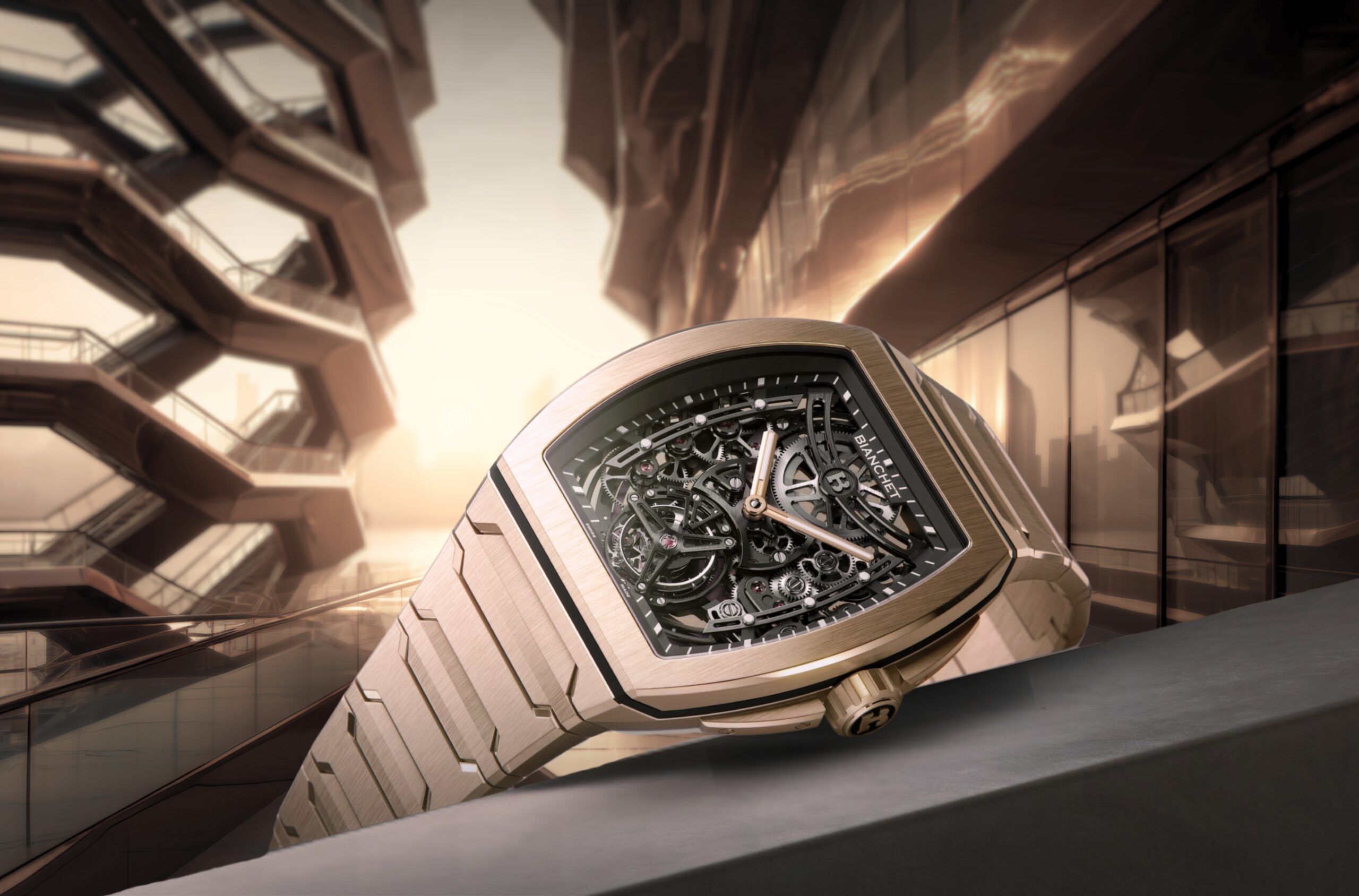 Đồng điệu với sắc vàng 18K của vỏ kín nước 50m, cọc số, kim phủ vàng hồng, vừa nâng cao độ tinh tế vừa đảm bảo khả năng đọc giờ rõ ràng. Trong khi đó, kết cấu titanium mang lại độ bền vững vượt trội dù độ mỏng cực hạn, trong khi lớp PVD đen phủ lên cơ cấu tạo nên vẻ hiện đại, làm nổi bật tính điêu khắc. Sự tương phản táo bạo giữa đen và vàng tạo nên trạng thái cân bằng vượt thời gian, đồng thời mang đến hào quang sang trọng khó nhầm lẫn.