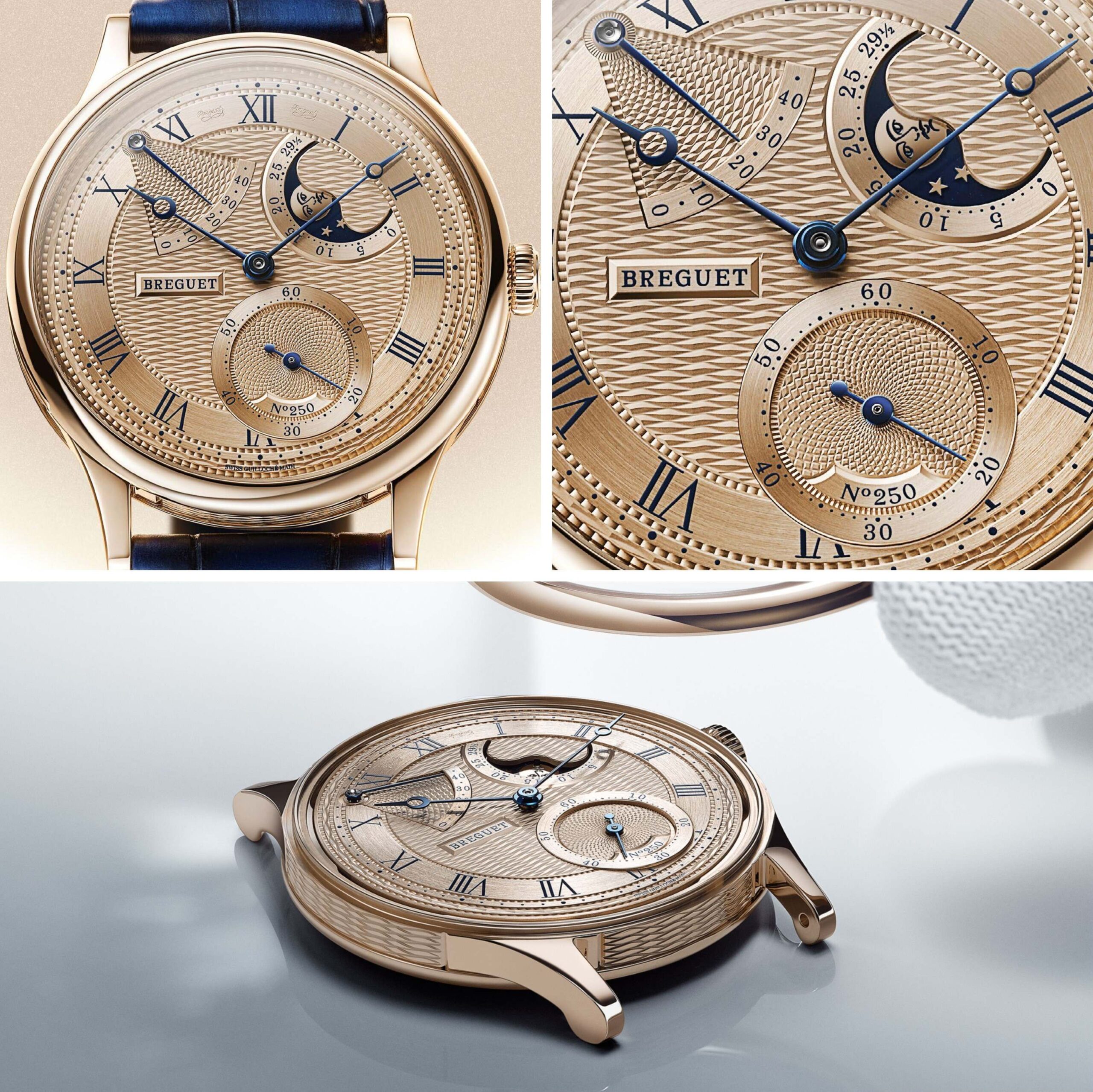 Đánh dấu cột mốc 250 năm thành lập thương hiệu, toàn bộ đồng hồ được chế tác từ vàng Breguet 18K độc quyền. Trong đó, mặt số khắc tay họa tiết guilloché “Quai de l’Horloge” – gợi lại địa chỉ xưởng đầu tiên của A.-L. Breguet tại Paris. Các khu vực hiển thị năng lượng, kim giây nhỏ và vành ngoài đều mang cùng mô-típ nhưng thể hiện theo dạng tròn, xen kẽ những dải chải satin tạo nên độ sâu và sự hài hòa thị giác. Mặt số vát nghiêng nhẹ – mỏng dần về viền – giúp viền bezel và kính sapphire cong kết nối hoàn hảo với thân vỏ. Lần đầu tiên, phần vỏ giữa mang họa tiết “Quai de l’Horloge” thay thế cho rãnh khía truyền thống.