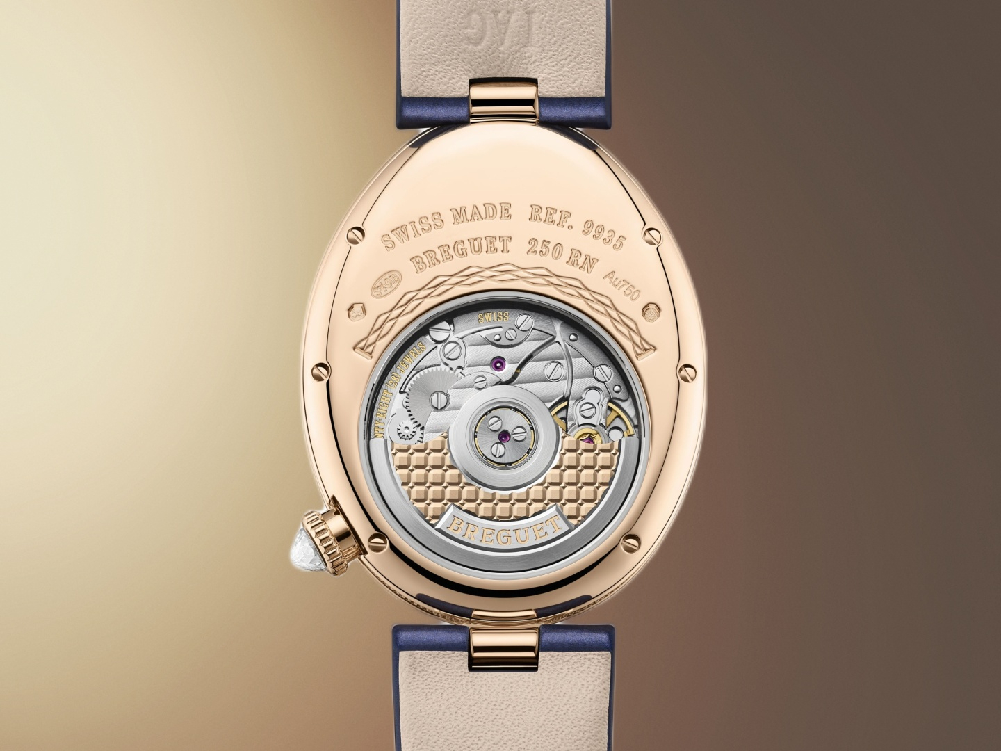 Tinh xảo không kém mặt trước, mặt sau mang dòng chữ “BREGUET 250 YEARS” khắc tinh xảo, qua đó hé lộ bánh lắc bạch kim 950 trang trí lớp mạ vàng Breguet tỉ mỉ. Đây cũng là lần đầu tiên mẫu đồng hồ này điểm họa tiết guilloché “Petit Trianon” thủ công cùng “Quai de l’Horloge” bao quanh phần mở của kính sapphire, tạo nên tổng thể vừa tinh xảo vừa hài hòa.