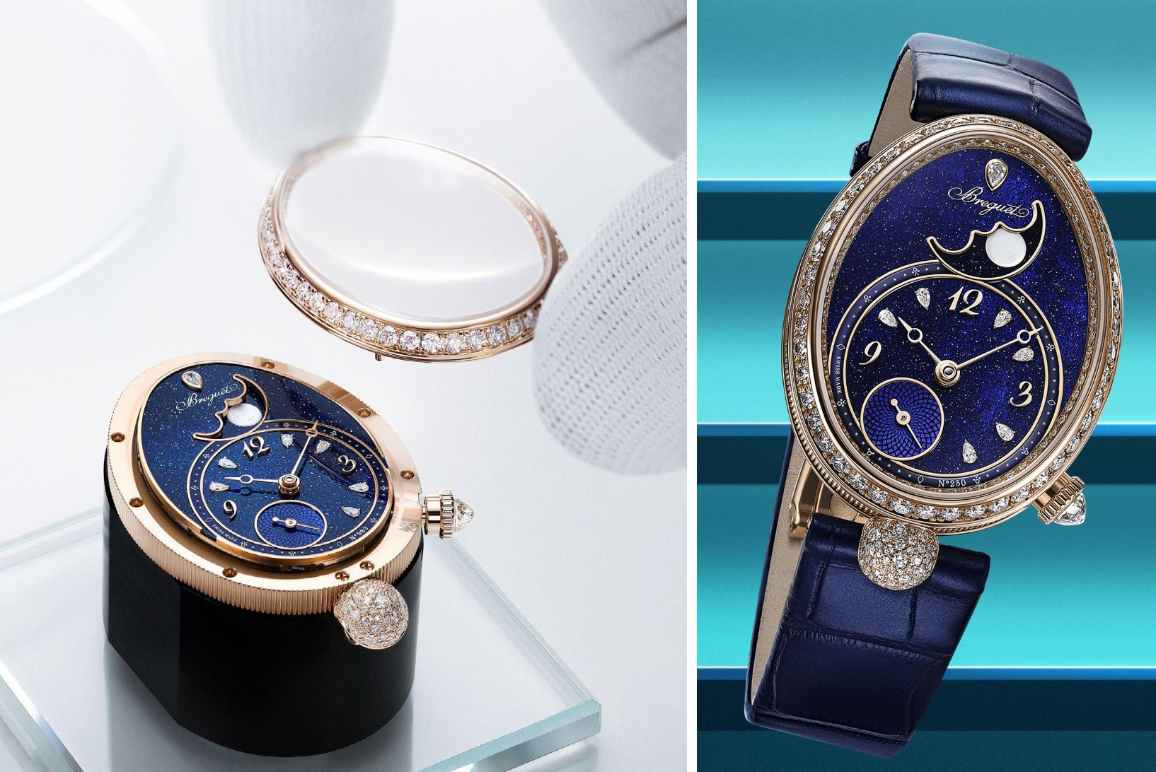 Thiết kế mới đầy sáng tạo được tôn vinh bằng ba phiên bản mặt số. Nổi bật nhất trong số này, phiên bản vỏ vàng Breguet với mặt số hai tầng đặc biệt, gồm tầng trên được chế tác từ thủy tinh aventurine quý giá. Để tăng thêm chiều sâu và làm nổi bật vẻ rực rỡ tự nhiên, bên dưới lớp thủy tinh aventurine, hãng khéo léo đặt một phiến xà cừ Tahiti mỏng óng ánh tự nhiên, tạo nên một hiệu ứng ánh sáng chuyển động nhẹ nhàng xuyên suốt cả ngày, giống như ánh sáng cực quang phương Bắc huyền ảo. Sự kết hợp độc đáo aventurine xanh dương cùng các điểm nhấn đồng lấp lánh đã mang đến cho Reine de Naples một vẻ đẹp rực rỡ, gợi liên tưởng đến bầu trời đêm đầy sao, hài hòa hoàn hảo với chu kỳ chuyển động của mặt trăng xà cừ trắng. Đặc biệt hơn, mặt trăng còn mang một dấu ấn bí mật: hình ảnh trong suốt của ngôi sao đêm được khắc tinh tế dưới lớp xà cừ trắng, chỉ có chủ nhân của chiếc đồng hồ mới có thể nhận ra, tạo nên một nét riêng đầy tinh tế và sâu sắc.