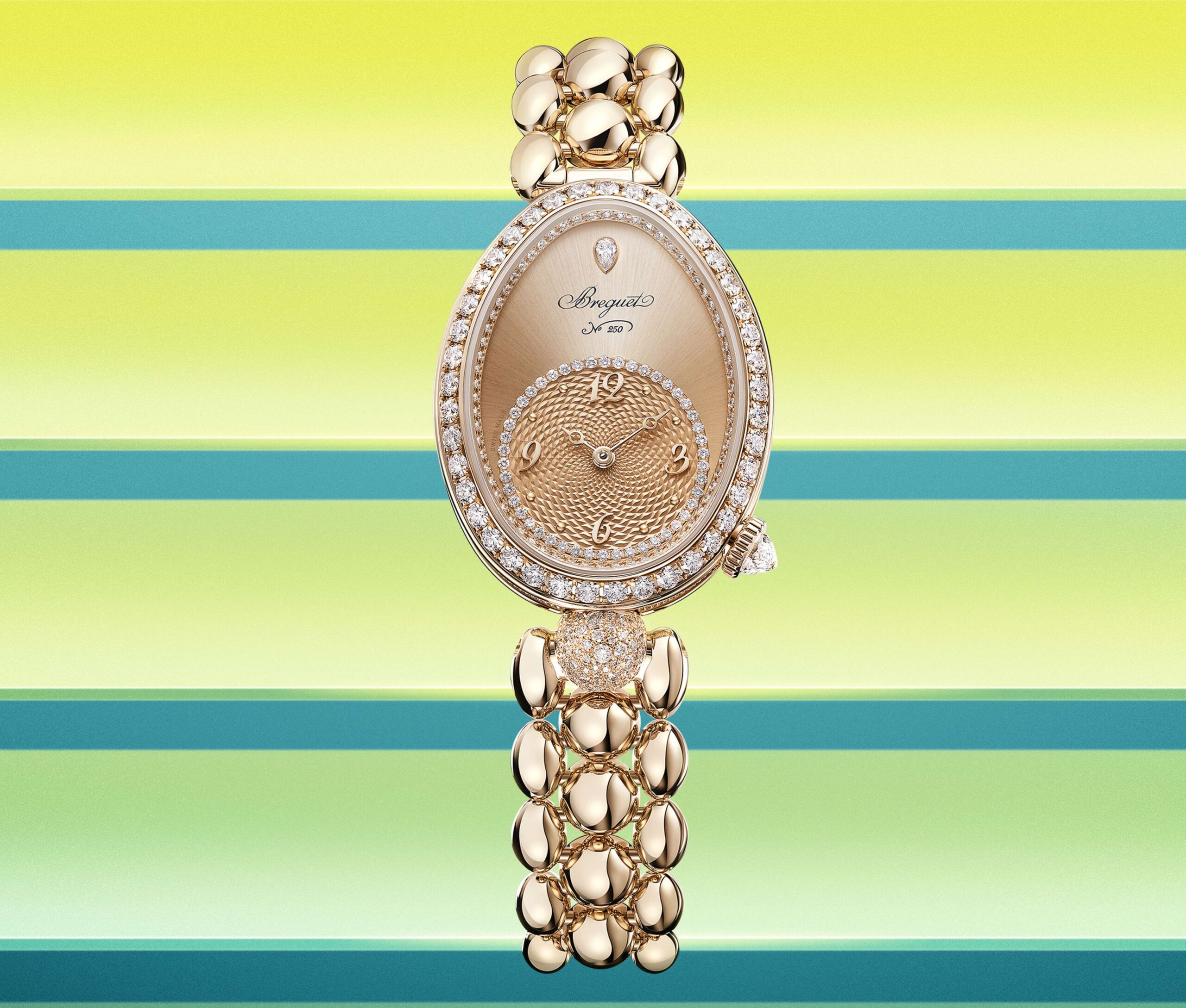 Lần đầu tiên, Reine de Naples được trang bị vấu trung tâm hình tròn tại vị trí 6 giờ lấp lánh kim cương. Hình học tinh tế của các viên kim cương này đã trở thành nguồn cảm hứng thiết kế cho các mắt xích trung tâm vòng đeo mới dựa trên hình dạng chữ nhật đặc trưng vỏ Reine de Naples. Mềm mại và uyển chuyển, vòng đeo linh hoạt điều chỉnh chính xác đến từng milimet tại bất kỳ cửa hàng Breguet nào, song hành phiên bản mặt số xà cừ trắng tinh tế và phiên bản nạm tổng cộng 1.387 viên kim cương và viên sapphire xanh, tổng trọng lượng đá quý lên đến 5,2 carat. Ngoài ra, phiên bản mặt số aventurine xanh còn kết hợp dây da cá sấu xanh hiệu ứng satin. Và, tùy chọn dây đeo này cũng là lựa chọn tuyệt vời cho phiên bản mặt số xà cừ trắng.