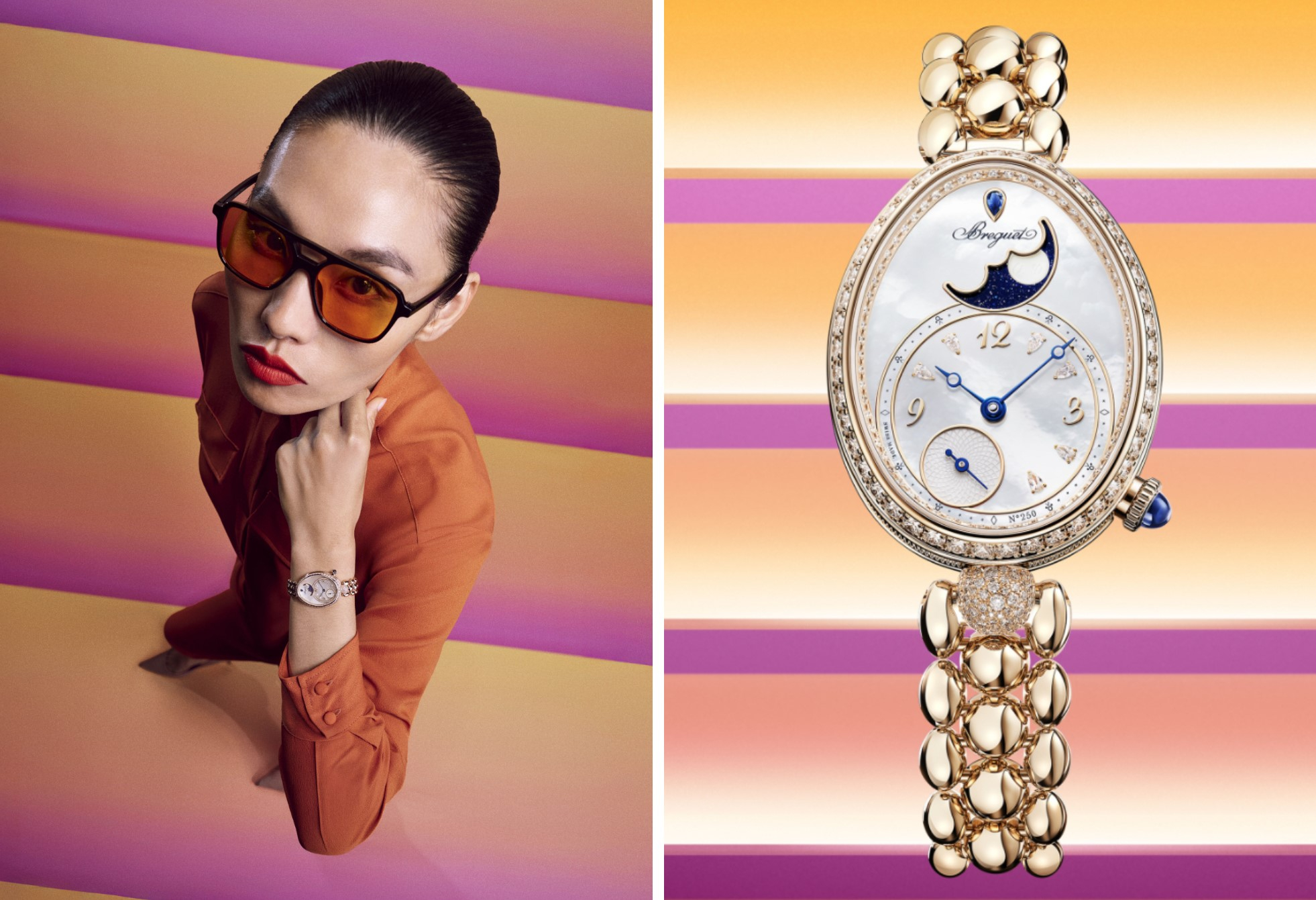 Sở hữu vành gờ kính dày hơn điểm xuyết 41 viên kim cương, Reine De Naples Phase De Lune 8925 hiện diện trong ba phiên bản mặt số với ba phong cách khác nhau. Phiên bản đầu tiên sở hữu mặt số xà cừ trắng thuần khiết, với vòng số lệch tâm điểm xuyết bộ chữ số Ả Rập Breguet bằng vàng trên nền guilloché hình tròn “Quai de l’Horloge”. Kế đến, phiên bản thứ hai nổi bật với sắc vàng Breguet phủ khắp dây đeo, vỏ, vòng họa tiết guilloché chải tia mặt trời trên mặt số, tạo nên sự đồng nhất và ấm áp đầy sang trọng. Phiên bản cuối cùng tạo nên điểm nhấn bằng hiệu ứng tương phản tinh tế giữa vòng giờ vàng guilloché phủ lớp sơn mài đen bóng và phần trên mặt số aventurine đen lấp lánh, như một bầu trời đêm huyền bí và quyến rũ. Sóng đôi vòng đeo vàng Breguet, có khớp nối tại vấu tròn trung tâm vỏ lần đầu tiên điểm xuyết kim cương “snow-setting”, cả ba phiên bản sở hữu điểm chung chính là viên kim cương hình quả lê ngụ vị trí 12 giờ, ngay phía trên chữ ký Breguet, thể hiện sự quý phái và đẳng cấp vượt thời gian.