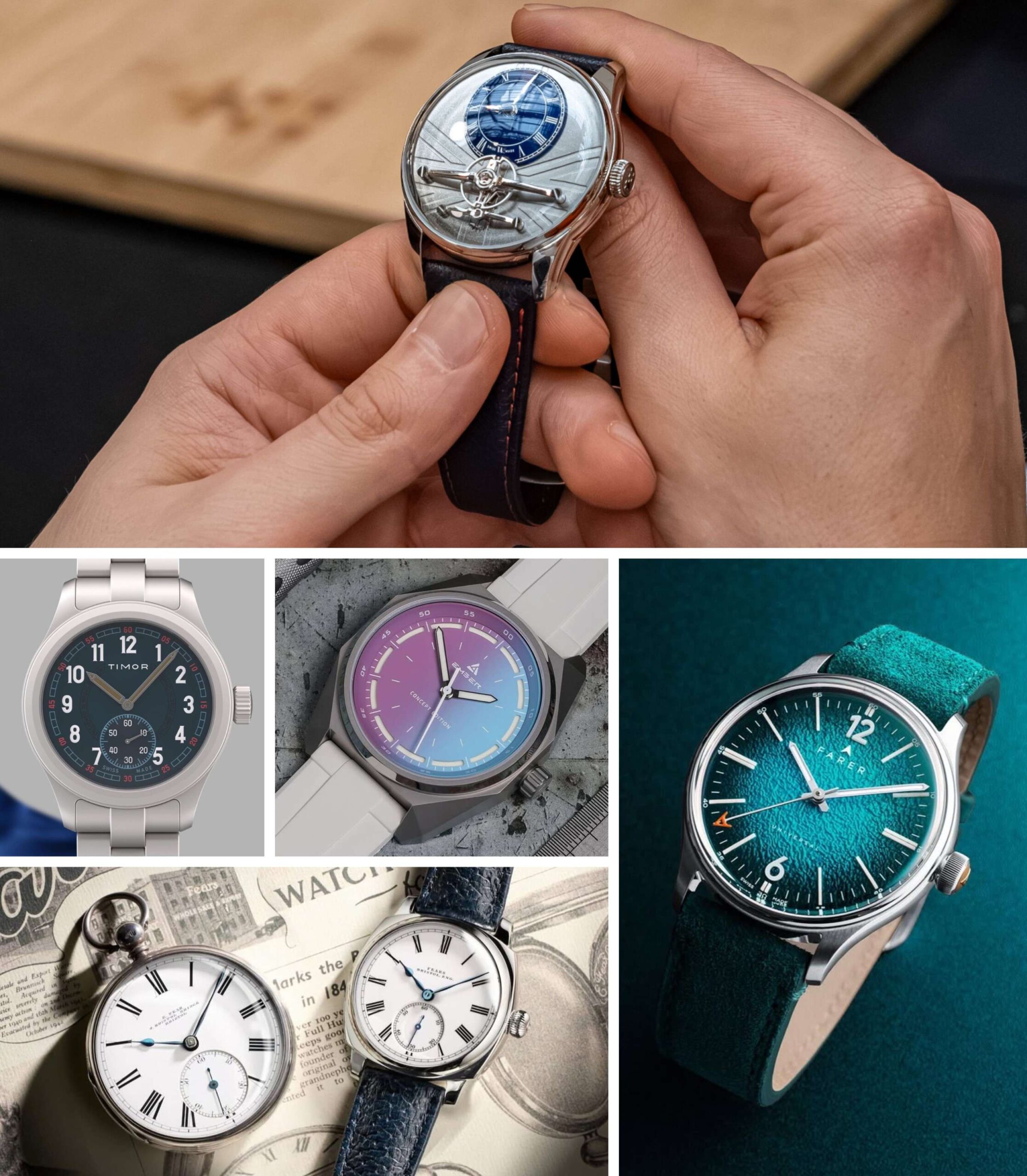 Trên xuống dưới, trái sang phải: Christopher Ward Loco 7326, Timor BWD, Ember Concept Edition 01, Fears Brunswick BWD26 và Farer Three Hand ‘Cross’