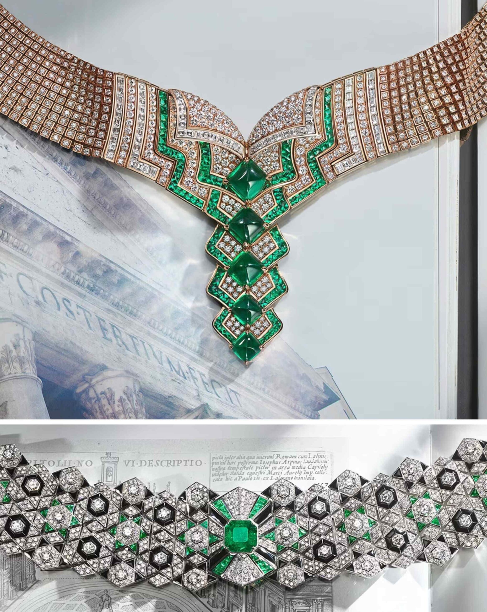 Được chế tác từ vàng hồng, vòng cổ Emerald Strata thu hút ánh nhìn vào năm viên emerald sugarloaf Zambia trong cấu trúc gợi hình cravat, buông rủ một cách mềm mại. Khoảng thời gian gần một năm đã được dành riêng để đội ngũ thợ kim hoàn tuyển chọn những viên đá đạt độ đồng nhất và chất lượng yêu cầu. Trong khi đó, thiết kế Eclectic Embrace collar lấy cảm hứng hình học từ các mảng mosaic Moorish tại Sammezzano Castle gần Florence, với 180 module tinh xảo, mang lại sự linh hoạt cho một cấu trúc vốn dĩ cứng cáp.