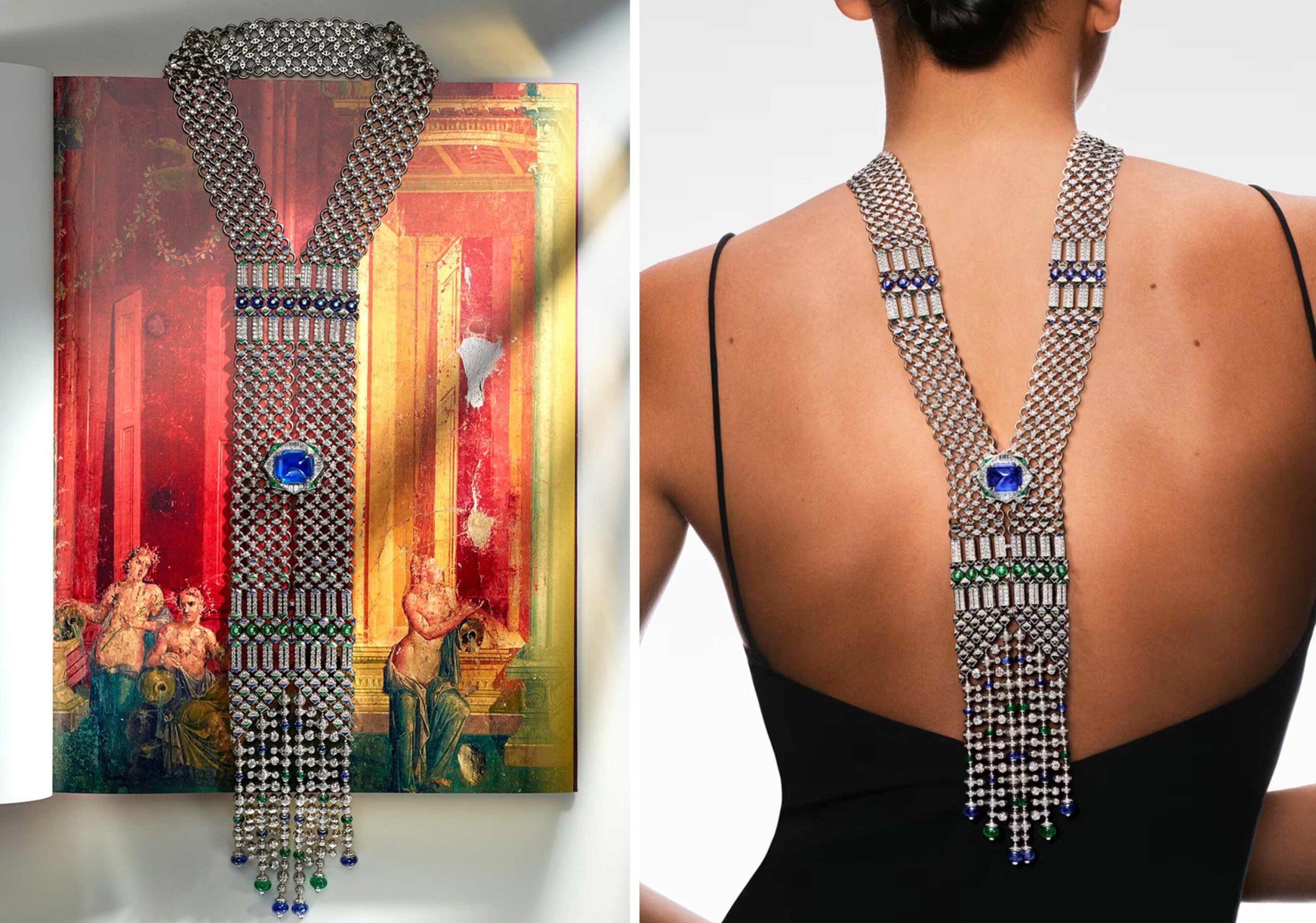 Trong nhóm Capolavori, vòng cổ Seres Scarf vàng trắng đòi hỏi kỹ thuật phức tạp nhất. Cấu thành từ hơn 1.180 chi tiết riêng biệt trong hơn 1.600 giờ chế tác, tác phẩm chuyển động mềm mại như một dải lụa buông rủ, với sapphire và emerald được sắp xếp theo cấu trúc dệt lấy cảm hứng từ hình học art deco cùng những bức tranh mang tính đột phá của Tamara de Lempicka.