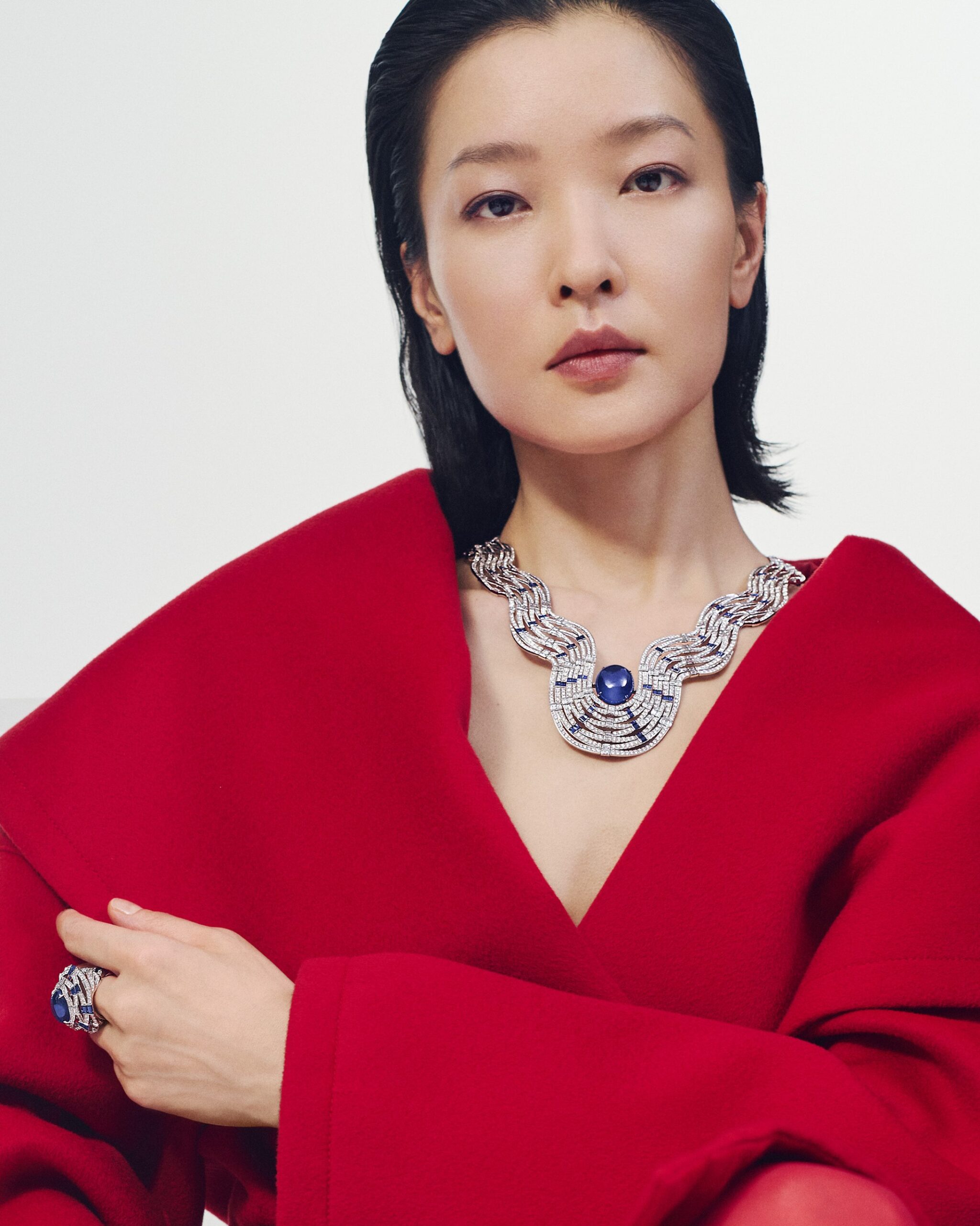 Với Cartier, sự cân bằng cũng có thể đến từ chuyển động. Chiếc vòng cổ Haliade thể hiện sự mềm mại đáng kinh ngạc khi viên sapphire Madagascar 41,85 carat như được bao quanh bởi làn sóng ánh sáng tạo nên từ những đường cong nạm kim cương, đan xen những đường thẳng nạm sapphire. Mỗi liên kết được tạo nên bằng sự chính xác gần như tuyệt đối, để dù khối lượng đá quý có đồ sộ đến đâu thì toàn bộ cấu trúc vẫn di chuyển nhịp nhàng như một dải lụa tung bay giữa làn sóng ánh sáng.