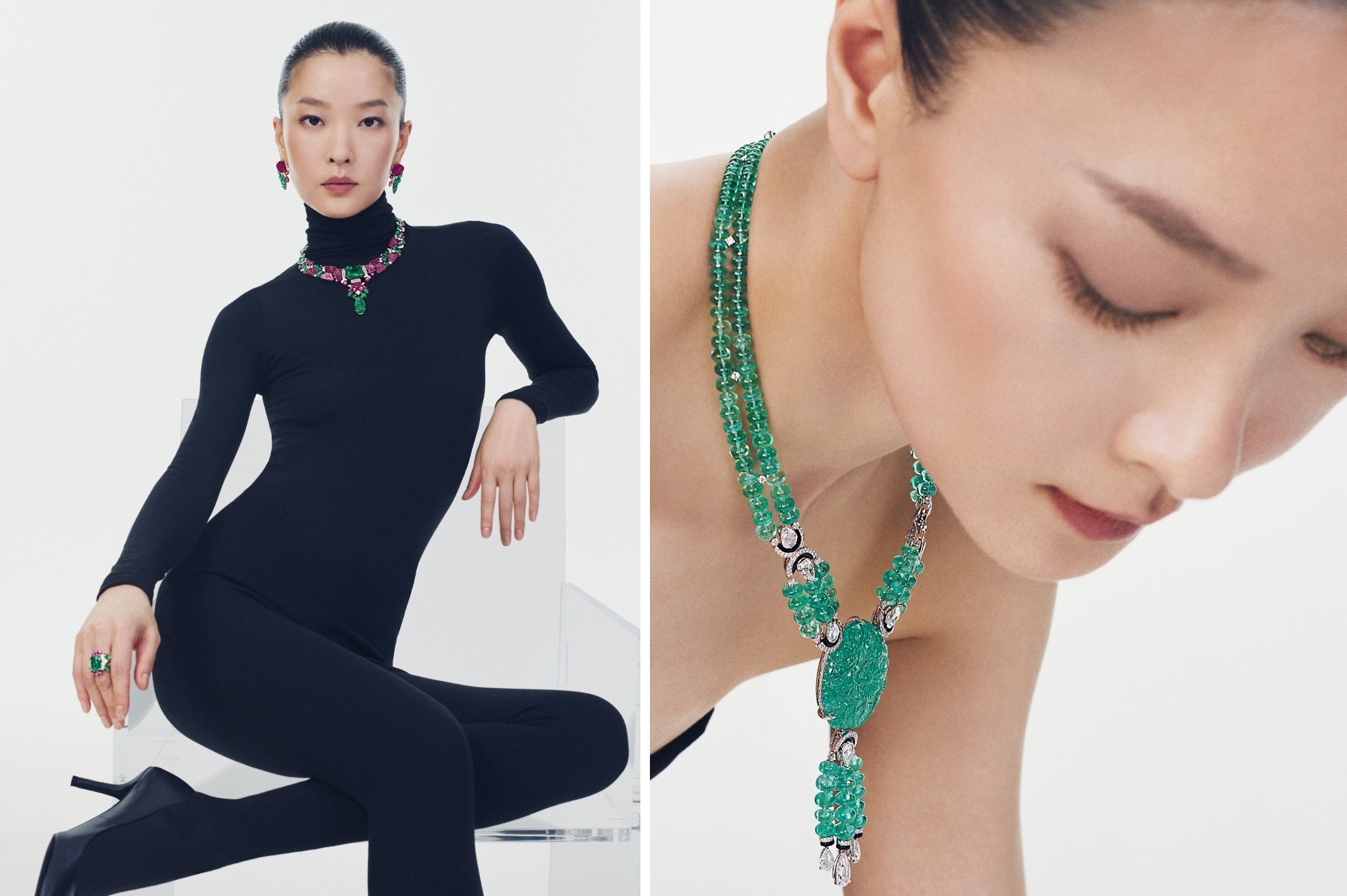 Khép lại bộ sưu tập là chiếc vòng cổ Nemorosa sở hữu hai viên emerald Colombia tổng cộng 5,37 carat – một vuông, một giọt lệ – được đặt trong kết cấu phức tạp thành hình từ kim cương, onyx và rock crystal. Kỹ thuật “invisible setting” khiến viên đá trung tâm như đang lơ lửng trong không gian, đồng thời được bao quanh bởi ánh sáng mờ ảo. Trên chuỗi dây, những điểm nhấn onyx đen tạo chiều sâu cho tổng thể như khoảng lặng trong một khúc nhạc, để người ngắm có thể hít thở, cảm nhận và chiêm nghiệm theo cách sâu sắc nhất.