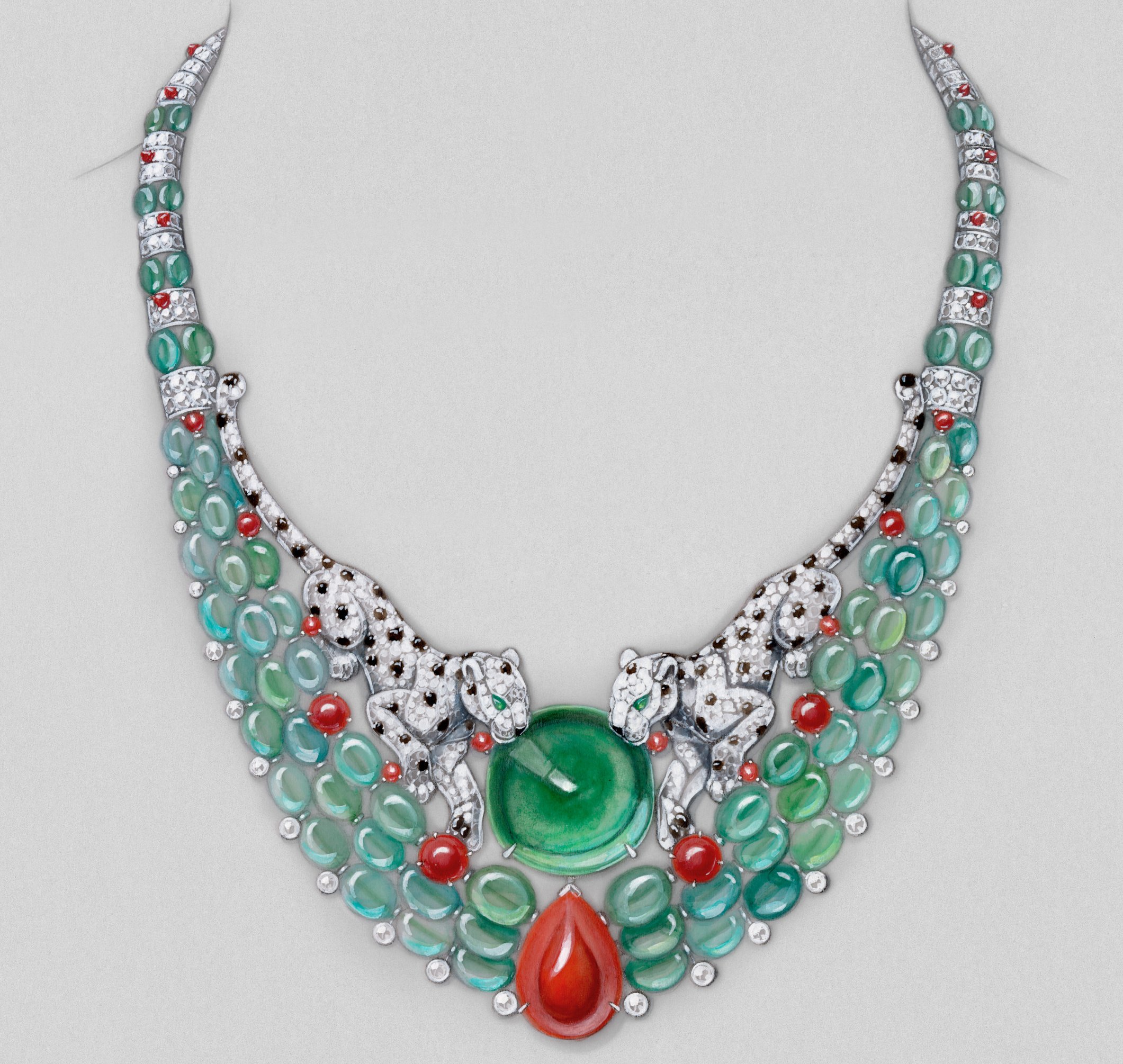 Từ ánh sáng rực rỡ, Cartier chuyển sang bản sắc biểu tượng của mình: Panthères Reflexio – cuộc gặp gỡ giữa sức mạnh và vẻ đẹp. Ở trung tâm, ta có thể nhìn thấy sự đối lập rực rỡ giữa tourmaline xanh 74,10 carat và coral đỏ 14,91 carat, được canh giữ bởi hai chú báo đối xứng làm từ platinum. Chúng không chỉ là biểu tượng mà còn là hình ảnh sống động của tinh thần Cartier: mạnh mẽ, duy mỹ và vĩnh cửu. Từng chi tiết, từ đôi mắt emerald cho đến đốm onyx và móng vuốt, đều được chạm khắc đến mức hoàn hảo, tựa như chỉ cần một cú chạm nhẹ thôi là đôi báo sẽ nhảy vồ ra khỏi tác phẩm để mất hút vào chốn rừng xanh.