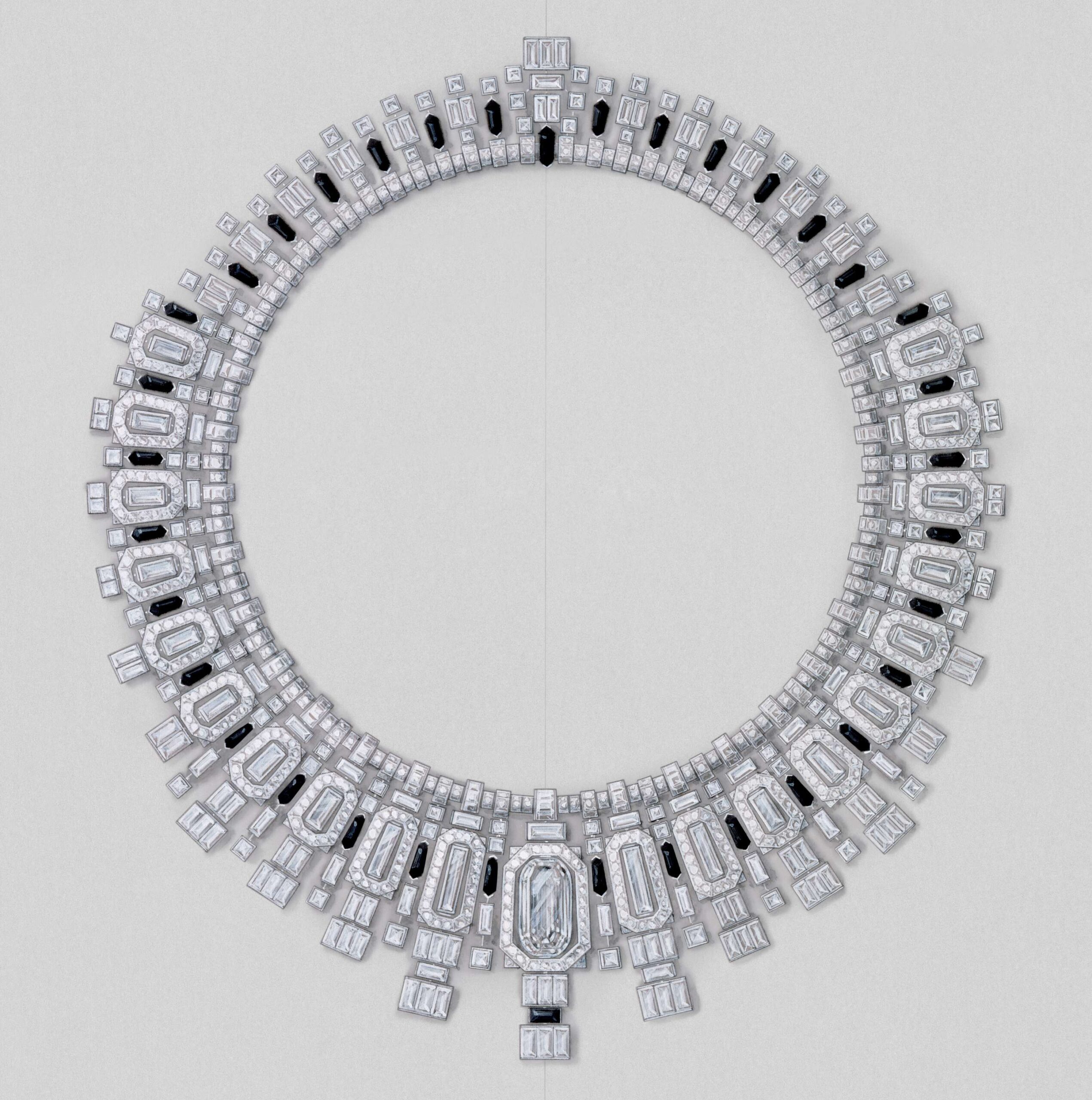 Từ hình khối sang đường nét, từ chiều sâu sang đối xứng, Vetrata mở ra một cách nhìn mới về sự cân bằng. Lấy cảm hứng từ kiến trúc Art Deco, chiếc vòng cổ trung tâm tỏa sáng với viên kim cương 8,15 carat, được vòng quanh bởi hai mươi viên kim cương điểm thêm onyx đen. Ánh sáng phản chiếu, tách ra rồi hòa nhập, hệt như chiếc vòng cổ đang tái hiện khung cửa sổ kính màu trong thời khắc ánh nắng sớm nhẹ nhàng tràn qua. Ẩn sau vẻ thanh mảnh ấy là cả một công trình kỹ thuật tinh xảo, với từng liên kết được đo đếm đến phần nghìn milimet tạo cảm giác mềm mại linh hoạt như làn gió.