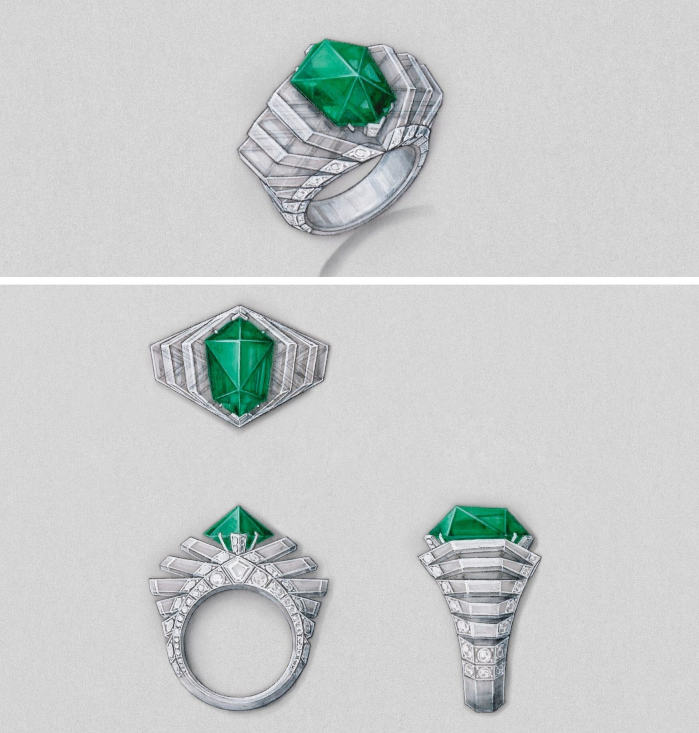 Bộ sưu tập mở ra bằng Scalera, kiệt tác điêu khắc ánh sáng được sinh ra từ sự lộng lẫy của viên emerald Zambia 6,12 carat. Viên đá xanh thẳm được bao bọc trong cấu trúc bậc tầng bằng rock crystal và kim cương, khiến từng vệt sáng len lỏi, lan tỏa rồi tan biến trong không gian trong vắt. Khoảnh khắc ấy, khi ánh sáng, hình khối và không gian gặp gỡ trong sự cân bằng hoàn hảo, ta cảm nhận được vẻ đẹp vừa mạnh mẽ vừa mong manh chỉ có thể được tìm thấy ở những báu vật kim hoàn.