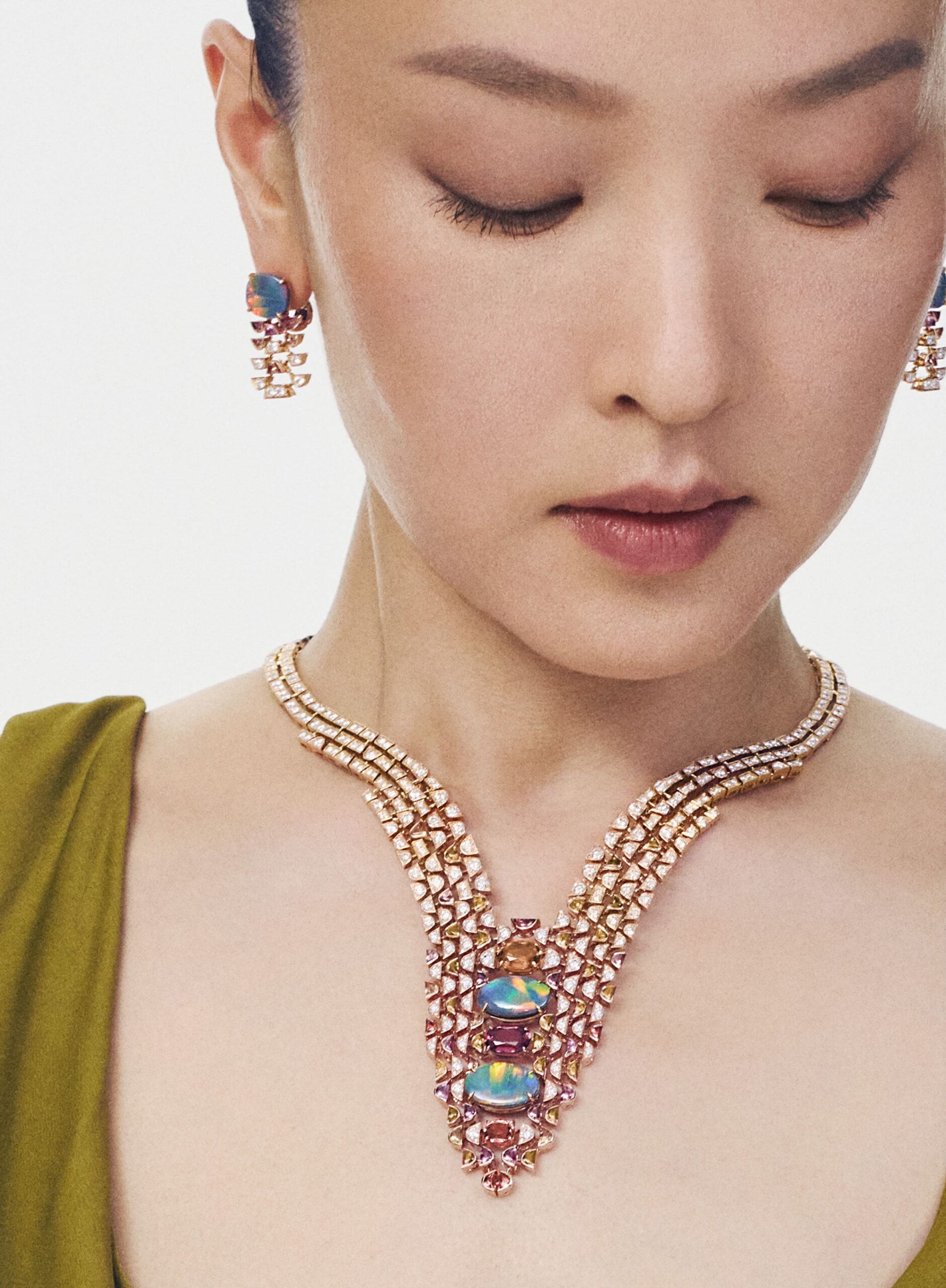 Khi ánh sáng hóa sắc màu, chúng ta được chiêm ngưỡng vòng cổ Cafayate quy tụ sự nồng ấm của vàng, hồng và cam. Hai viên opal trung tâm lan tỏa sắc cầu vồng lộng lẫy giữa một mạng lưới vàng hồng và vàng vàng, nơi những viên sapphire màu tiếp nối luồng sáng bằng gam màu nóng rực rỡ. Không ồn ào nhưng đầy cảm xúc, Cafayate tựa như hơi thở của buổi hoàng hôn chạm vào làn da, nồng nàn, tinh khôi và thanh khiết.