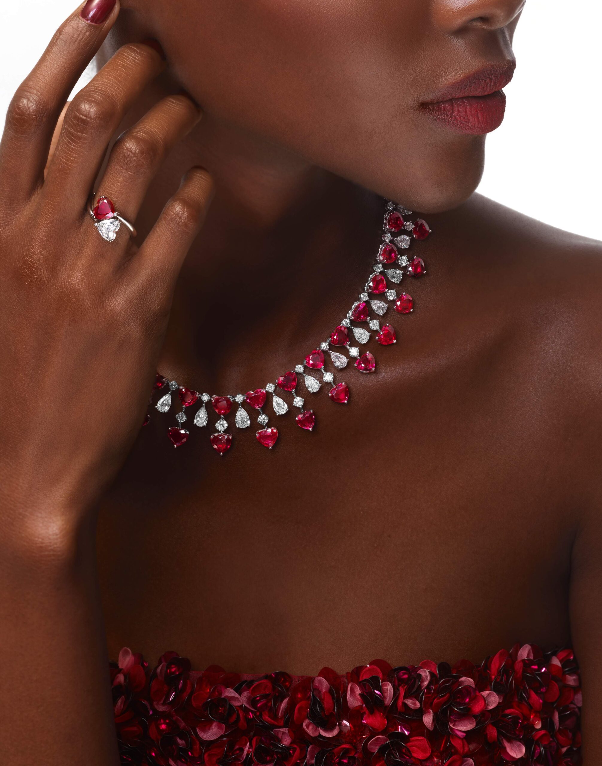 Được chế tác từ vàng trắng 18K hợp đạo đức, thiết kế hài hòa của vòng cổ là khúc ca ngợi ánh sáng và sắc màu. Sáu mươi bốn viên ruby cắt hình trái tim, tổng trọng lượng hơn 110 carat, xen kẽ kim cương trong họa tiết tinh xảo như ren, tạo nên tổng thể hài hoa, đong đầy chất thơ. Từ sắc đỏ rực lửa của ruby đến vẻ tinh khiết trong suốt đặc trưng kim cương trắng, mỗi viên đá tinh tuyển đều được sắp đặt khéo léo bởi đôi bàn tay của thợ kim hoàn bậc thầy.