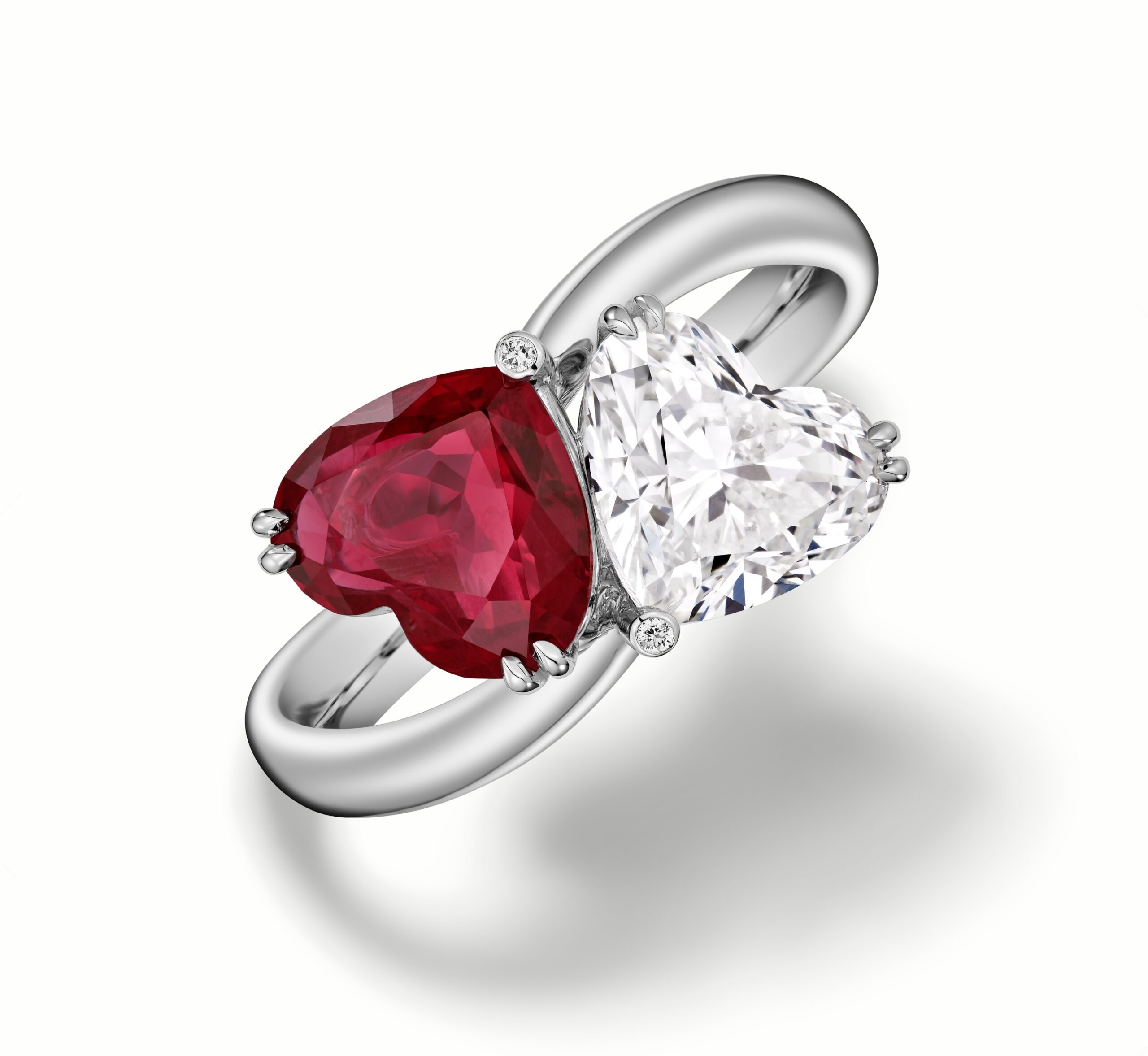 Hòa nhịp cùng chiếc vòng cổ, nhẫn Toi et Moi kết hợp viên ruby 1,79 carat và viên kim cương 1,50 carat. Trong dáng hình trái tim đồng điệu, hai viên đá đặc biệt tượng trưng cho sự gắn kết hai tâm hồn trong vũ điệu vĩnh cửu.