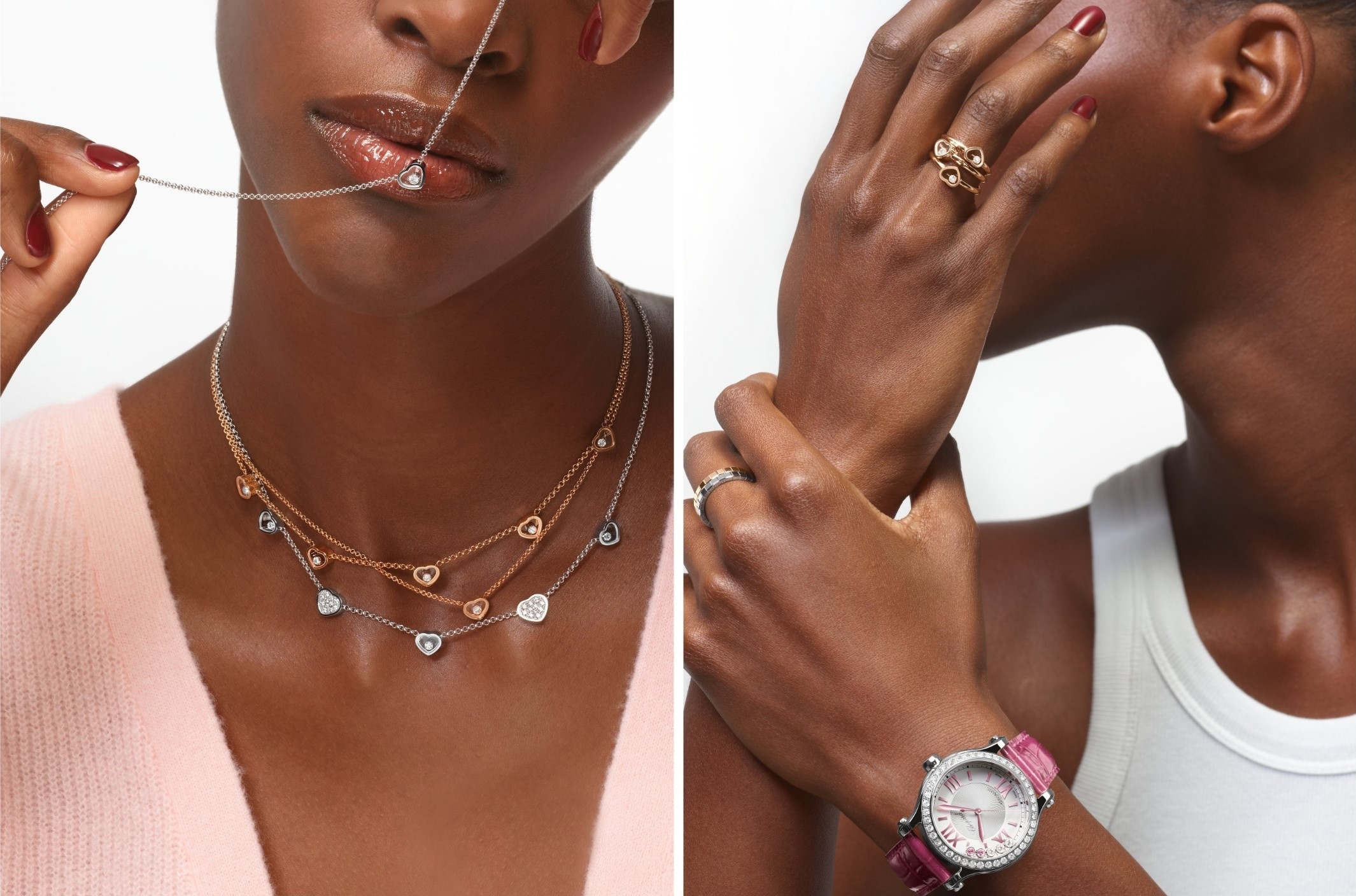 Bộ sưu tập My Happy Hearts được Chopard mở rộng bằng những thiết kế dây chuyền tinh tế, gửi gắm thông điệp yêu bản thân như một giá trị bền vững theo thời gian. Nhẹ buông trên làn da mềm, các mẫu trang sức vàng hồng hoặc vàng trắng 18K hợp đạo đức, khai thác biểu tượng trái tim đặc trưng của Maison bằng ngôn ngữ nhẹ nhàng nhưng giàu cảm xúc. Thiết kế một trái tim kim cương “dancing diamond” mang đến vẻ duyên dáng tối giản, trong khi bố cục năm trái tim tạo nên nhịp điệu thị giác tinh tế – năm viên kim cương chuyển động đồng điệu trên vàng hồng, hoặc sự xen kẽ giữa kim cương chuyển động cùng trái tim nạm kim cương kiểu tuyết trên vàng trắng.