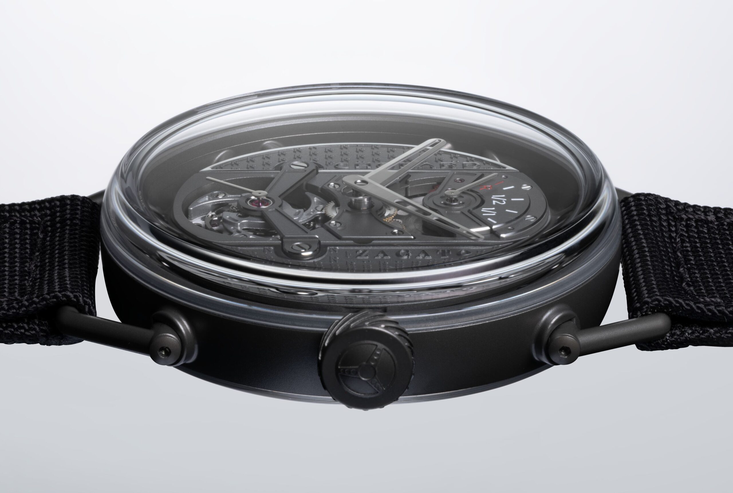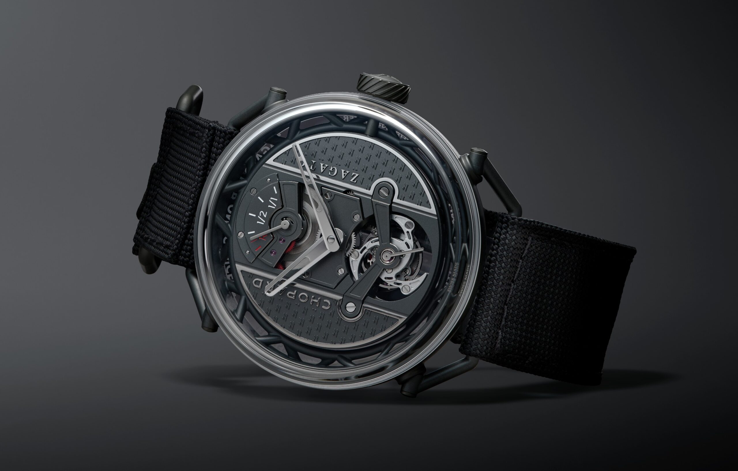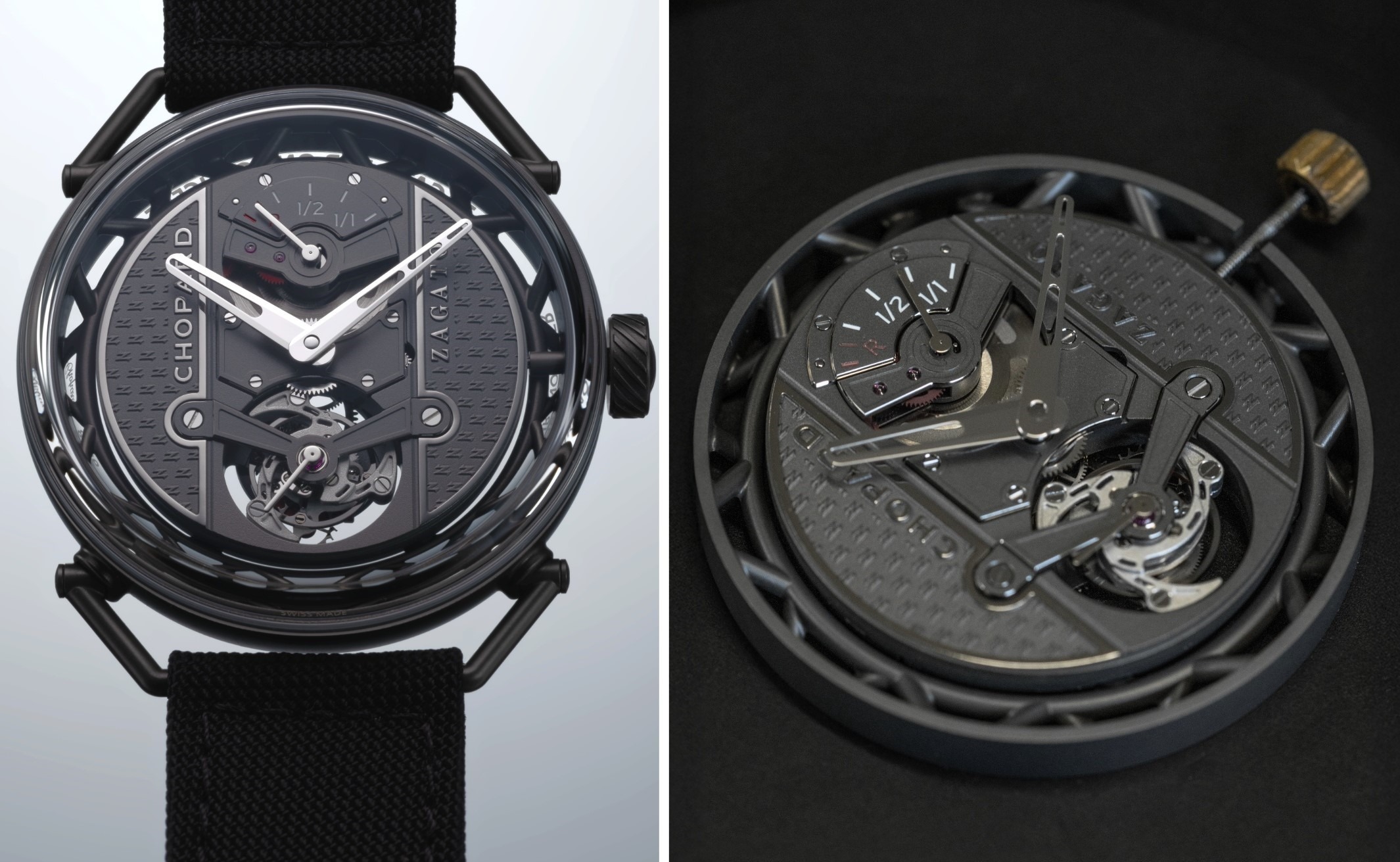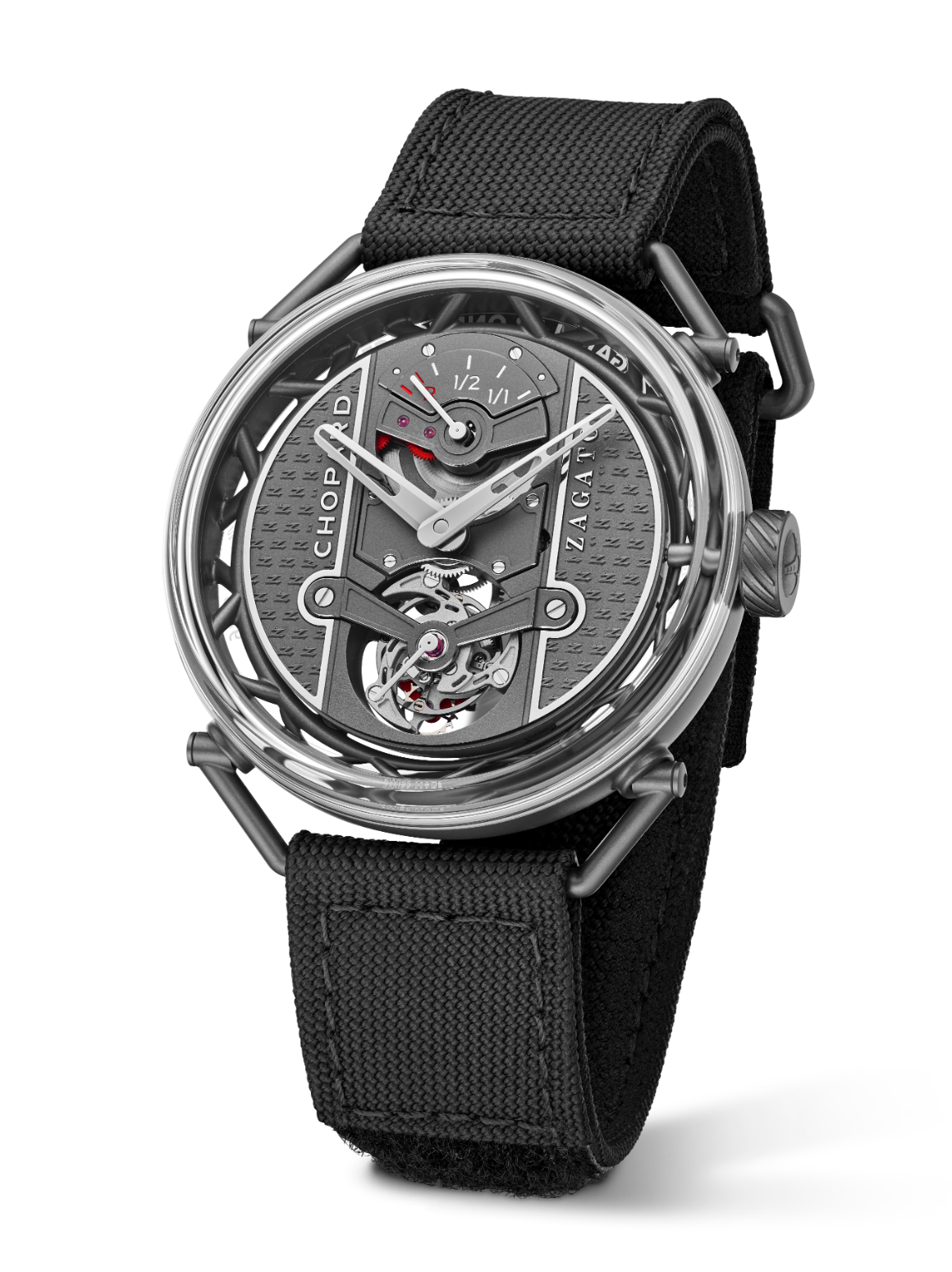Cách hiển thị thời gian trên Zagato Lab One Concept được xây dựng như một phần liền mạch của kiến trúc cơ học, đề cao tính đương đại cùng khả năng quan sát. Nằm an toàn bên dưới kính sapphire dạng hộp, phiến nền bộ máy đảm nhiệm vai trò mặt số, trang trí bằng họa tiết chữ “Z” lặp lại – dấu ấn nhận diện đặc trưng Zagato – với các cạnh vát được hoàn thiện bằng rhodium. Thêm vào đó, logo Chopard và Zagato cũng được phủ rhodiumm tạo hình nổi, giúp tăng độ tương phản, đảm bảo khả năng đọc trong mọi điều kiện ánh sáng. Giữ vai trò tâm điểm ở vị trí 6 giờ, tourbillon 60 giây tích hợp kim giây nhỏ, kết hợp bánh lắc Variner® và dây tóc với đường cong Phillips. Tất cả được đặt trong lồng nhôm siêu nhẹ nhằm tối ưu hóa khối lượng tổng thể, phù hợp với mục tiêu tối ưu trọng lượng xuyên suốt dự án.