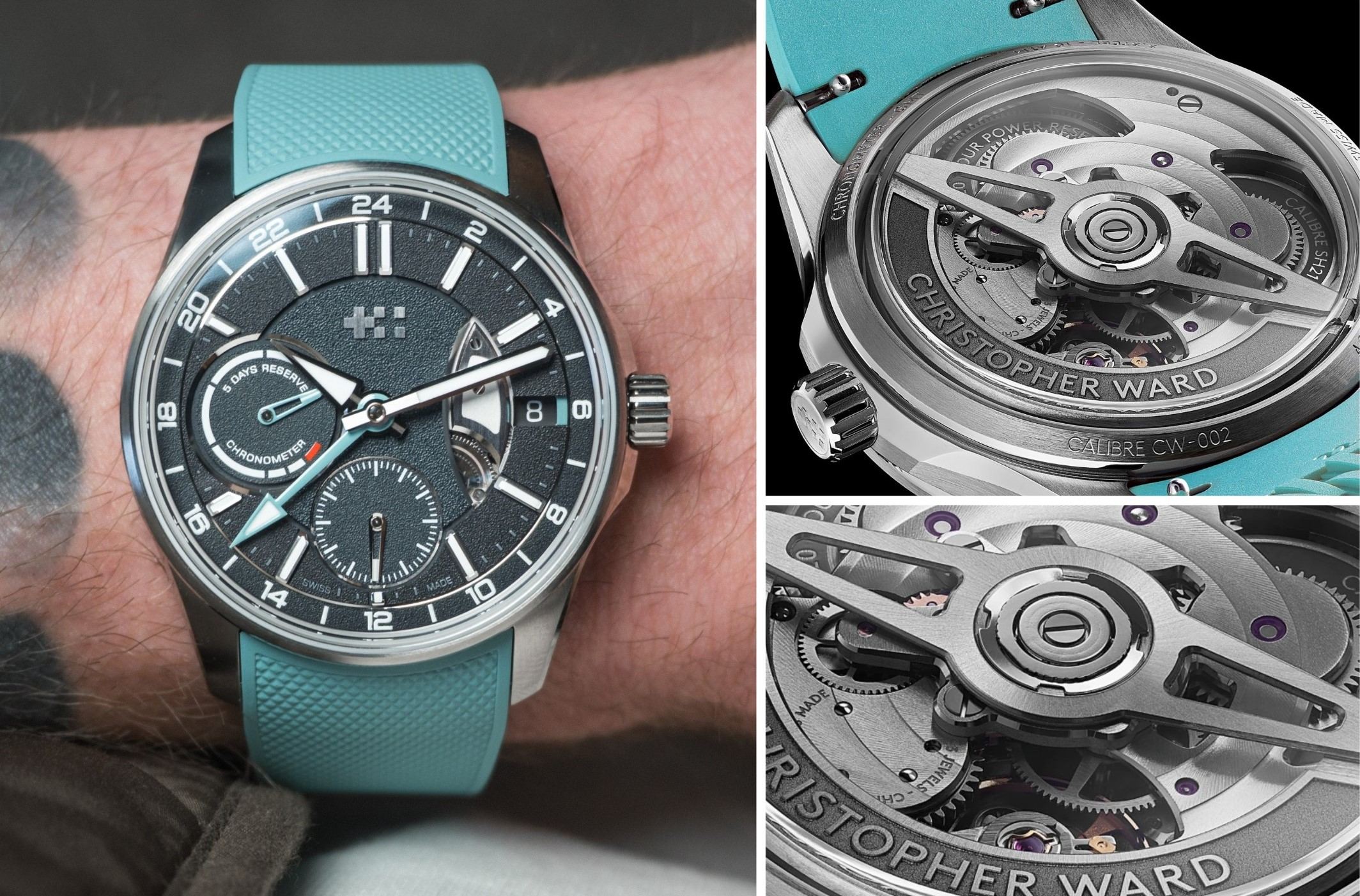 C63 True GMT, chiếc đồng hồ True GMT đầu tiên của Christopher Ward, vận hành bởi Calibre CW-002 tự hào mang chứng nhận COSC. Được phát triển trong suốt ba năm, bộ máy tự động trữ 120 giờ năng lượng phô bày cầu GMT qua cấu trúc mặt số phân tầng có chủ đích, ưu tiên khả năng đọc thời gian rõ ràng trong khi các chỉ báo phụ đặt chìm tinh tế bên dưới.