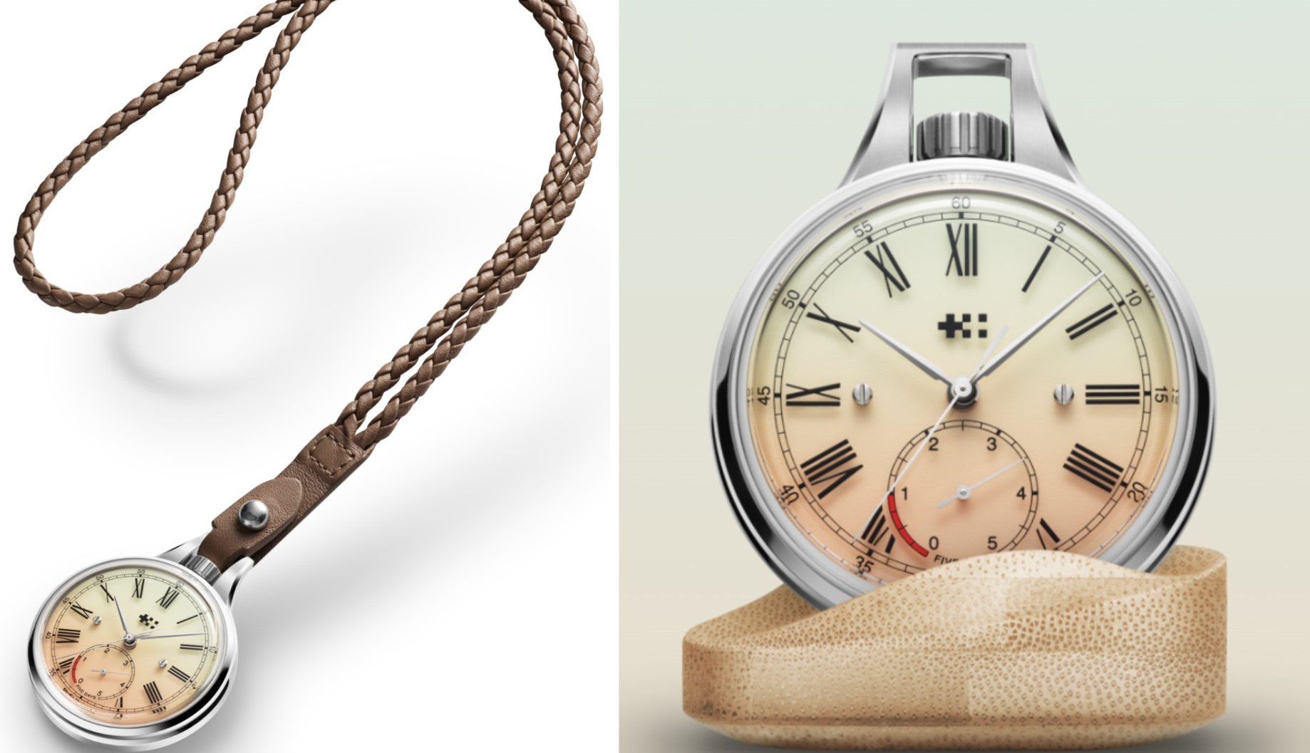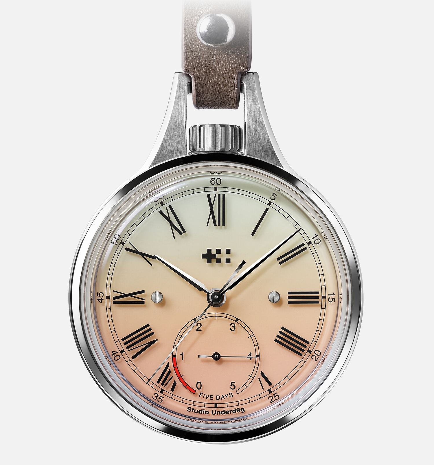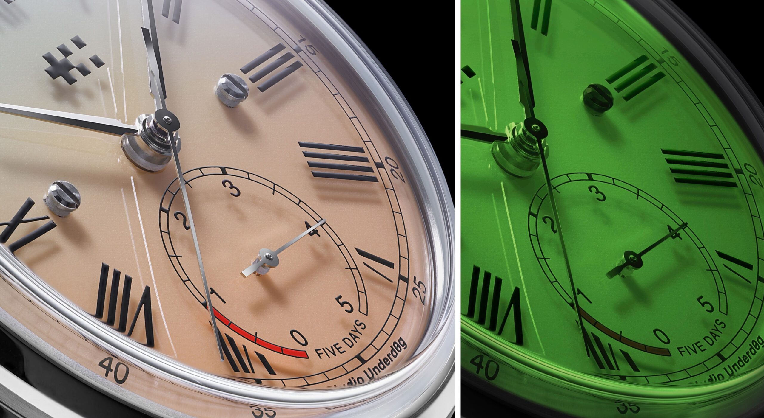 Mặt số – điểm nhấn đưa Alliance 02 vượt khỏi khái niệm “pocket watch” truyền thống – được chế tác từ nền đồng phủ bảy lớp Super-LumiNova® tùy chỉnh, tạo nên bề mặt phát sáng có khả năng hấp thụ ánh sáng nhanh và biến thành “sàn diễn ánh sáng” vừa rực rỡ vừa tinh tế trong bóng tối. Bao phủ phía trên, đĩa sapphire dày 1,4mm mang các chi tiết như số La Mã, thang phút và logo kép in trực tiếp như được treo lơ lửng. Hiệu ứng tầng lớp ấy mang lại chiều sâu thị giác hiện đại – một ngôn ngữ thiết kế cá tính của Studio Underd0g khi chuyển hóa qua tiêu chuẩn chế tác cao cấp.