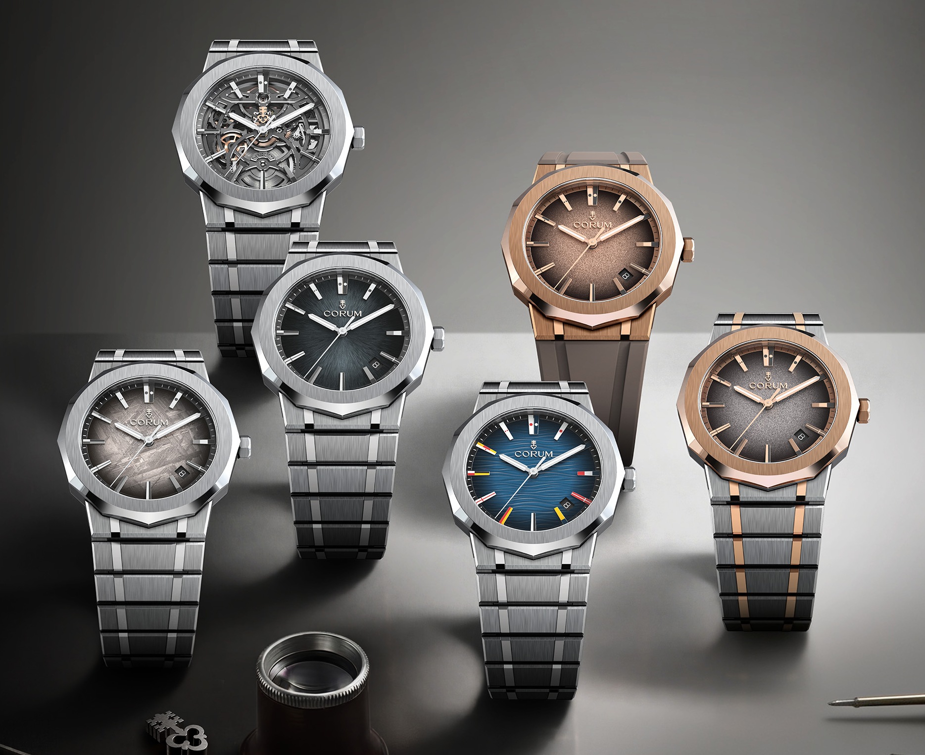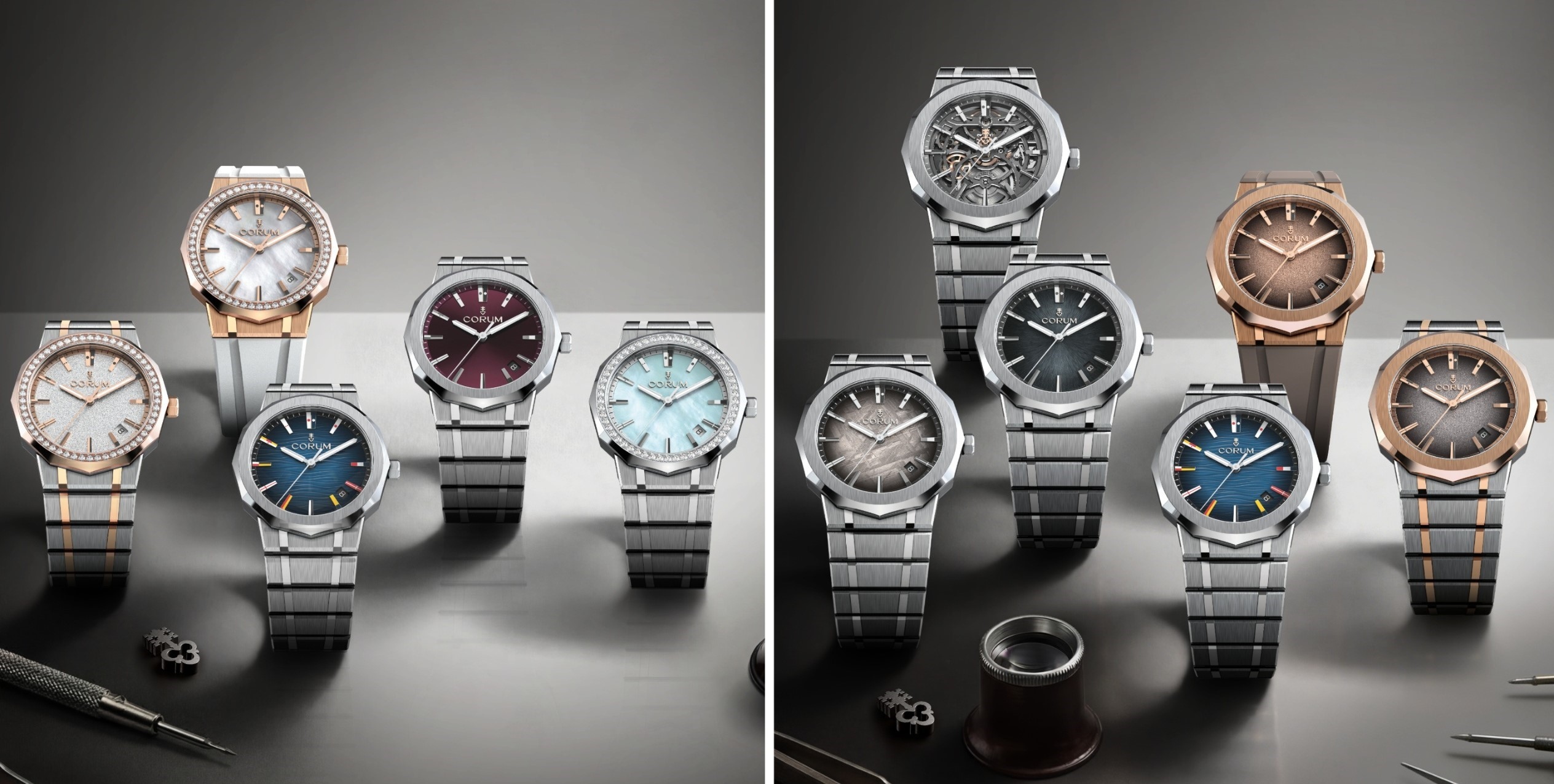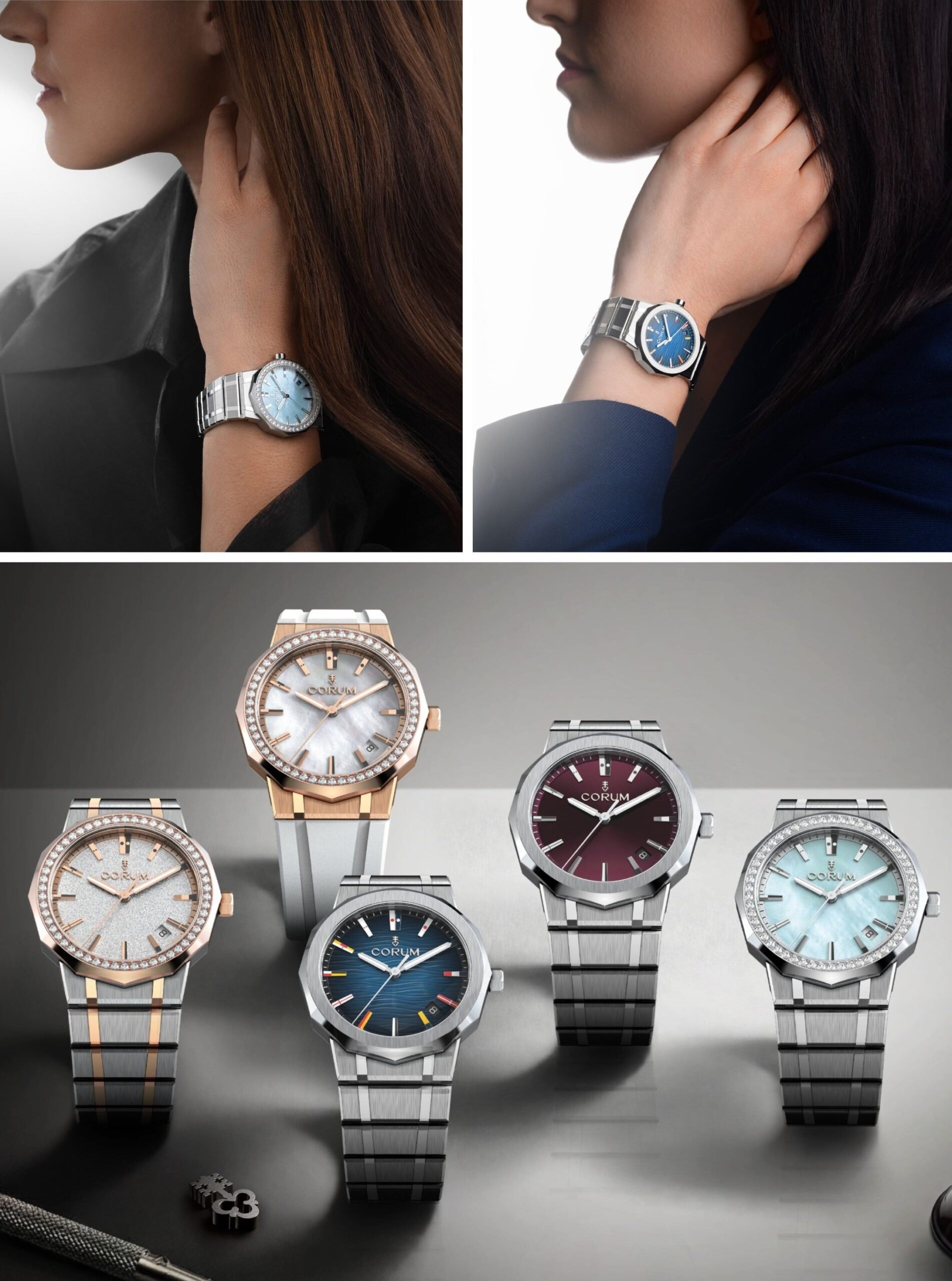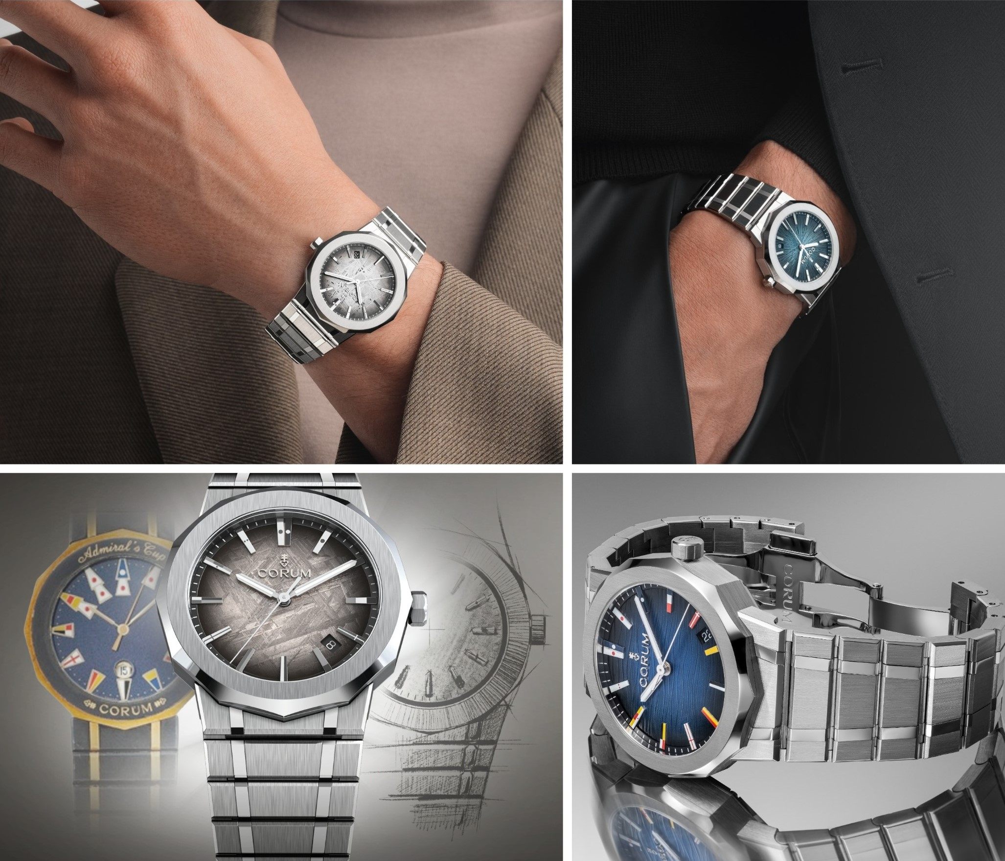 ăm 1960, phiên bản đầu tiên của dòng Admiral đã đặt nền móng cho thành công của Corum. Mẫu đồng hồ này duy trì sức hút bền bỉ nhờ bề dày lịch sử gắn liền mật thiết với các giải đua thuyền lớn cùng những thủy thủ danh tiếng, bằng ngôn ngữ thẩm mỹ không thể nhầm lẫn: vỏ 12 cạnh đặc trưng, mặt số điểm xuyết 12 cọc giờ hình cờ hiệu nhiều màu sắc và hình khắc cúp Admiral’s Cup trên mặt sau.Giờ đây, biểu tượng này trở lại dưới hình hài 11 phiên bản Admiral hoàn toàn mới, xoay quanh 5 nâng cấp trọng tâm: thiết kế vỏ được tái cấu trúc, mặt số mới, hệ thống cờ hiệu được làm lại, dây đeo tích hợp có thể thay thế linh hoạt, cùng 2 bộ máy nội bộ hoàn toàn mới. Lần lượt, Calibre CO231 và CO232, trang bị cho các mẫu Admiral 39mm cùng 36mm.