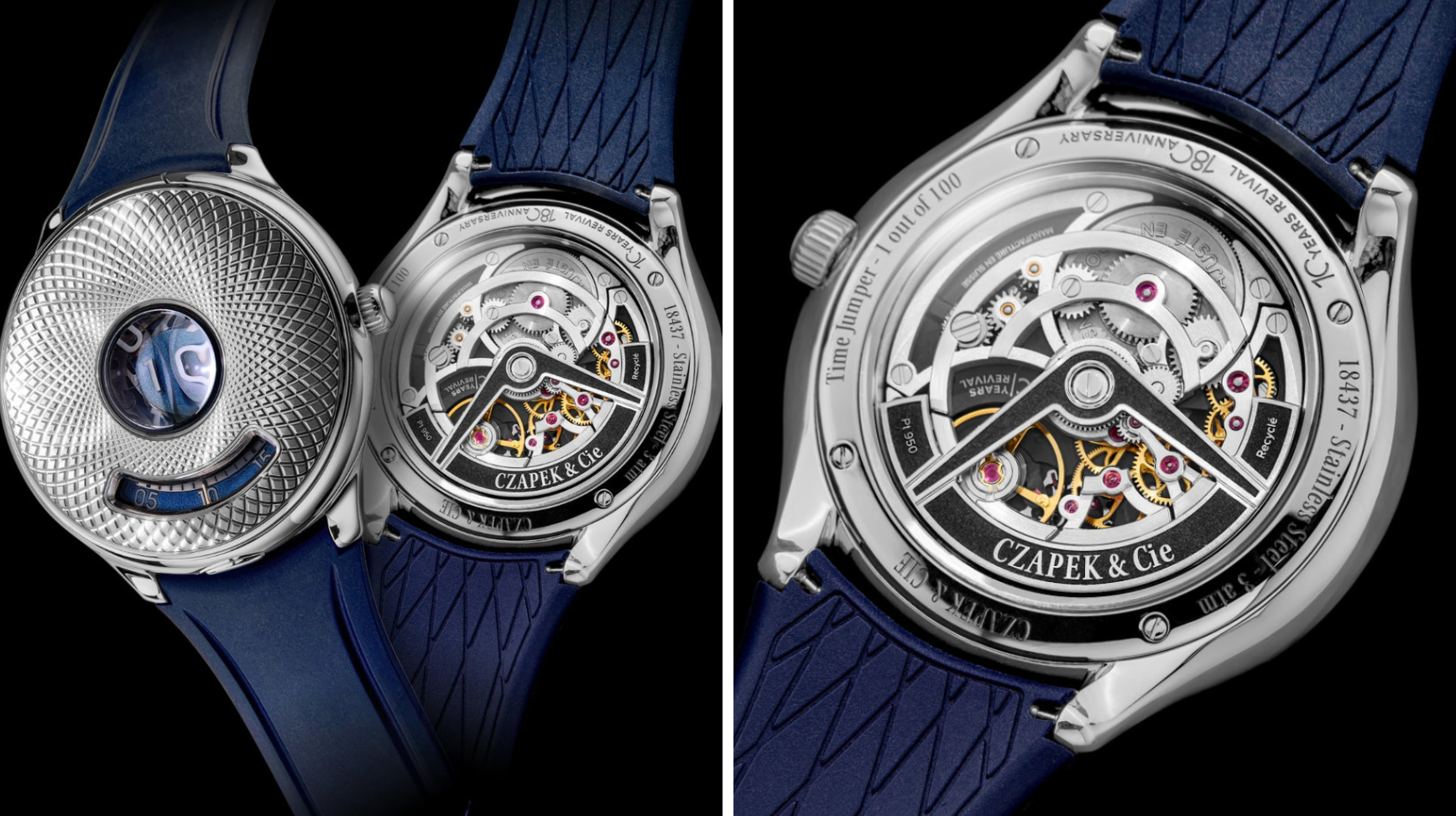 iện diện trong hai tùy chọn vỏ 40,5mm bằng thép không gỉ hoặc vàng 18K 3N mang dáng “phi thuyền bay” lần lượt giới hạn 100 và 30 chiếc, Time Jumper lưu dấu cột mốc 10 năm tái sinh với những thành công rực rỡ của Czapek. Một biến tấu táo bạo từ motif guilloché truyền thống thực hiện bởi đối tác lâu năm của – Metalem – trên nắp half-hunter tạo hiệu ứng như một “hố đen”, với ô kính phóng đại ở trung tâm khẽ hé lộ “trái tim” cơ học ẩn bên trong.