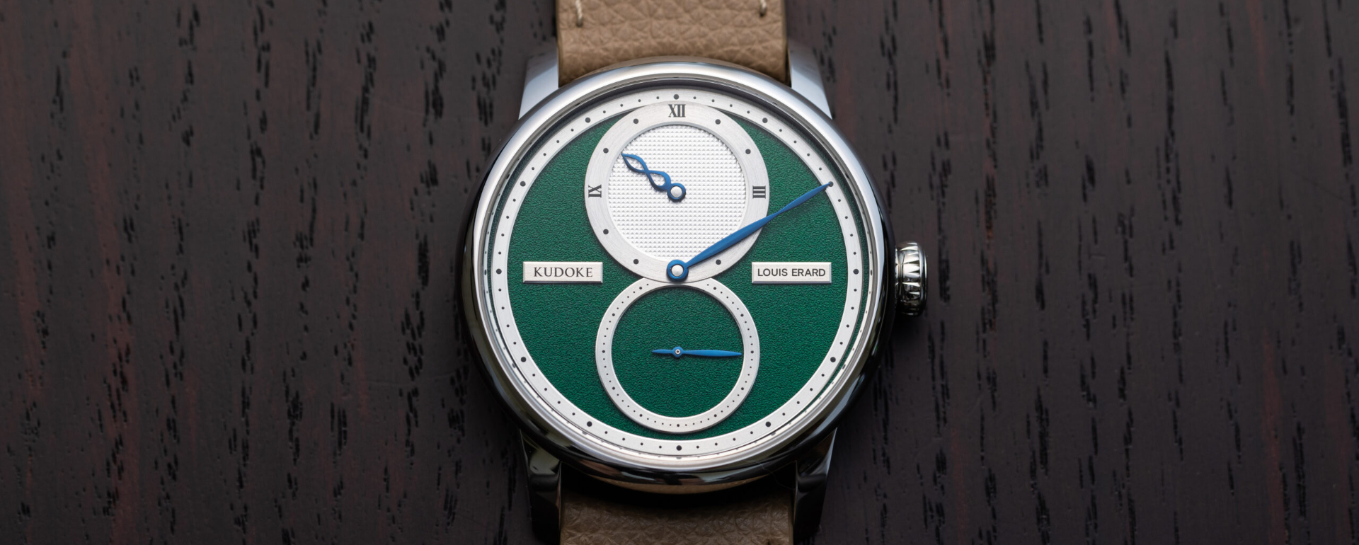 Vẻ đẹp cánh rừng xanh bạt ngàn được Louis Erard và Kudoke chắt lọc và kết tinh trên mặt số Le Régulateur Forest Green. Sắc xanh lục trầm với bề mặt vân hạt sâu lắng tái hiện trọn vẹn tinh thần của hai vùng chế tác đồng hồ cùng được kết nối bởi những cảnh quan thiên nhiên xanh đầy sức sống.