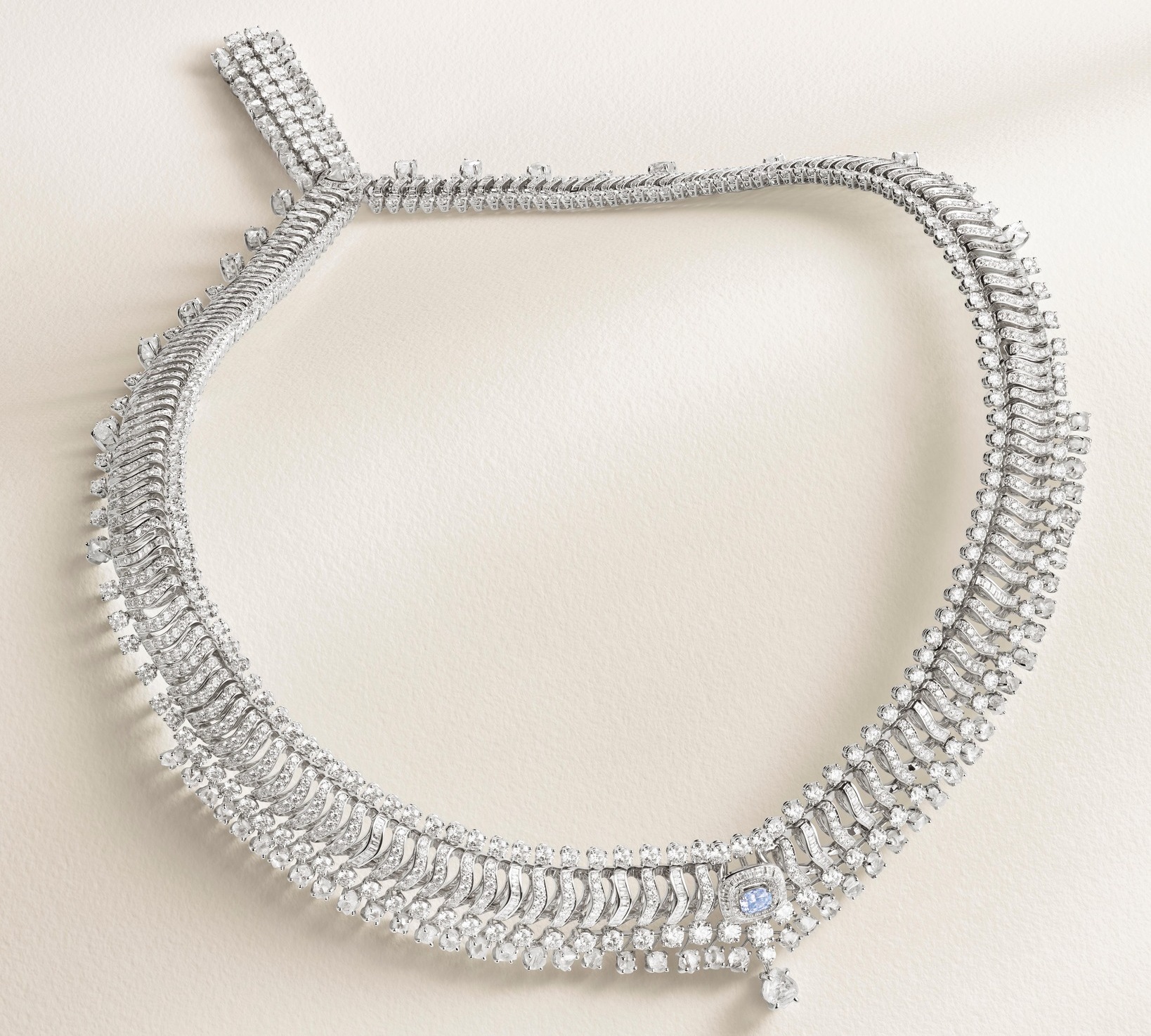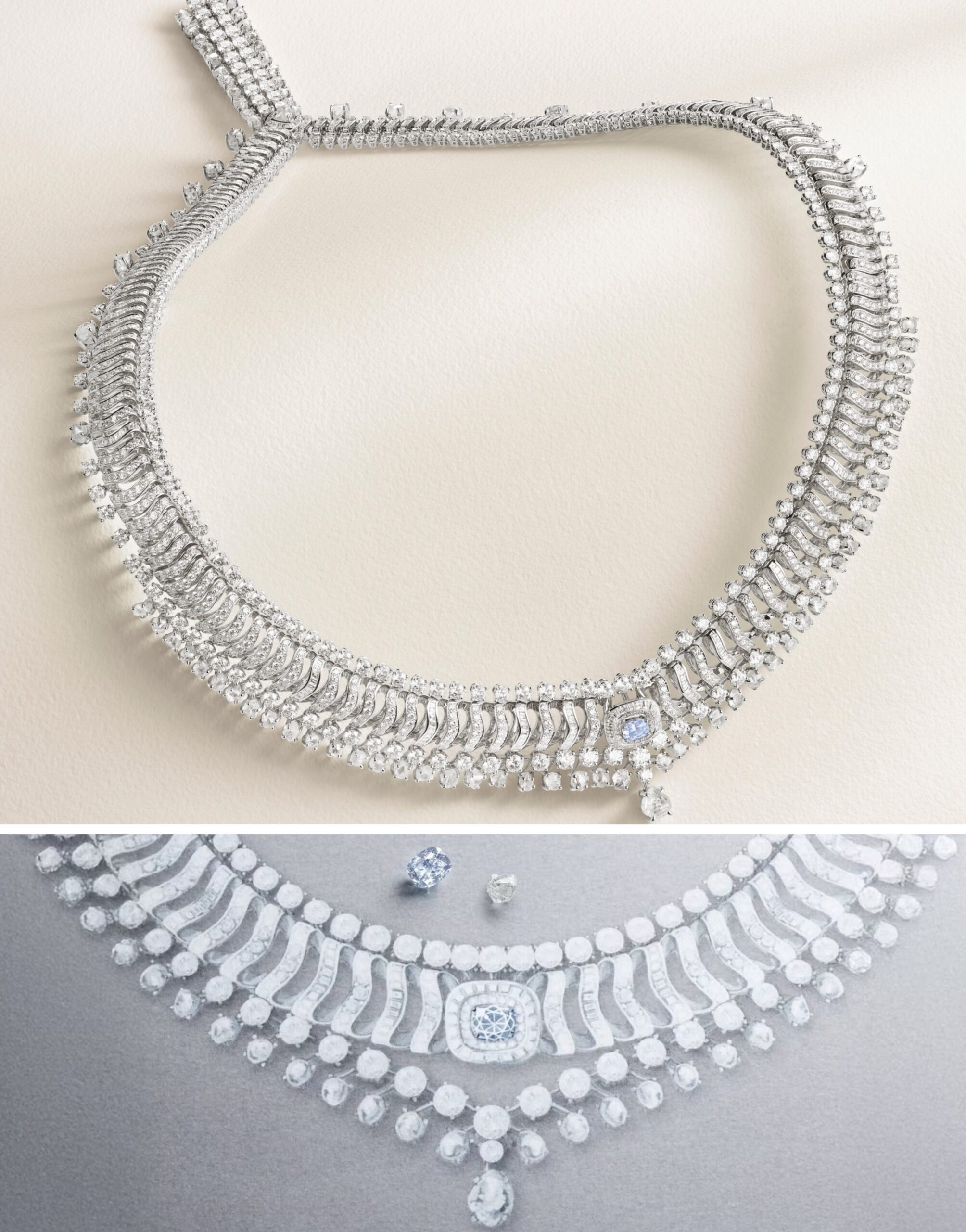 ấy cảm hứng từ hẻm núi Fish River Canyon tại Namibia, năm thiết kế độc bản thuộc chương Echo gợi lên những gợn sóng mềm mại lấp lánh lan tỏa trên mặt sông khi một viên sỏi được thả xuống dòng nước sâu. Tuyệt phẩm trung tâm của bộ sưu tập, Echo Necklace – sáng tạo phức tạp về mặt kỹ thuật nhất từng được De Beers London thực hiện – tôn vinh viên kim cương Fancy Intense Blue 1,12 carat đặc biệt thuộc bộ sưu tập Natural Works of Art. Được cấu trúc linh hoạt một cách tinh xảo để buông rủ quanh cổ như dòng sông uốn lượn qua hẻm núi, chiếc vòng cổ vượt qua mọi giới hạn của kỹ nghệ chế tác cùng thiết kế phi thường này có thể chuyển hóa thành sáu món trang sức độc bản, bao gồm vương miện, vòng tay và khuyên tai.