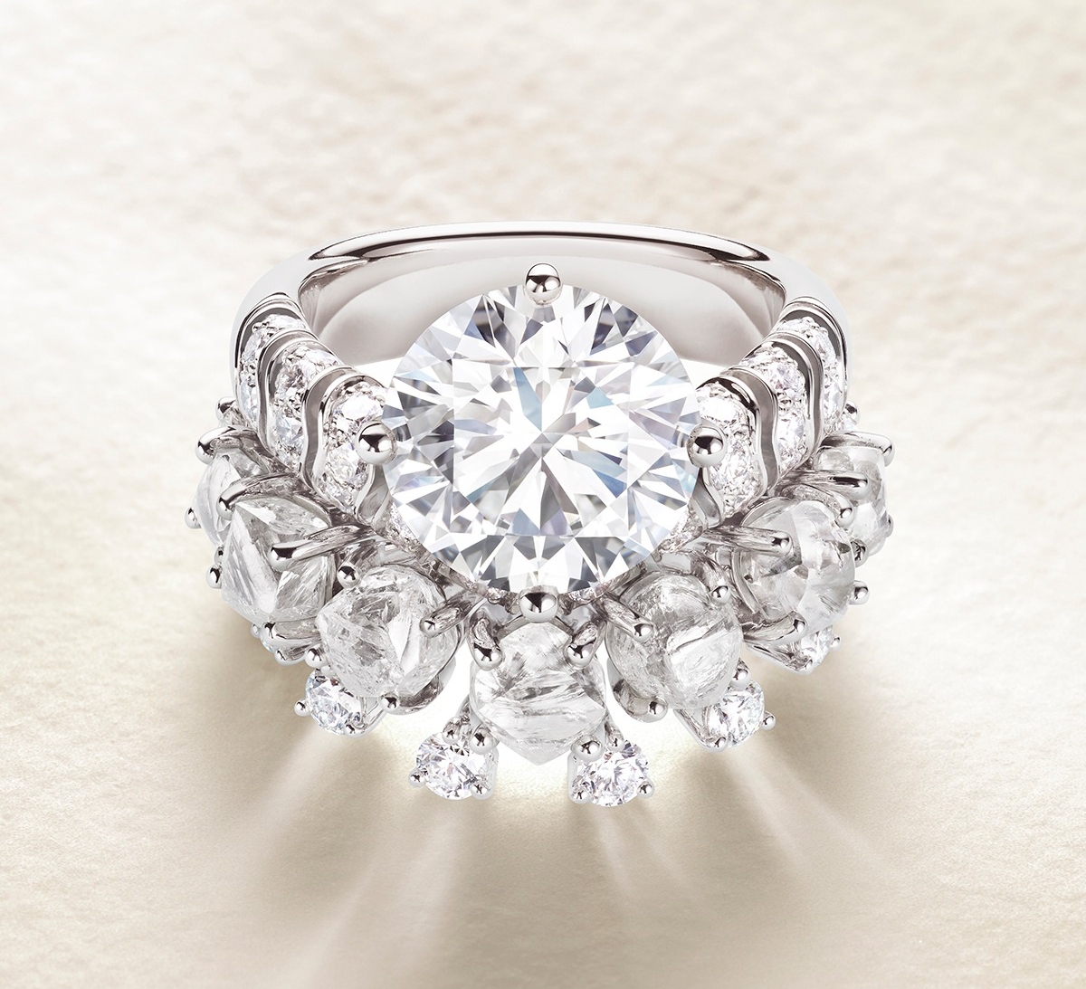 Trong khi đó, Echo Masterpiece Solitaire Ring mang ngôn ngữ thiết kế sóng nước đặc trưng bộ sưu tập. Đánh dấu lần đầu thương hiệu kim hoàn giới thiệu những viên kim cương đặc biệt này trong bộ sưu tập High Jewellery, chiếc nhẫn kết hợp viên kim cương 5,21 carat D-Flawless với những viên kim cương thô trắng hiếm có, được nước mài giũa và khai thác từ các lòng sông cổ xưa.