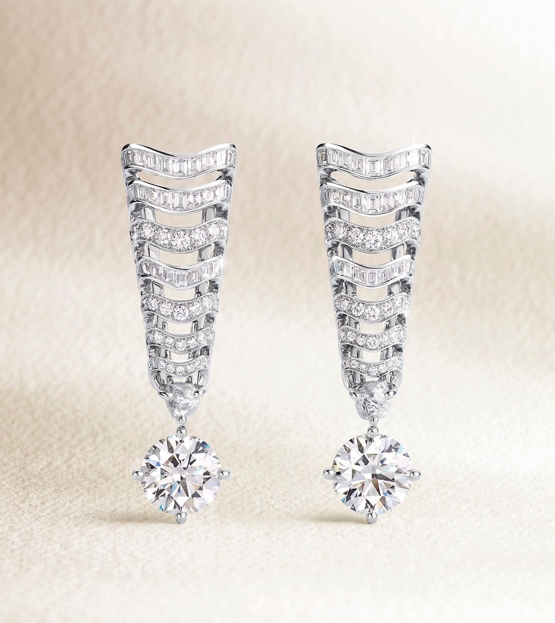 Và, Echo Drop Earrings gợi nhắc tinh tế những gợn sóng nước dịu dàng qua họa tiết lặp đặc trưng. Tái diễn giải các motif lặp lại từ chiếc Masterpiece Necklace, thiết kế nổi bật ở mỗi đầu một viên kim cương thô và một viên kim cương cắt brilliant trên ba carat tái diễn giải hành trình chuyển hóa của những viên đá quý độc bản – từ trạng thái nguyên sơ đến vẻ rực rỡ hoàn thiện.