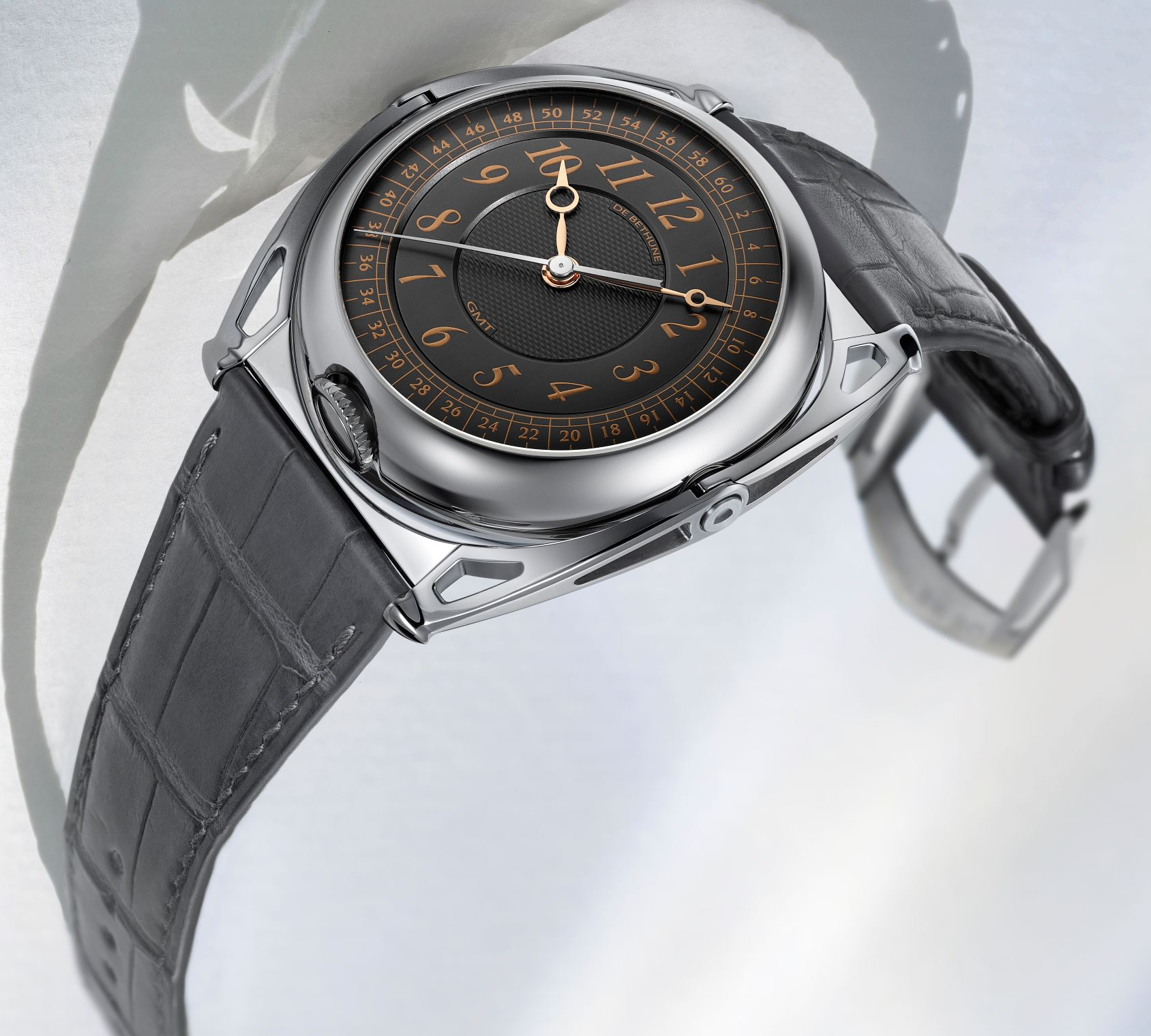 Khoác vỏ titan loại 5 đường kính chỉ 43,3mm, chiếc đồng hồ toát lên cảm giác khối và chiều sâu, tích hợp cả hai complication GMT cùng kim giây nhảy, nổi bật hai bánh răng vàng ngụ trung tâm. Trong khi đó, cầu nối titanium hình deltoid, chế tác nhiều tầng và đặt chính giữa, góp phần tăng cường độ ổn định cùng sự hài hòa tổng thể.