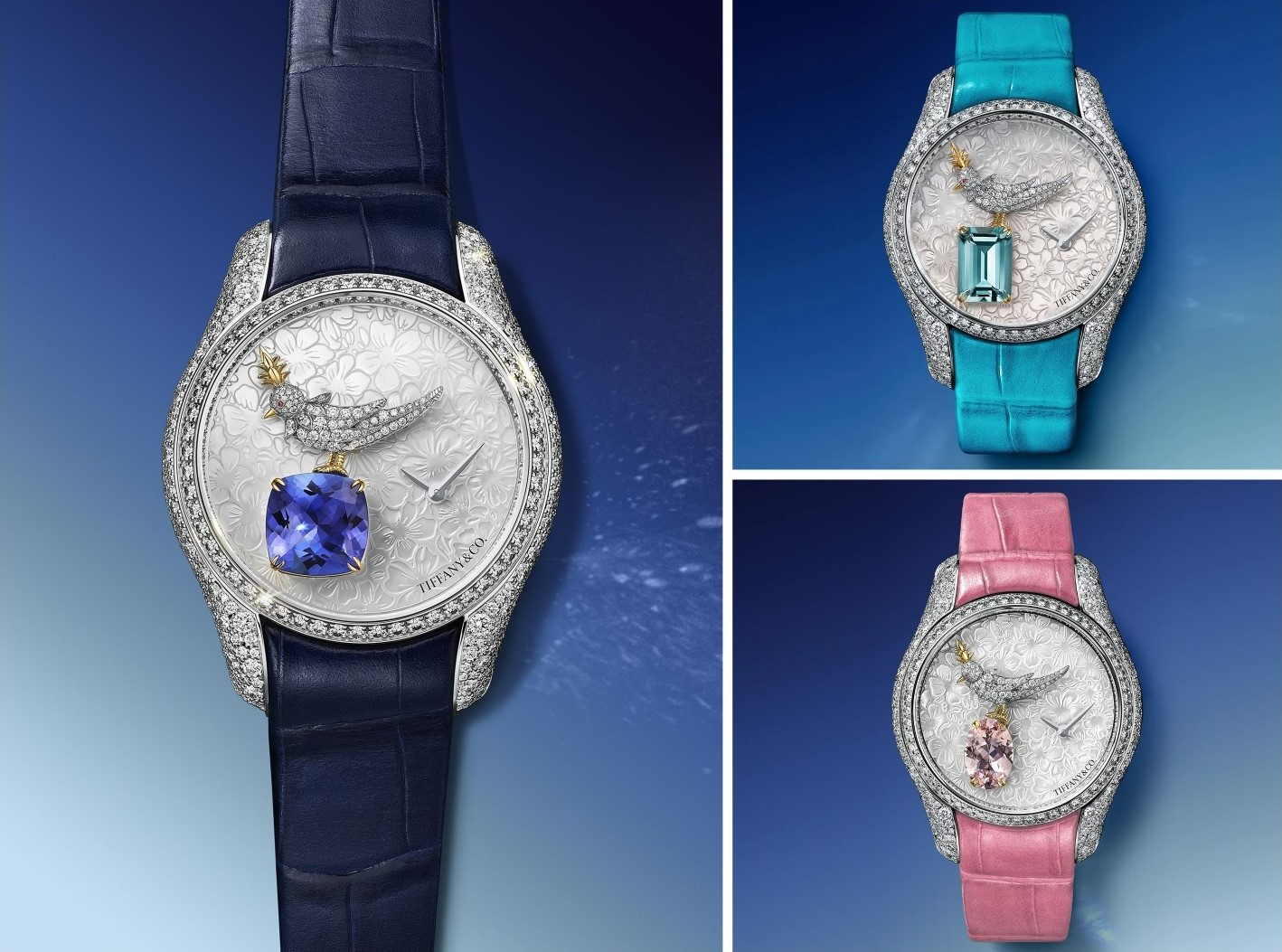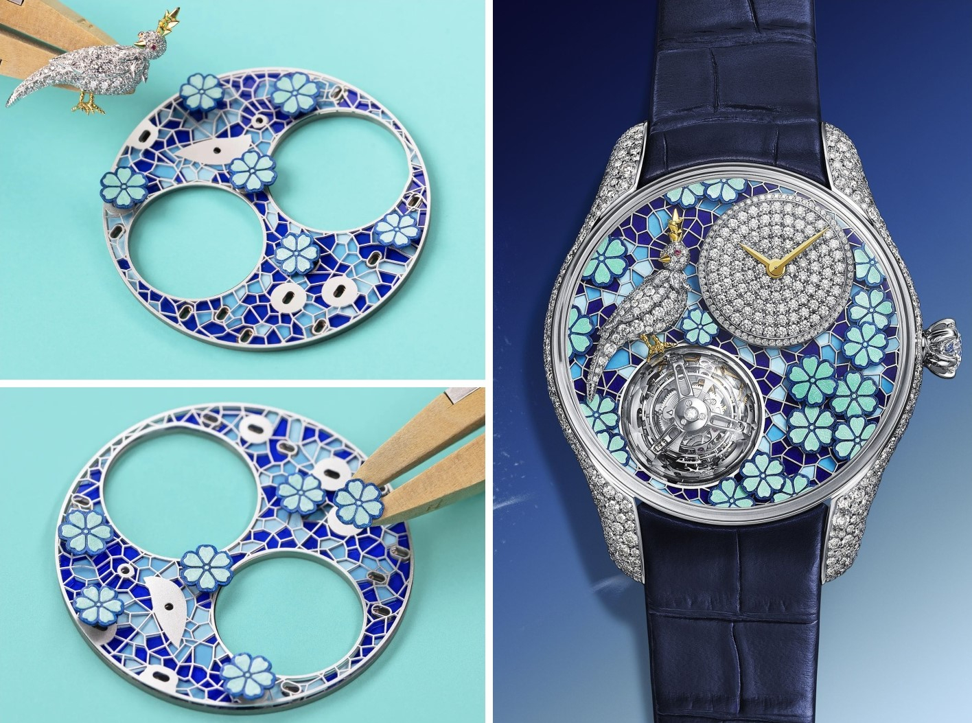 Tiếp nối, Bird on a Flying Tourbillon Azure Blossom mở ra một chương mới cho haute horlogerie: mái vòm sapphire siêu mỏng, được cắt đa giác như một viên kim cương khổng lồ, phản chiếu từng chuyển động của tourbillon bay. Từng chi tiết – từ men champlevé, sơn mài, điêu khắc vàng đến chạm khảm kim cương – đều phô diễn trình độ nghệ thuật đỉnh cao của Tiffany.