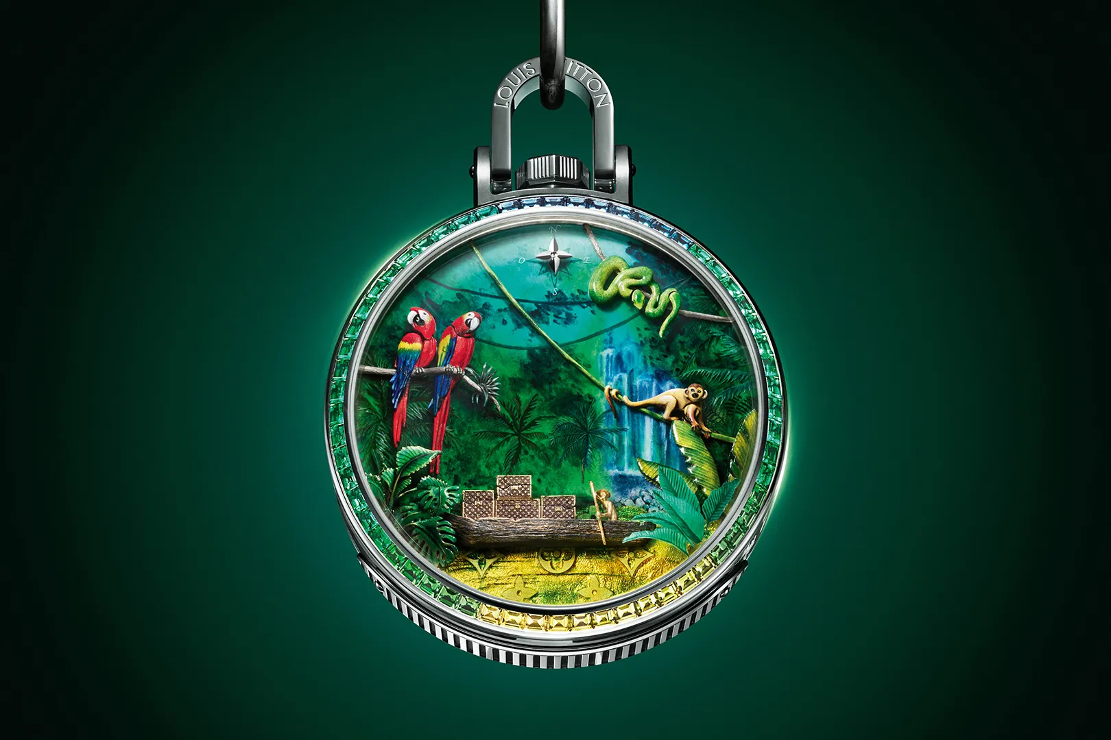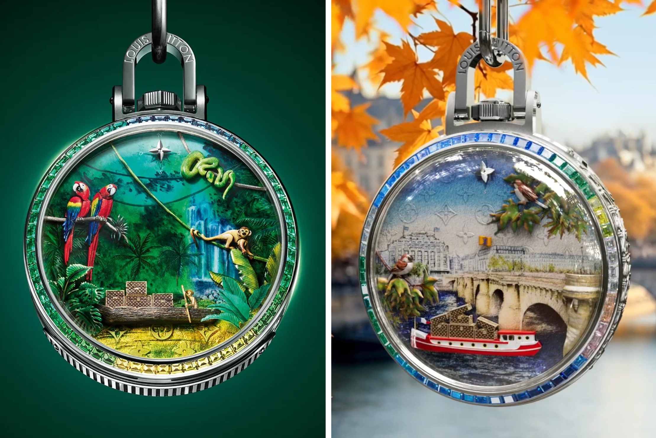 Trong phiên bản Escale en Amazonie, dòng sông, rừng rậm, vượn và chim rực rỡ chuyển động qua cơ cấu cơ học tinh vi, còn Escale au Pont-Neuf đưa người đeo về Paris lãng mạn, nơi bầy chim sẻ bay ngang cầu cổ và những rương hành lý mở ra hoa văn Monogram vàng rực. Bao quanh là vòng bezel nạm sapphire, tourmaline và tsavorite, rực rỡ như bức khảm đá của một giấc mơ. Ở Louis Vuitton, mỗi viên đá là dấu ấn du hành, gợi nhắc tinh thần khám phá đã định nghĩa Maison từ thế kỷ 19.