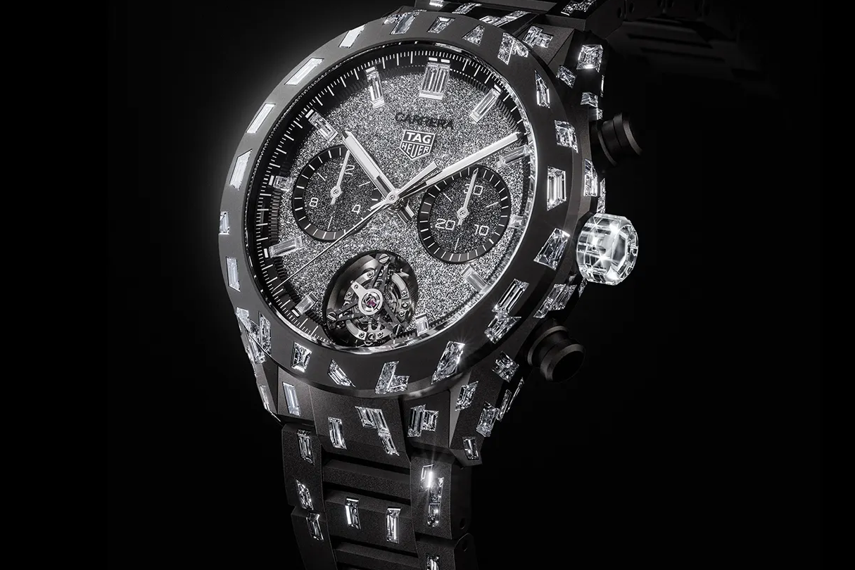 Nếu Tiffany kể chuyện bằng biểu tượng, Louis Vuitton bằng di sản, thì TAG Heuer viết nên chương mới bằng công nghệ tiên phong. Dòng Carrera Plasma Diamant d’Avant-Garde sử dụng kim cương nhân tạo với kiểu cắt khiên (Shield Cut) lấy cảm hứng từ logo biểu tượng của thương hiệu. Trên mẫu Carrera Plasma Chronograph Tourbillon 44mm, mặt số cấu thành từ tấm kim cương polycrystalline, kết hợp hàng trăm tinh thể thành một cấu trúc đơn nhất.