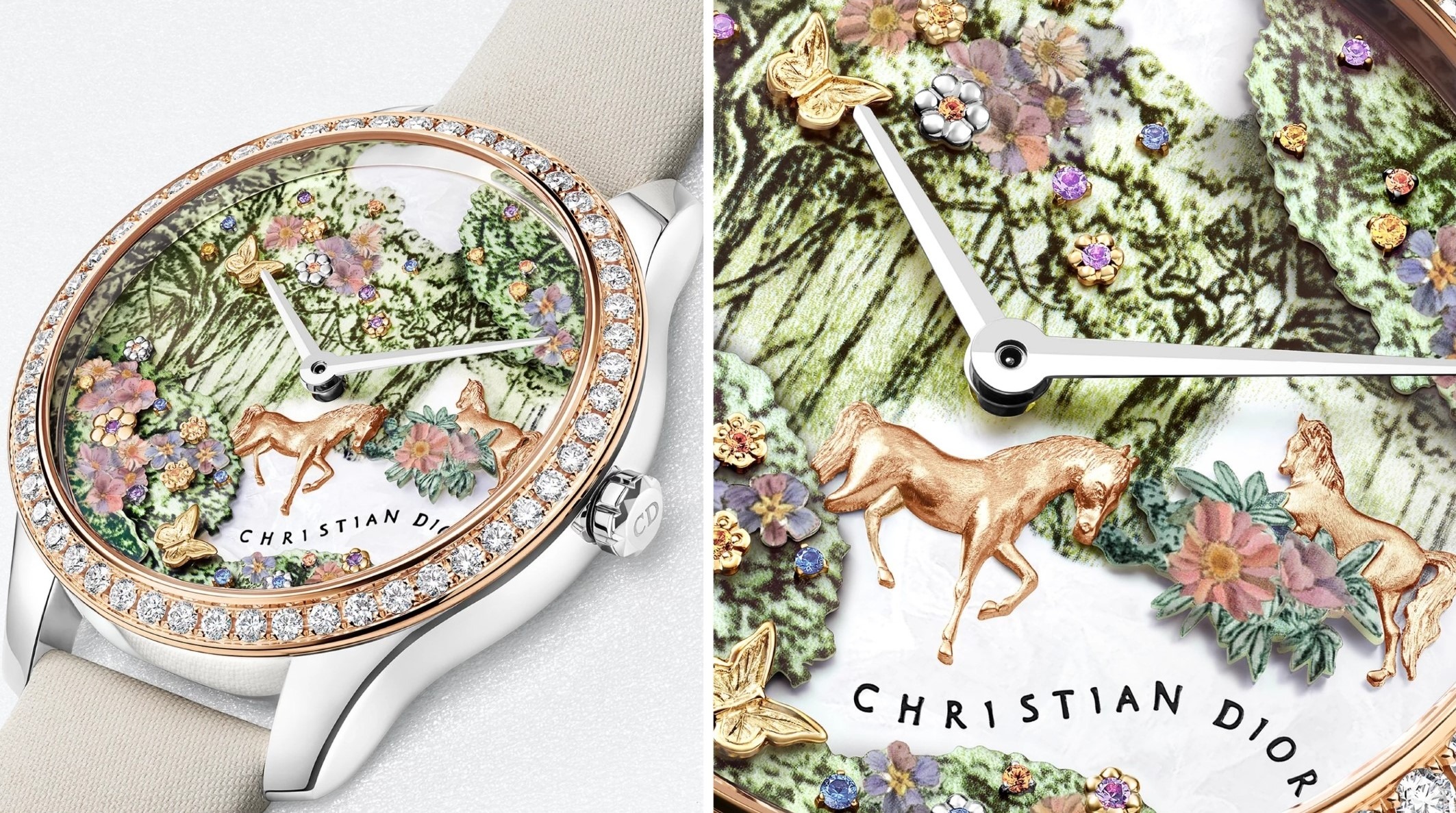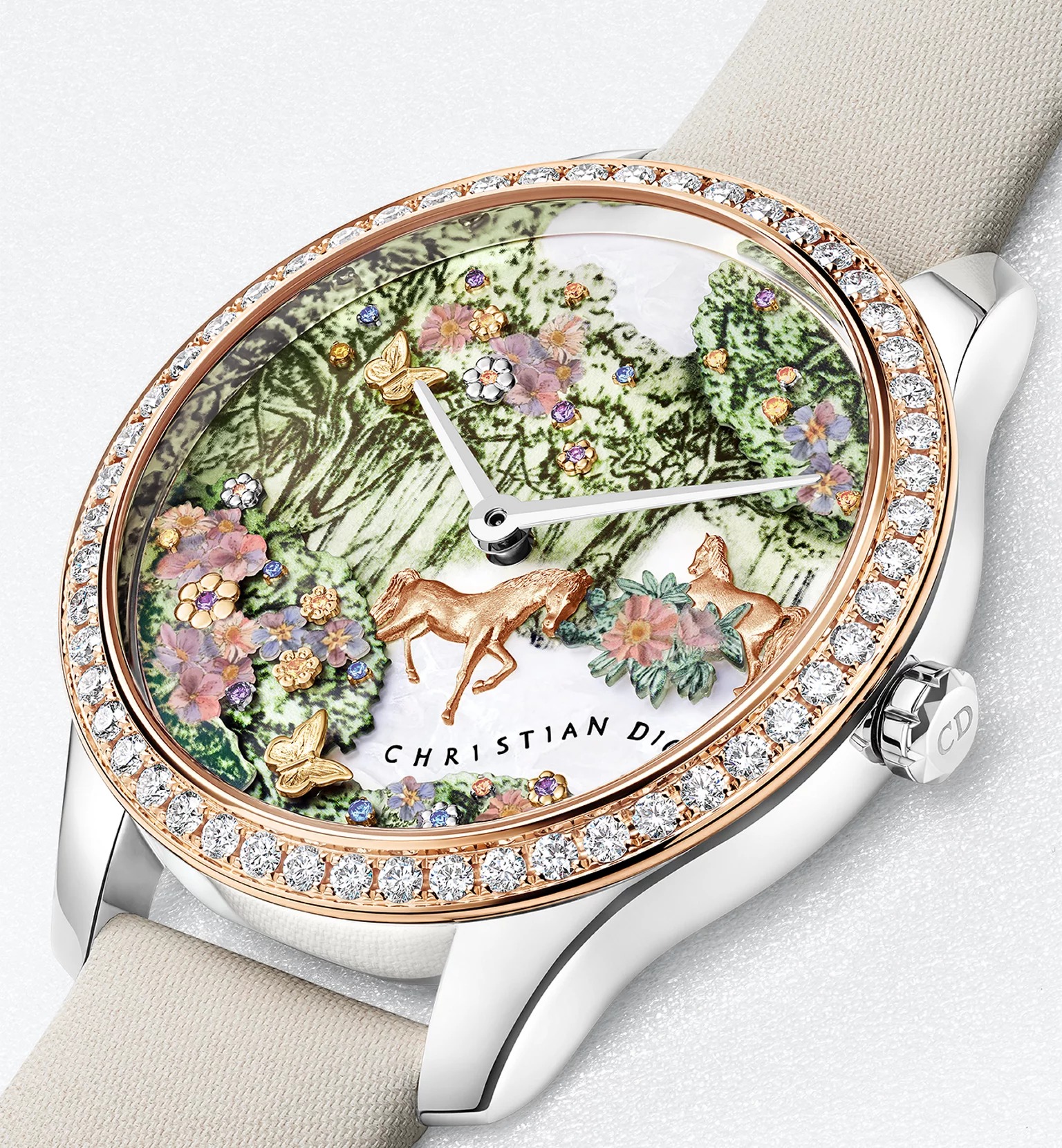 rand Soir Collection cung cấp cho đội ngũ thợ đồng hồ sở hữu tâm hồn lãng mạn Dior không gian sáng tạo lý tưởng. Ở đó, thời gian được diễn giải bằng ngôn ngữ trang sức dung hòa cùng tinh thần haute couture. Mỗi thiết kế đều được tiếp cận như một tác phẩm nghệ thuật thu nhỏ, nơi kỹ thuật chế tác đồng hồ gặp gỡ nghệ thuật trang trí thủ công bậc thầy: chạm khắc, vẽ tiểu họa cùng nạm đá quý.Kế thừa tinh hoa bộ sưu tập, tân thành viên Grand Soir Year Of The Horse ra đời như một sáng tạo đặc biệt nhân dịp Tết Nguyên Đán gần kề, tôn vinh biểu tượng Ngọ thông qua nghệ thuật trang trí mặt số tinh xảo. Trong đường kính 36mm, mẫu đồng hồ thép tiếp nối niềm đam mê lâu dài của thương hiệu nước Pháp với các chủ đề văn hóa và chiêm tinh, được thể hiện bằng kỹ thuật tiểu họa tinh xảo cùng nạm đá quý tinh tế.