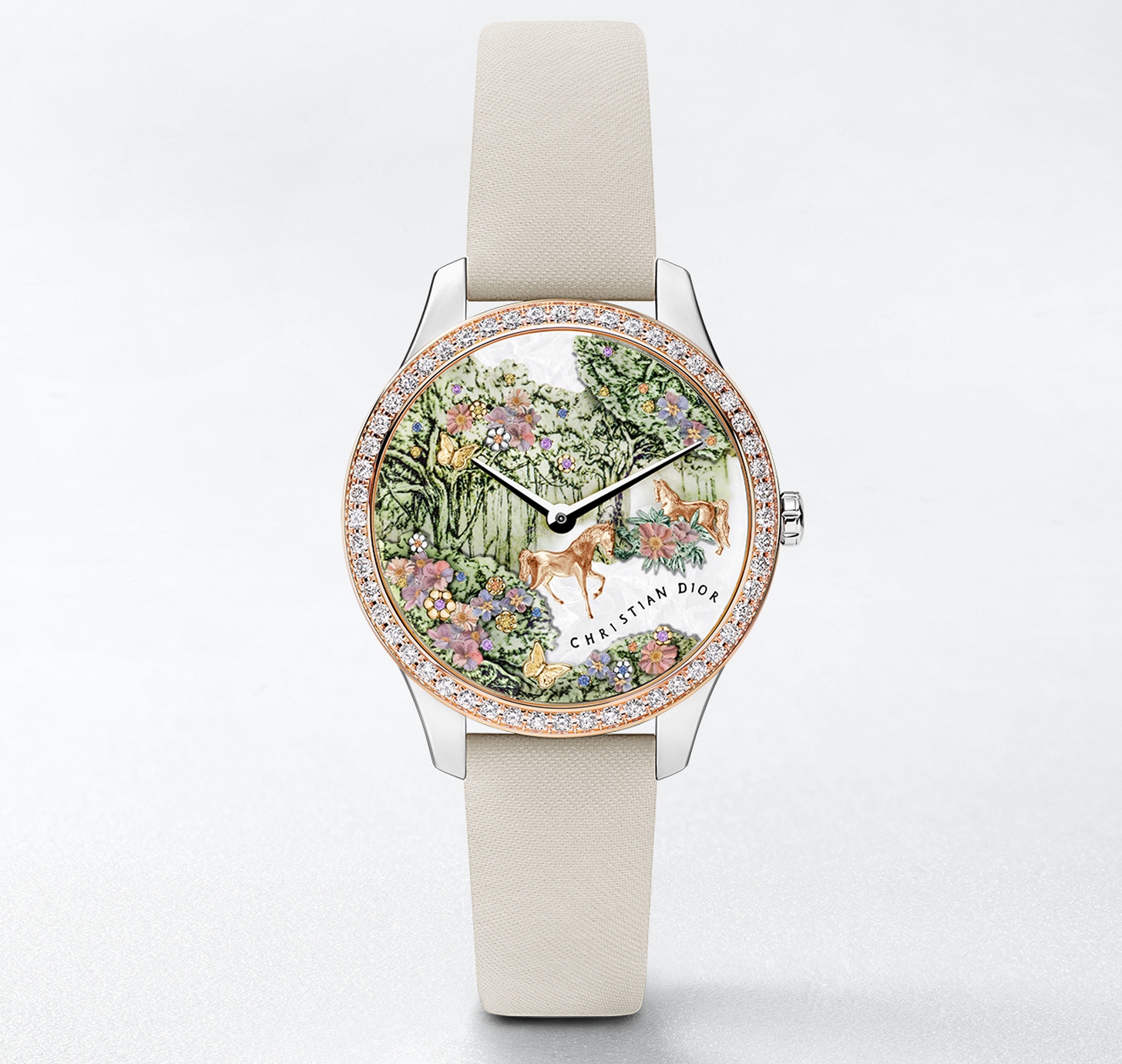 Giới hạn 30 chiếc, Dior Grand Soir Year of the Horse trở thành tuyên ngôn thẩm mỹ trên cổ tay quý cô yêu thích sự giao thoa giữa văn hóa, nghệ thuật cùng kỹ nghệ chế tác đồng hồ cao cấp. Trên mặt số xà cừ trắng điểm họa tiết Toile de Jouy gợi nhắc phong cách đồng quê bình yên với hoa cỏ khoe sắc cùng hai chú ngựa vàng hồng, từng giờ, phút trôi theo nhịp chính xác dưới sự vận hành của SW300 Calibre.