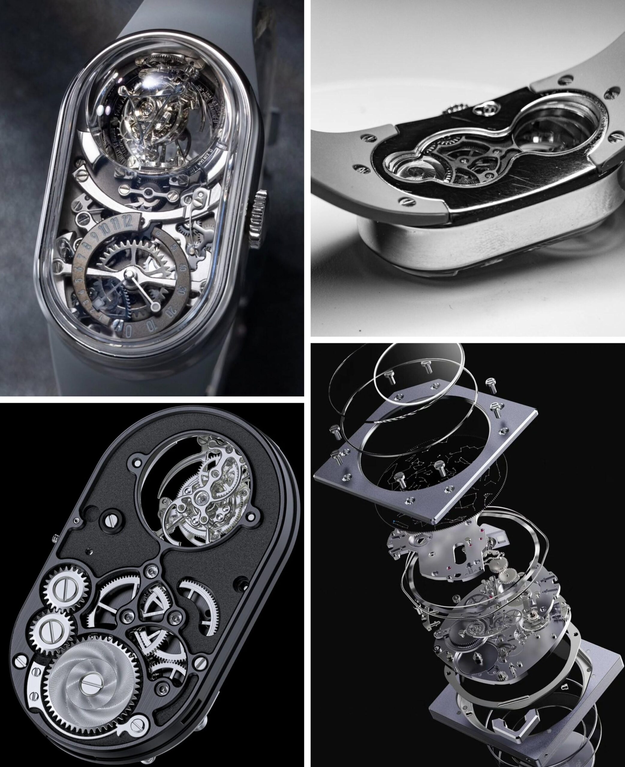 Ẩn mình bên trong “bộ giáp” cải tiến ấy, Calibre M01T – bộ máy lên dây cót tay phát triển hoàn toàn nội bộ gồm 297 chi tiết, yêu cầu hơn 200 giờ hoàn thiện thủ công. Dao động ở tần số 3Hz và trữ 50 giờ năng lượng, “trái tim cơ học” sở hữu thiết kế gồm hai khu vực chức năng đối xứng. Theo đó, tourbillon hai trục bên trái lấy cảm hứng từ dải Möbius bằng hợp kim titan, lần lượt hoàn thành vòng xoay trong 60 và 90 giây, tạo nên nhịp chuyển động như vũ điệu ánh sáng trong không gian vô tận. Ngụ bên phải, cụm hiển thị giờ, phút retrograde trên hai cung xoắn. Mỗi khi kết thúc chu kỳ, kim bật trở lại điểm đầu bằng chuyển động dứt khoát, tái hiện khoảnh khắc “tái sinh” của thời gian. Được đặt trên nền phiến nền hoàn thiện gõ búa tạo hiệu ứng sương giá, toàn bộ cấu trúc phô diễn trọn vẹn vẻ đẹp nhờ thiết kế mở ngoạn mục.