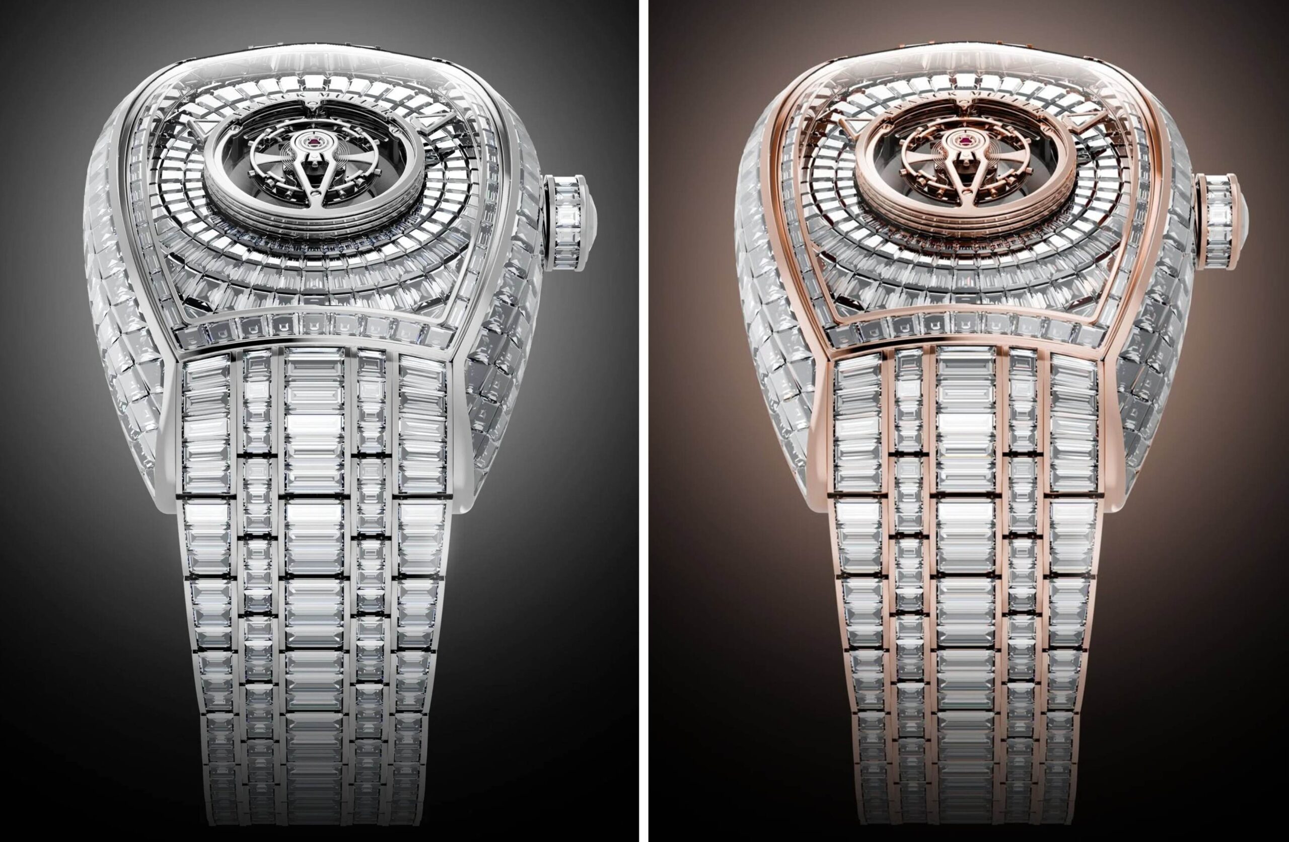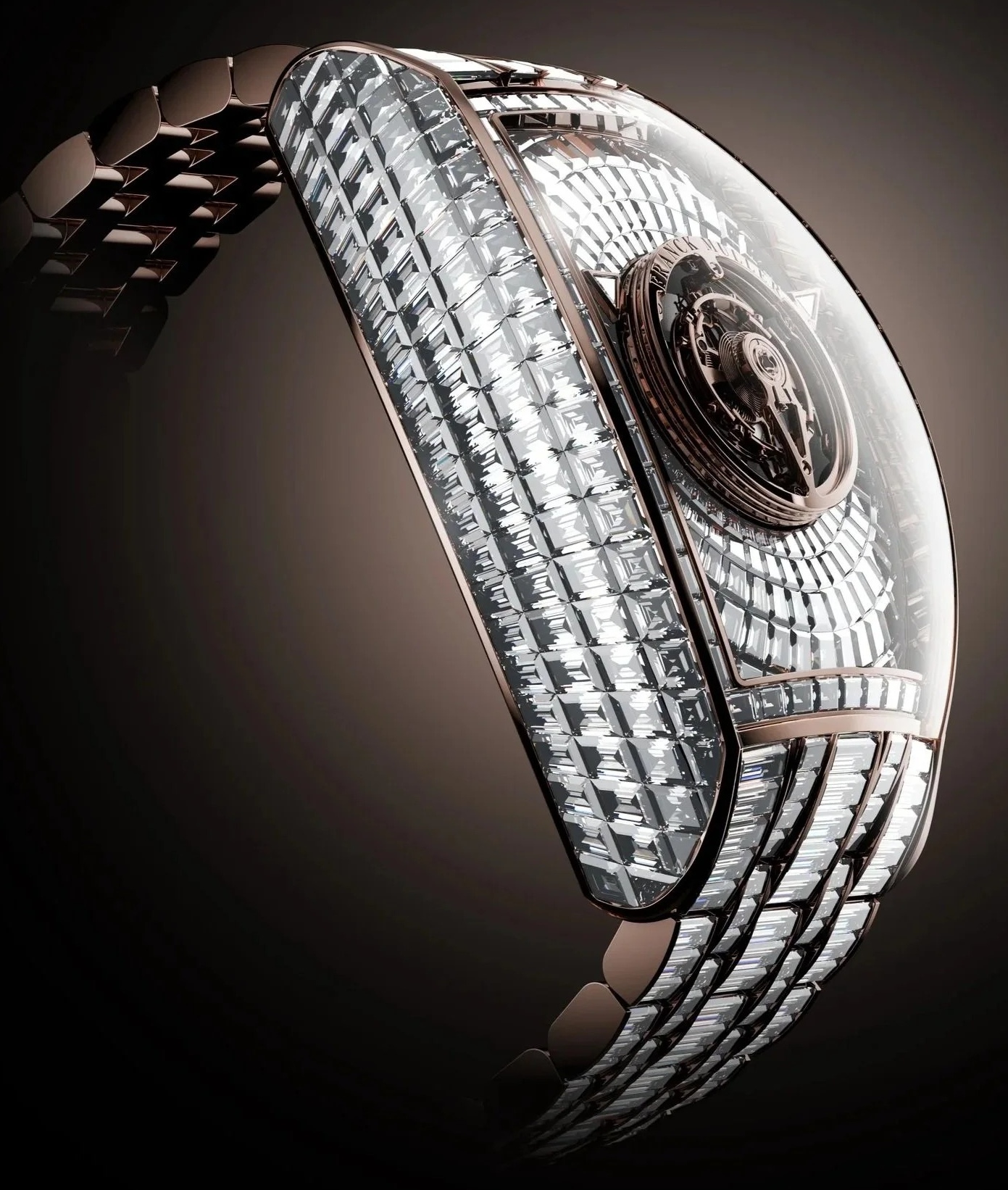 ang dáng hình điêu khắc dễ nhận diện với những đường cong biểu trưng, Curvex CX Grand Central Tourbillon Baguette đạt tỷ lệ cân đối hoàn hảo, vừa đậm chất kiến trúc vừa gợi cảm. Trong phiên bản rực rỡ này, phom dáng vỏ Curvex vàng hồng hoặc vàng trắng 36 x 58,1mm biến thành một “bức tranh ánh sáng” nhờ kỹ thuật nạm đá vô hình xuất sắc. Toàn bộ 778 viên kim cương baguette-cut, tổng trọng lượng 49,79 carat, được đội ngũ nghệ nhân bậc thầy nạm tay tỉ mỉ với độ chính xác tuyệt đối. Khi ánh sáng lướt qua bề mặt, tổ hợp đá quý bừng sáng, tạo nên vũ điệu phản chiếu huyền diệu, tôn vinh trọn vẹn ngôn ngữ điêu khắc của chiếc đồng hồ.
