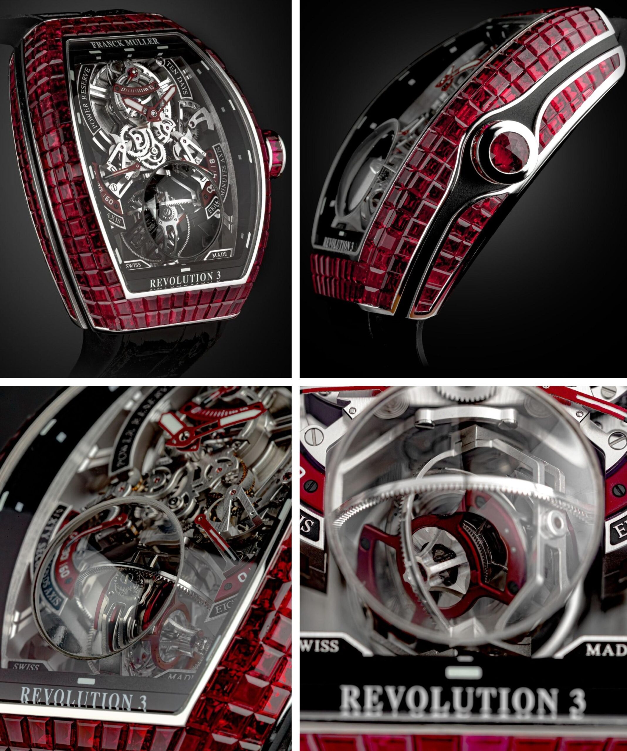Sự kiện đặc biệt này được Franck Muller đánh dấu bằng màn ra mắt Vanguard Revolution 3 Skeleton. Kiệt tác độc bản hữu tourbillon ba trục skeleton đầu tiên trên thế giới cùng mức dự trữ năng lượng ấn tượng lên đến 10 ngày, đại diện cho đỉnh cao Haute Horlogerie đương đại. Điểm xuyết tổ hợp ruby baguette bằng kỹ thuật nạm vô hình biểu tượng, “cỗ máy thời gian” tỏa sáng rực rỡ, phô diễn trọn vẹn vẻ đẹp học cùng nghệ thuật chế tác bậc thầy từ mọi góc nhìn.