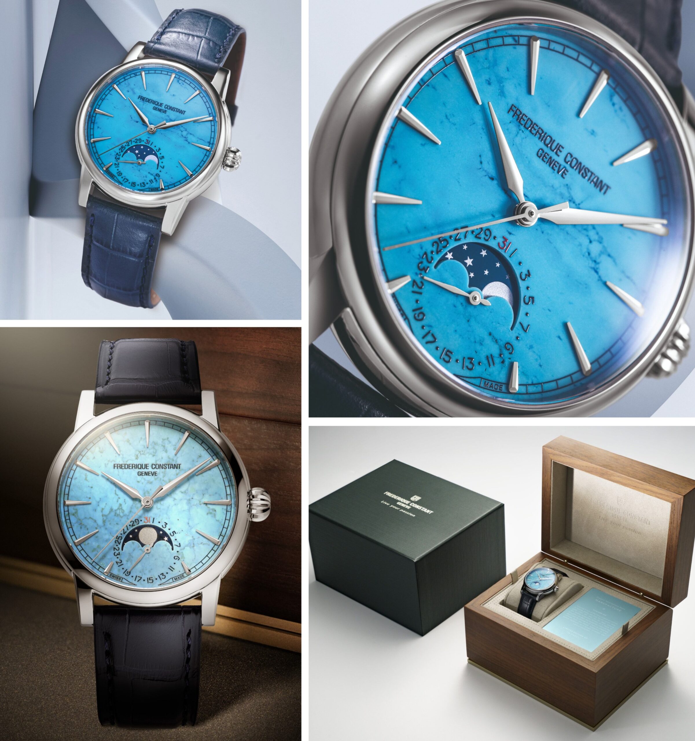 Biểu tượng của sự bảo vệ, trí tuệ và tĩnh tại, turquoise là một trong những loại đá quý được trân trọng nhất trong lịch sử, không chỉ bởi sắc xanh lam – xanh lục rực rỡ mà còn nhờ những giá trị tâm linh và khả năng chữa lành. Lần đầu tiên trong lịch sử thương hiệu, Frederique Constant ứng dụng turquoise trên mẫu đồng hồ Classic Moonphase Date Manufacture. Đá được nhận diện bởi những sợi khoáng chất đen chạy xuyên qua bề mặt, tạo nên các vân tự nhiên như đá cẩm thạch. Giới hạn 716 chiếc toàn cầu, cỗ máy thời gian thép 40mm duy trì hoạt động dưới sự hỗ trợ của Calibre FC-716 in-house dự trữ 72 giờ năng lượng.