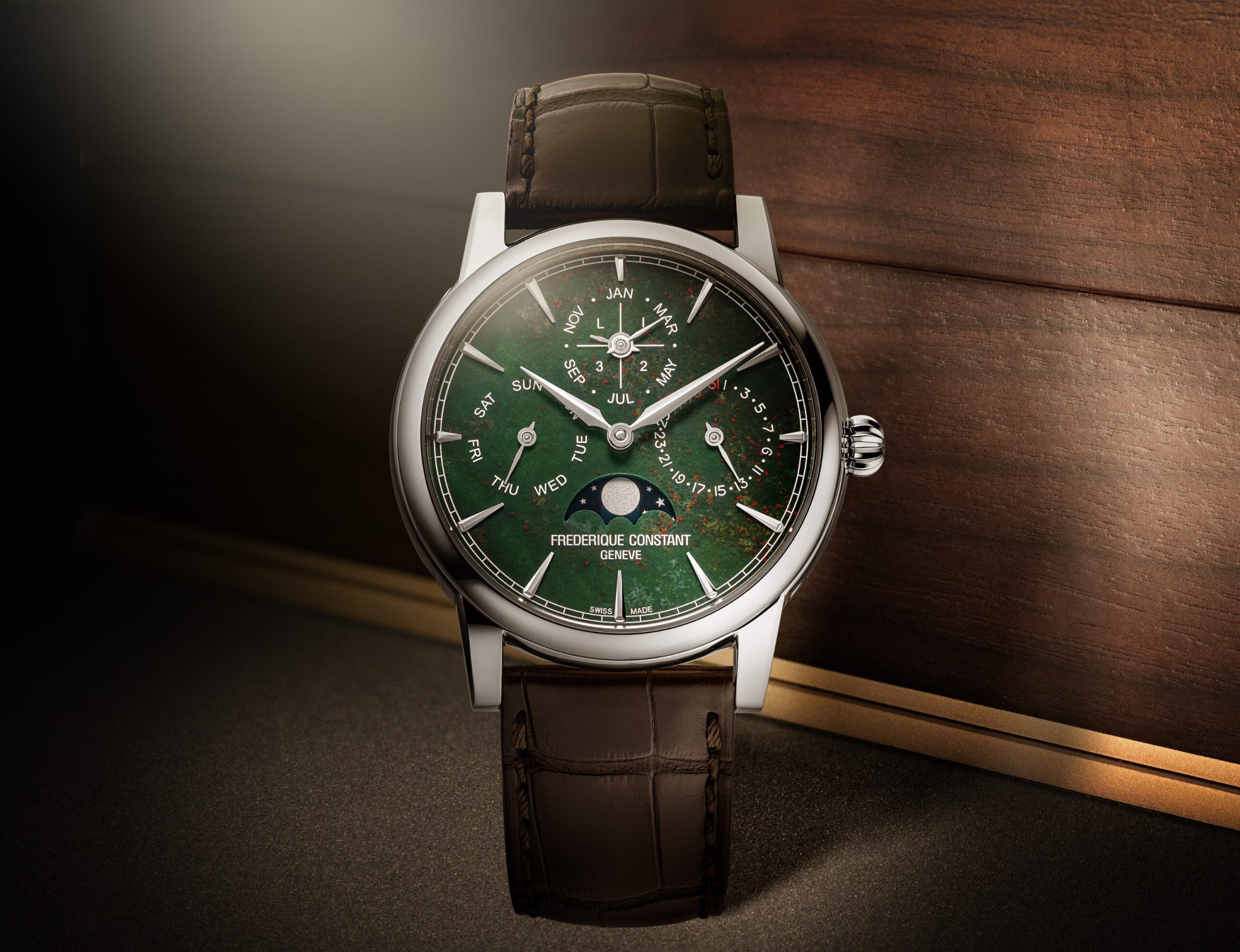 Giới hạn 37 chiếc toàn cầu, Classic Perpetual Calendar Manufacture sở hữu vỏ thép 40mm viền quanh mặt số heliotrope. Loại đá này chứa hàm lượng cao aluminium, sắt và kali, mỗi thành phần tạo nên vô số vân khoáng thanh thoát bên trong cấu trúc đá. Trên nền chất liệu đặc trưng ấy, Frederique Constant diễn giải một cách khoa học và dễ đọc của bố cục lịch vạn niên trứ danh của mình.